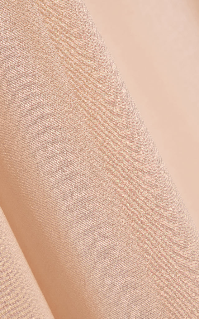 Nude silk crepe georgette falls in sculpted softness. The top traces the body with a horizontally pintucked bodice and fine straps, fastening with covered buttons before loosening into a flared hem. Paired with balloon pants cut wide and fluid, the silhouette holds discipline above, release below.