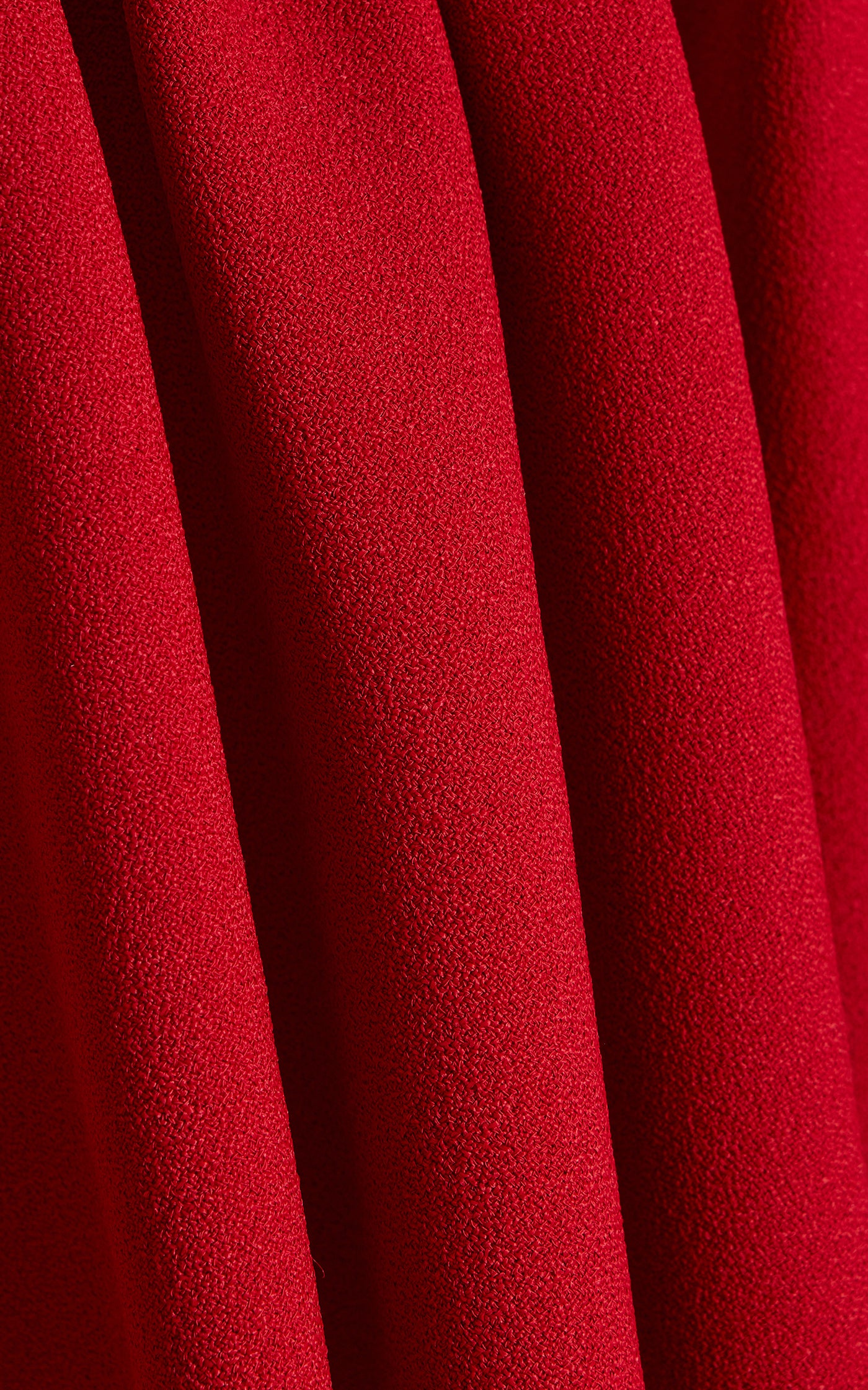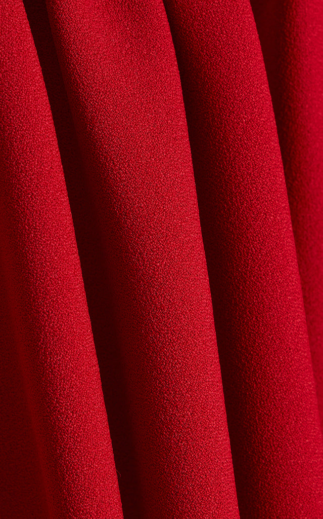 Chiara burns in ceremonial red, sculpted in double crepe that clings close to the frame before releasing into silk georgette pleats at the hips. The form releases into a mermaid silhouette, sheer to the floor and drawn into a sweeping train. An open back sharpens its allure, a study in structure and seduction.