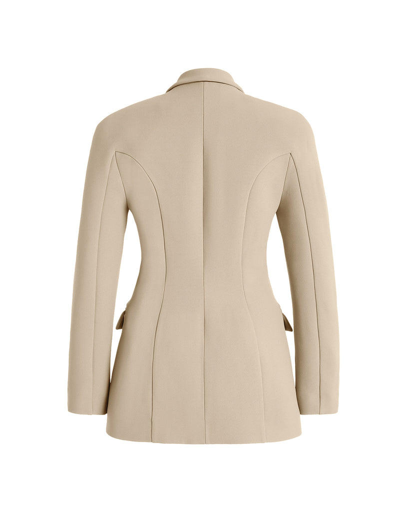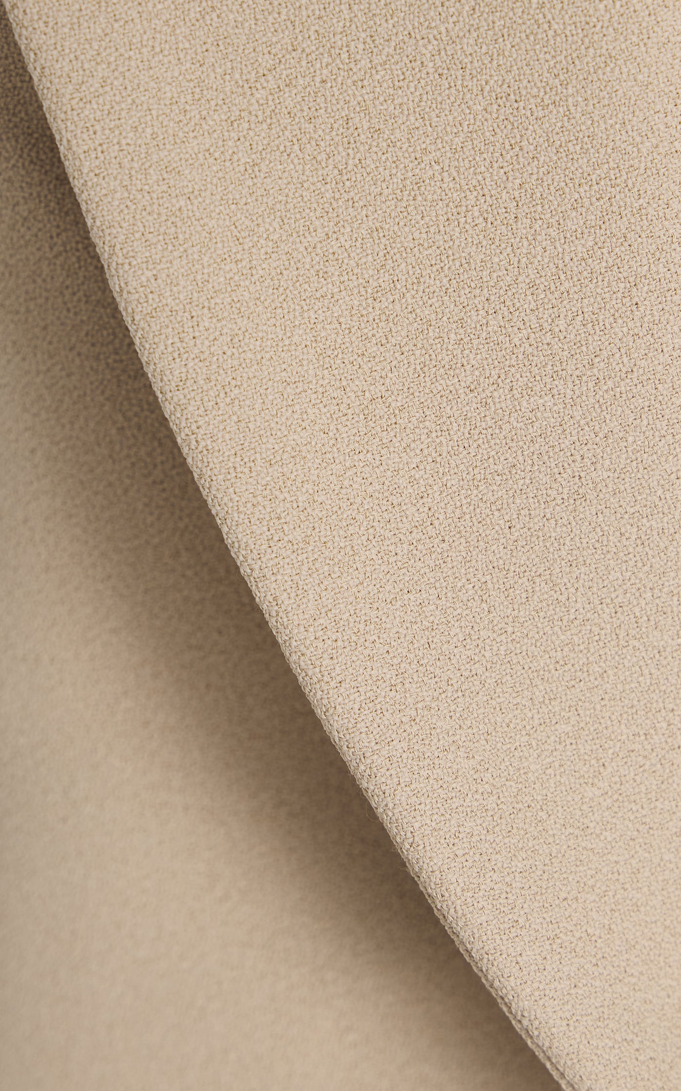 Dominica is drawn in dualities: the sharp cut of tailoring against the sweep of silk. A single-breasted blazer in greige double crepe cuts with structured shoulders and a low-break peak lapel, fastening at the waist. Paired with a high-low silk georgette skirt gathered into fluid panels that fall into a soft train, where tailoring yields to fluid grace.