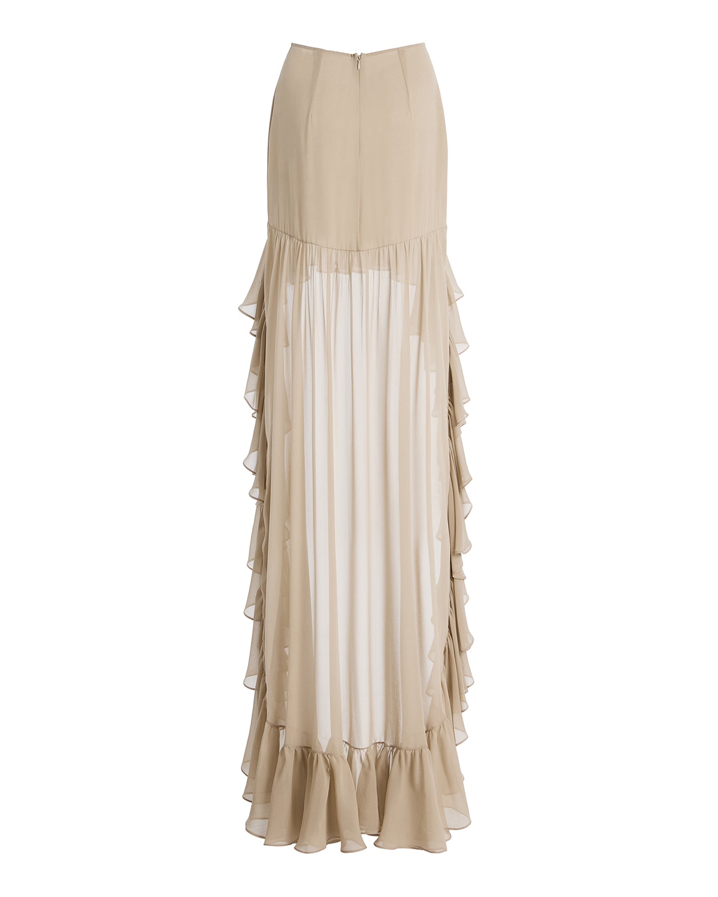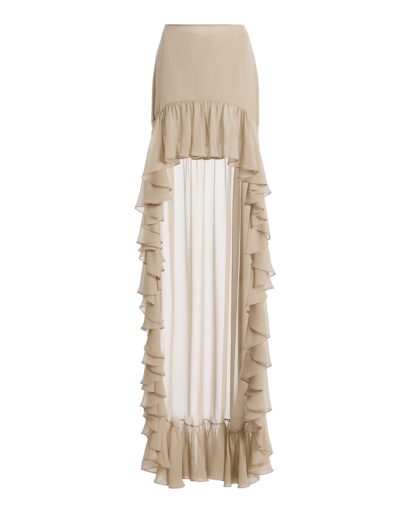- High-low cut with floor length and soft train