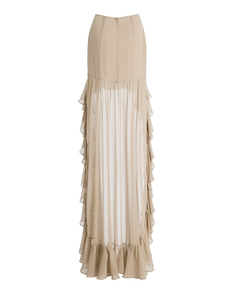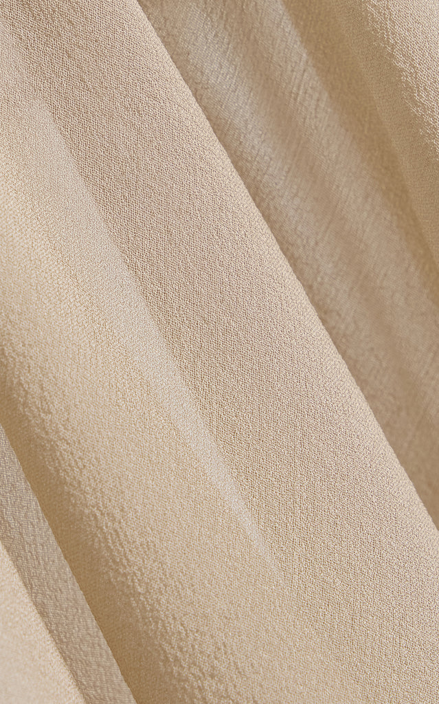 Dominica is drawn in dualities: the sharp cut of tailoring against the sweep of silk. A single-breasted blazer in greige double crepe cuts with structured shoulders and a low-break peak lapel, fastening at the waist. Paired with a high-low silk georgette skirt gathered into fluid panels that fall into a soft train, where tailoring yields to fluid grace.