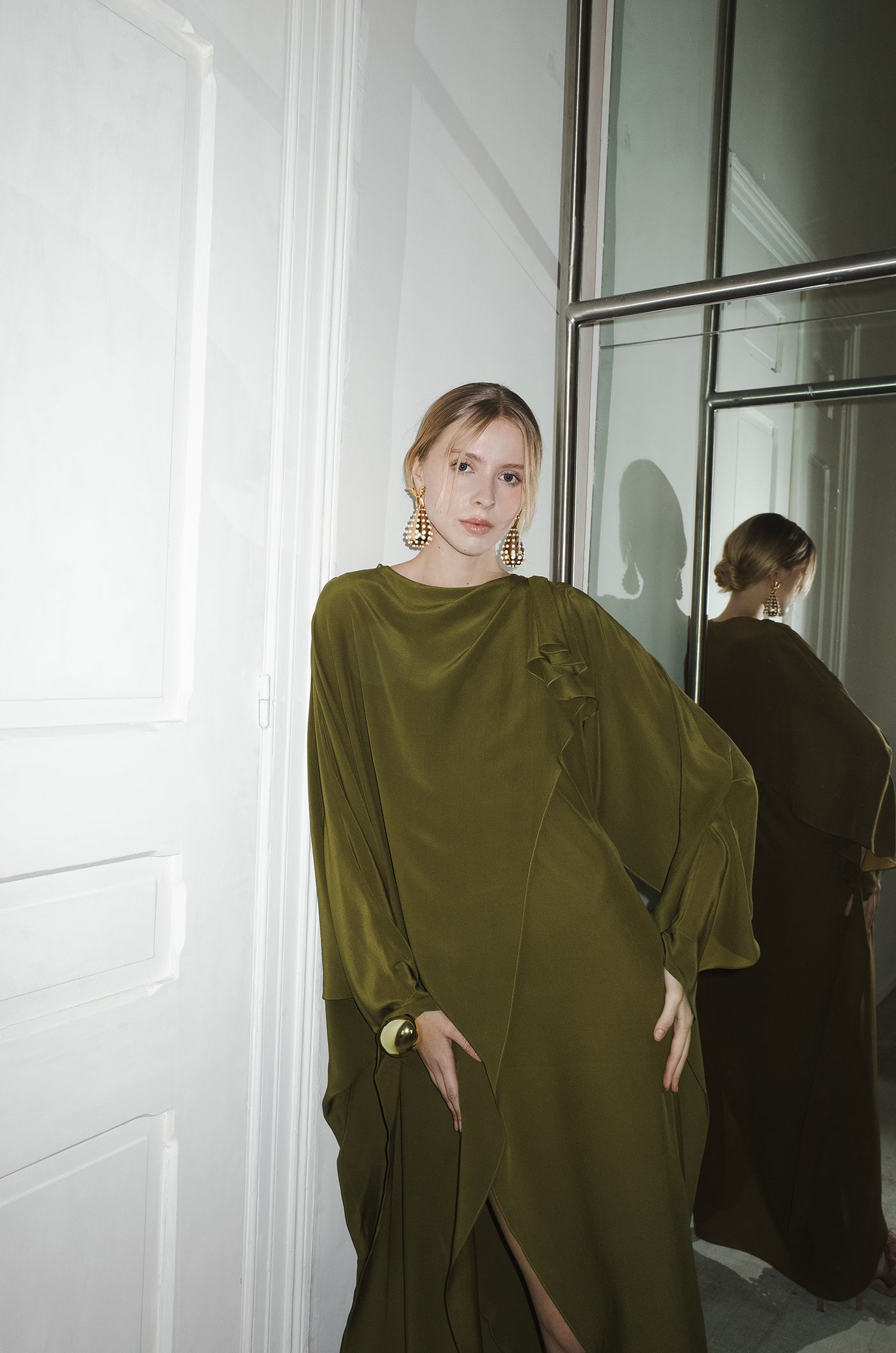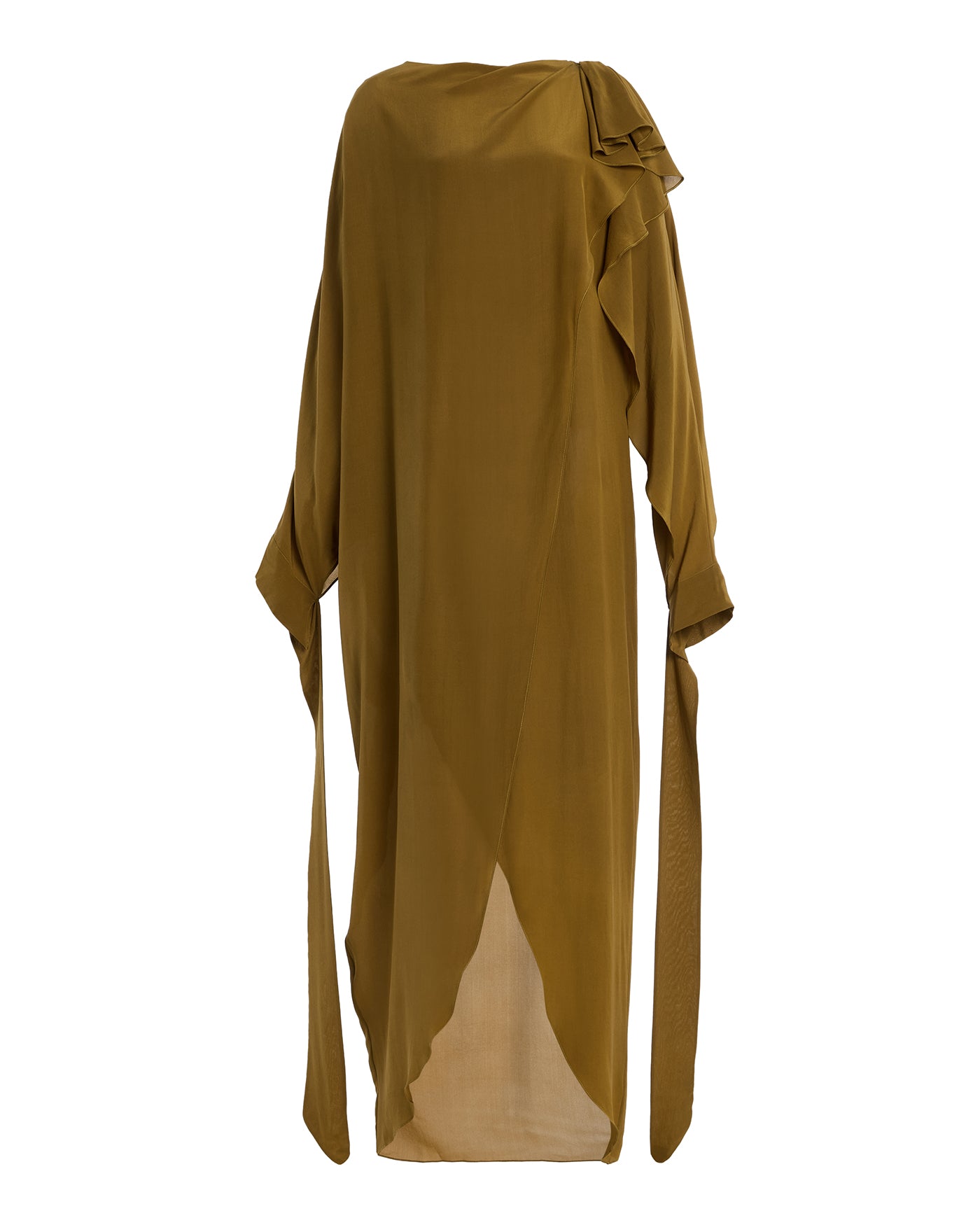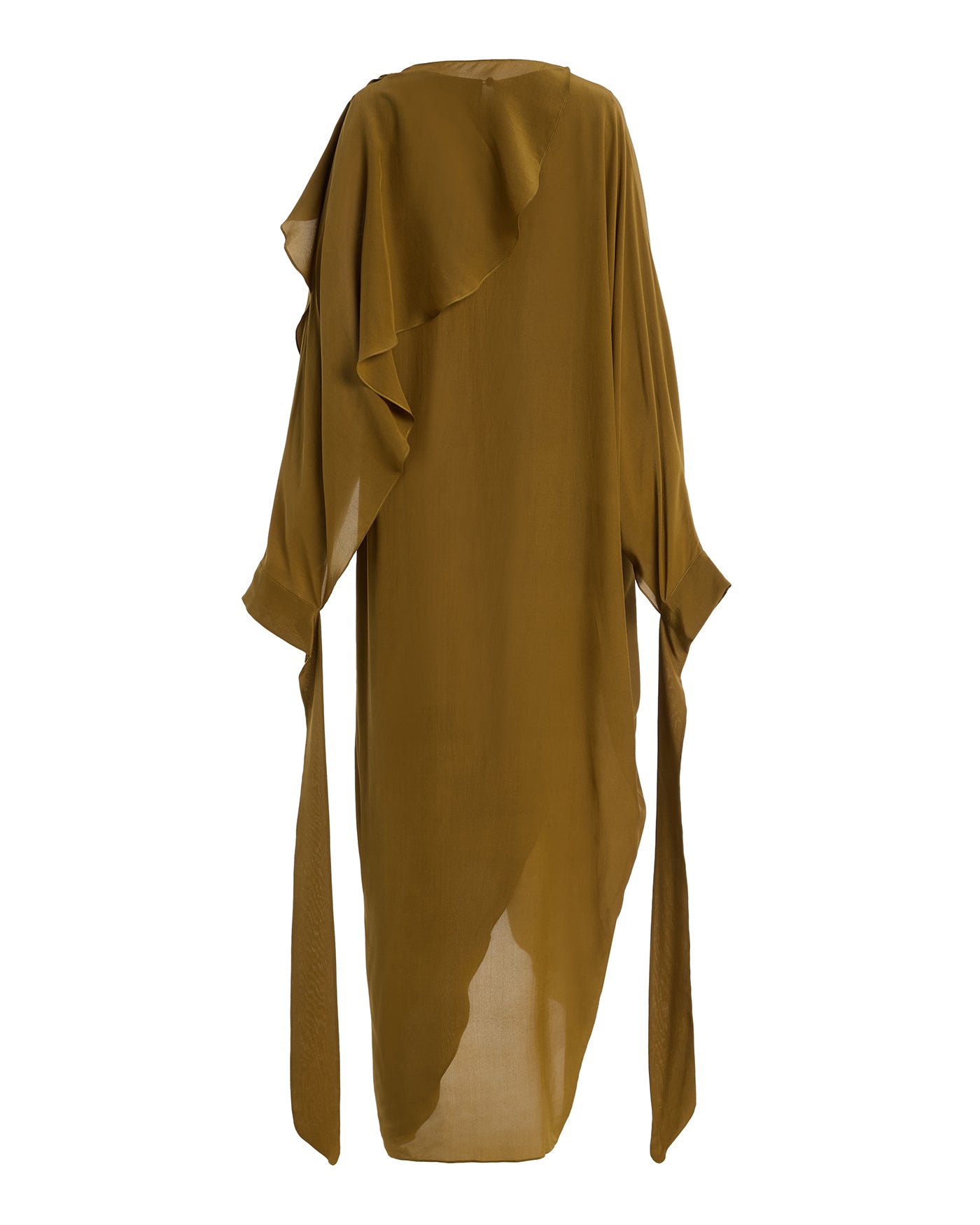 - Long billowy sleeves, shoulder gather, cascading drape, maxi hem