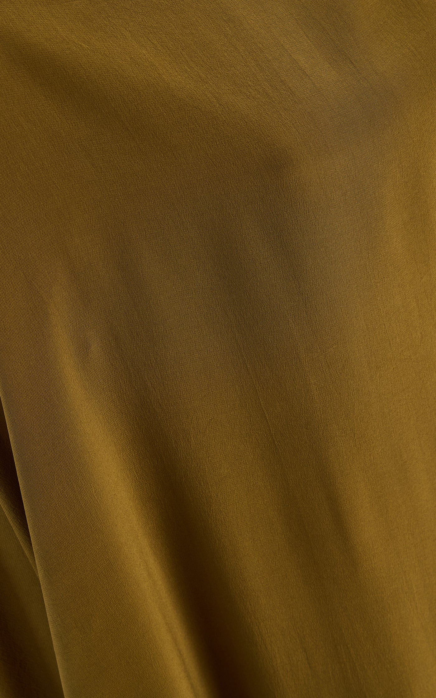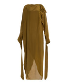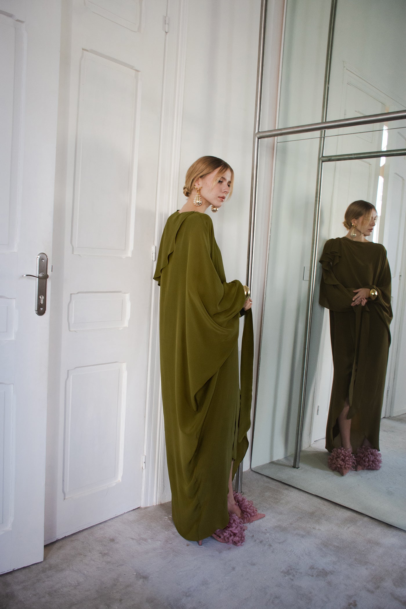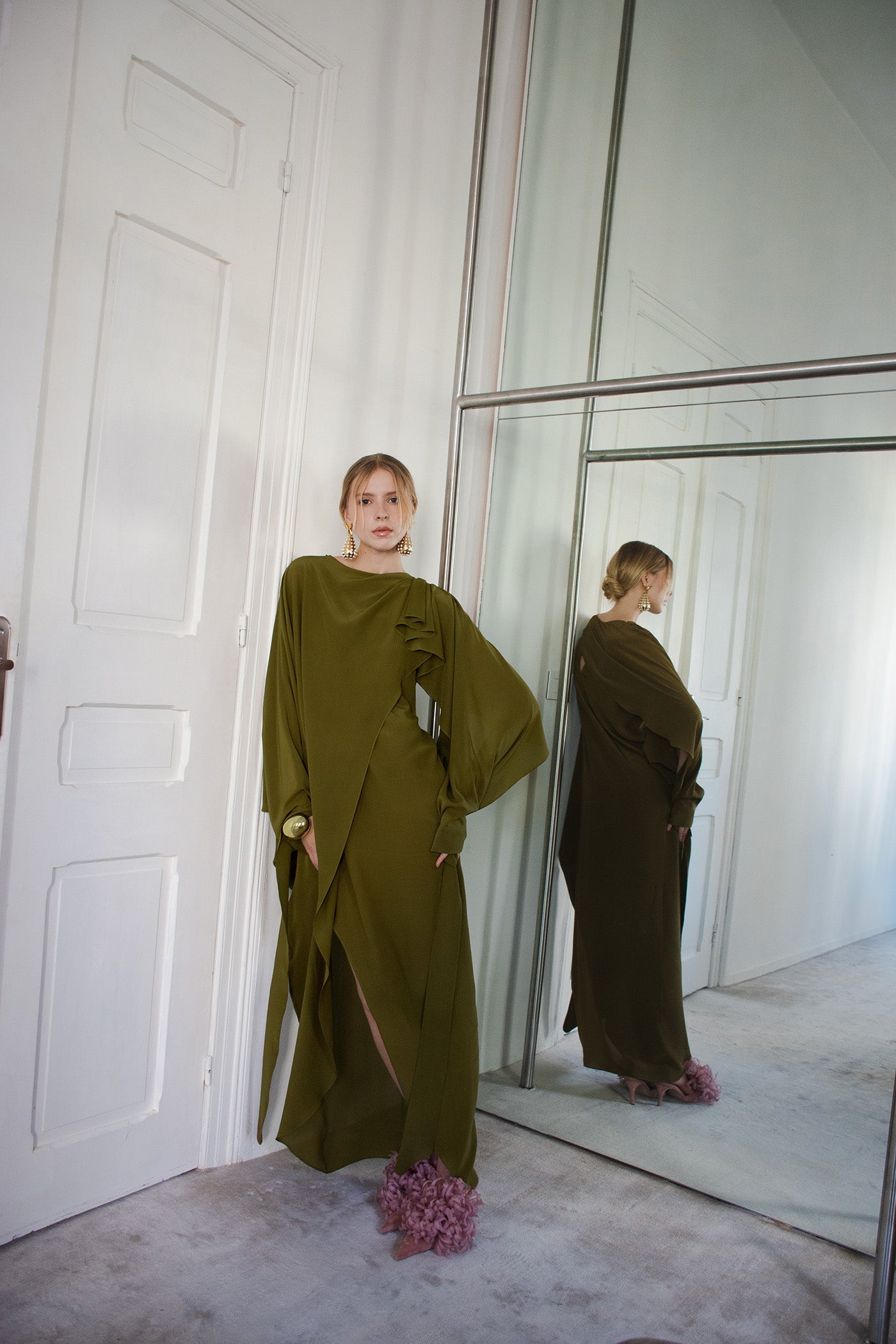- Long billowy sleeves, shoulder gather, cascading drape, maxi hem