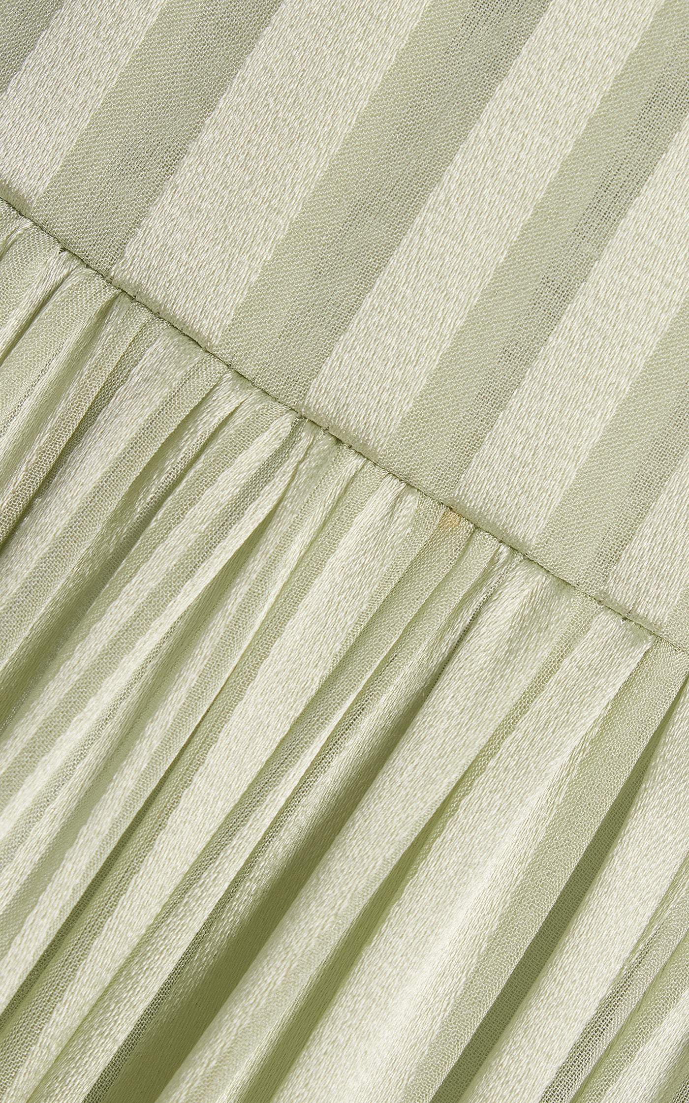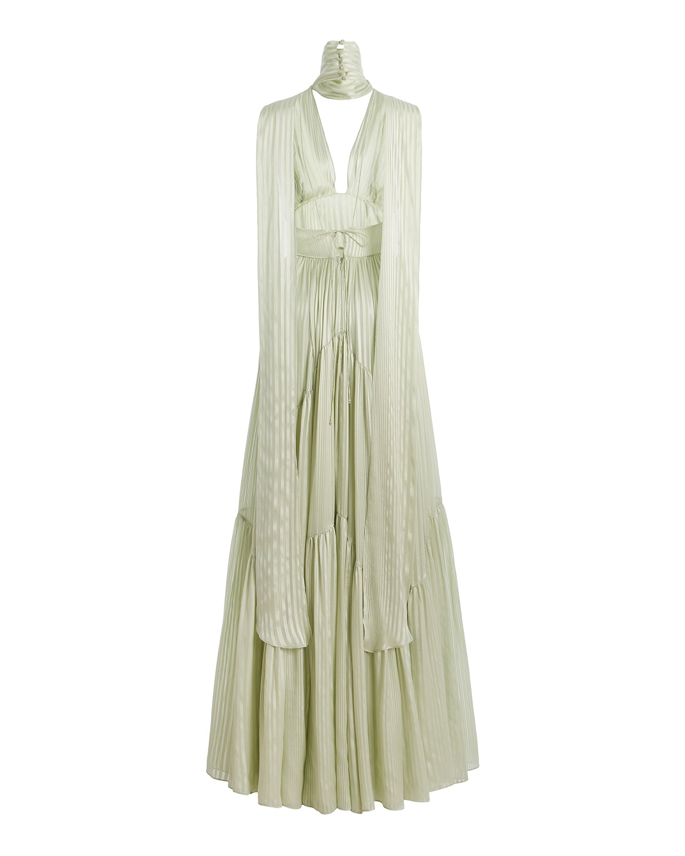 Ferrara recalls the shimmer of fountains in ancient Italian gardens, sage green silk striped satin overlaid with chiffon lines that play with the light. An open neckline extends into a trailing scarf that falls down the back, framing a gathered bodice and waist drawn in with sculptural precision. From there, the skirt flares into a floor-length sweep, each tier unfolding like water spilling over stone.