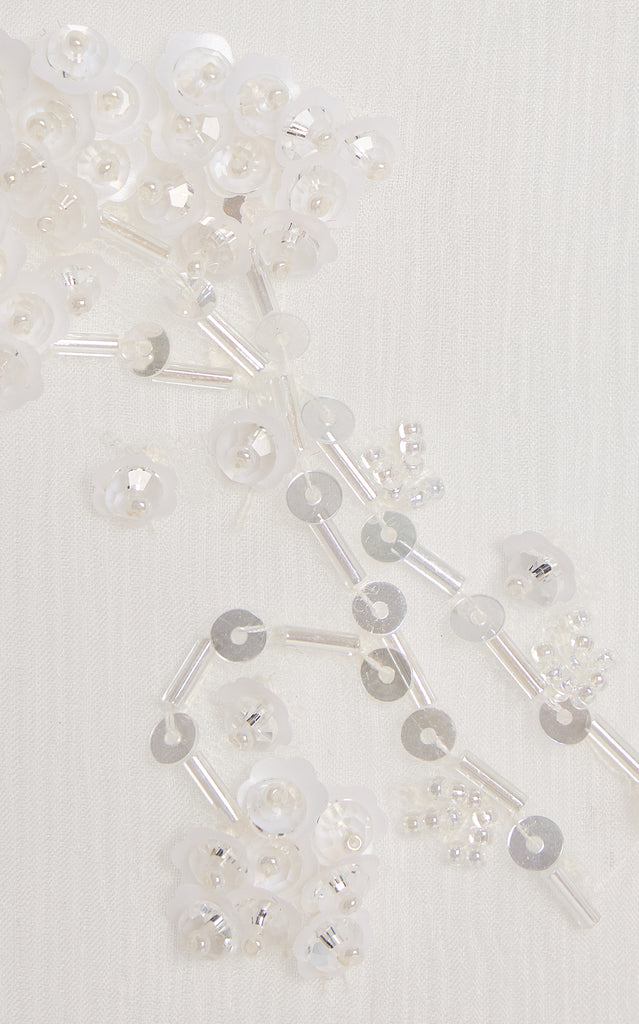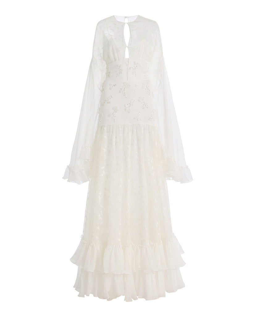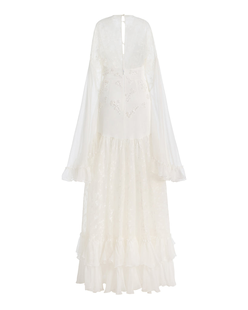 Held in lace and sheer sleeves, Ines suggests more than she reveals. Dove-white floral embroidery traced with tonal beading shapes the high neckline, which parts with a slender tie above a fitted waist. Long bishop sleeves fall weightless to flounced cuffs, while the skirt extends from a smooth lace panel into a gathered tier, dissolving at the floor in a diaphanous hem. A silhouette drawn in delicacy, yet edged with intent.