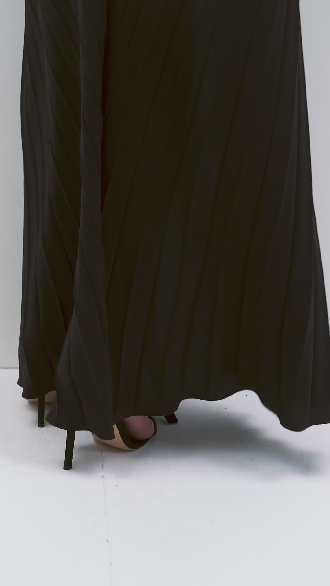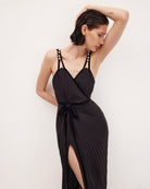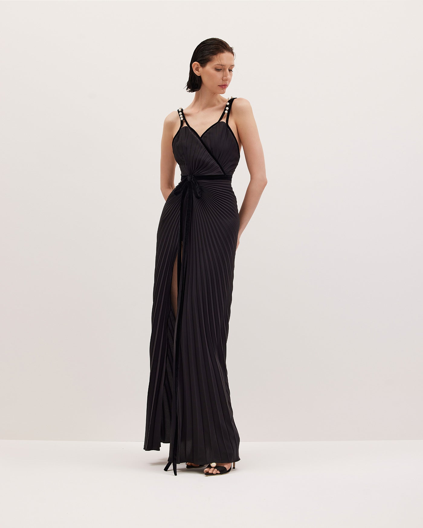 A classic wrap design, MISS SPENCER is expertly pleated from plissé crepe de chine and cinched with a rich black velvet bow before falling into a split skirt. Rows of velvet-framed pearls embellish the shoulders.
