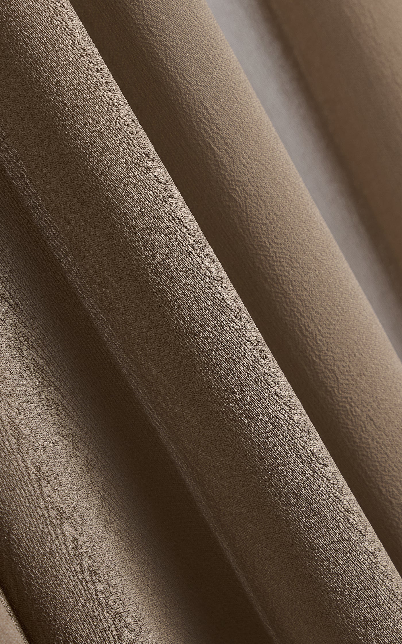 Regina straddles worlds with grace and strength, her presence drawn in the cut of a single-breasted blazer and the sweep of a floor-length skirt. The blazer, in double crepe, sharpens the silhouette with structured shoulders and a low-break peak lapel, fastening at the waist. Its counterpart, a silk georgette skirt, is gathered into tiers that fall to a flounce hem and train, tempering command with fluid movement.