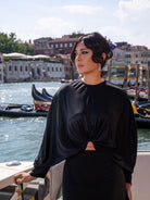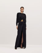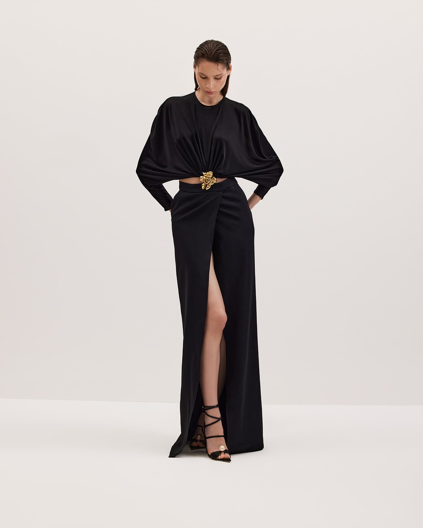 ROSE is an ensemble comprising a dolman sleeve top draped from black silk jersey, which lends a subtle sheen. The coordinating skirt is made from double crepe, tailored with pockets, and parted with a front slit. Embellish Rose with our gold rose broche.