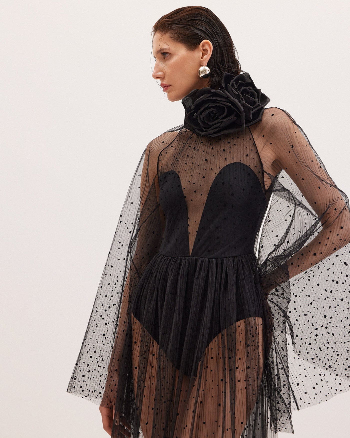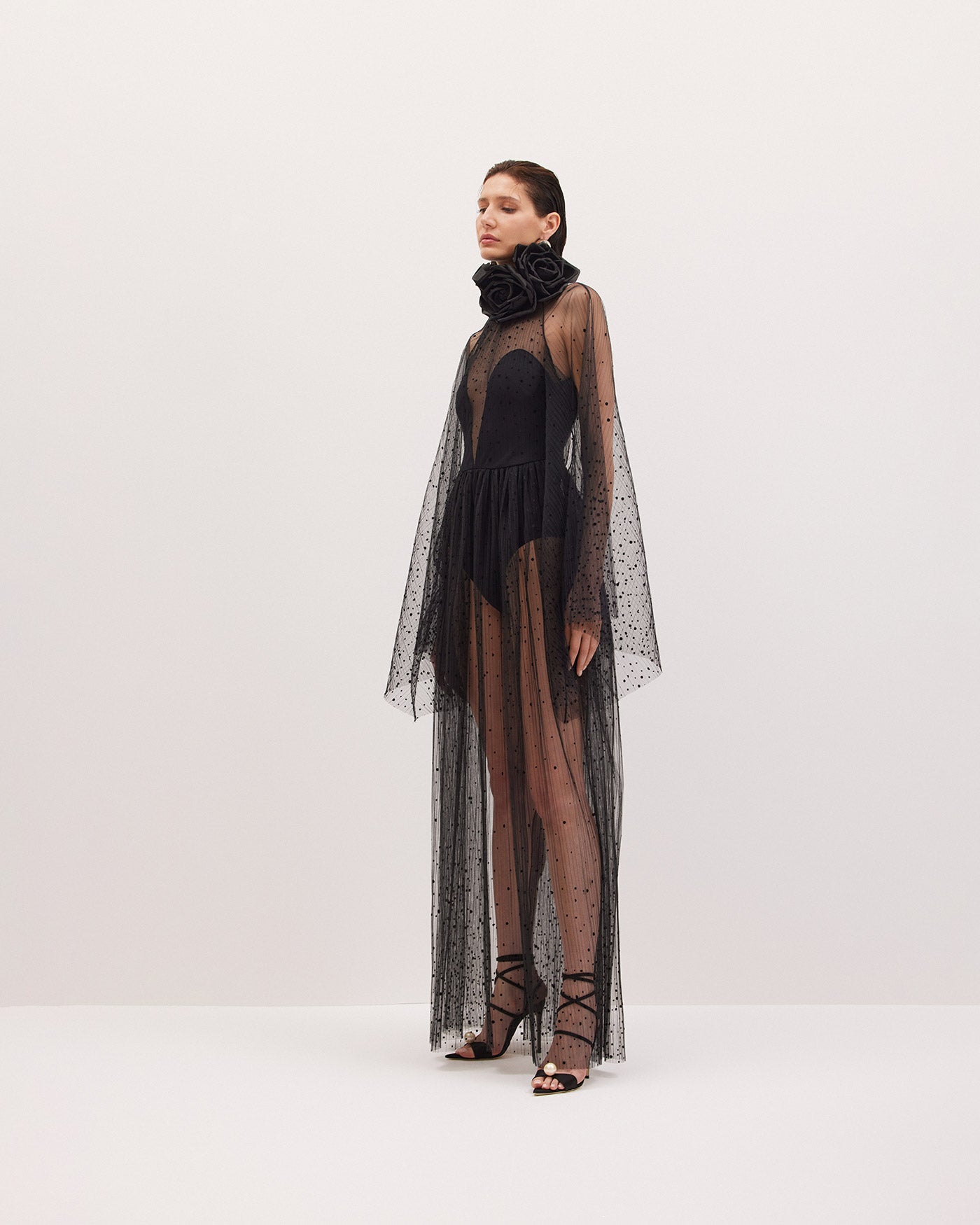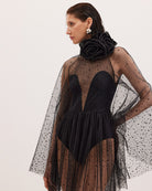 SKY is crafted from floaty panels of dotted tulle plissé over a sculpted leotard, creating a sheer and fluttery effect. Complete the look by requesting a handcrafted silk rose broche from Harithand. Cate can be custom-tailored with additional lining.