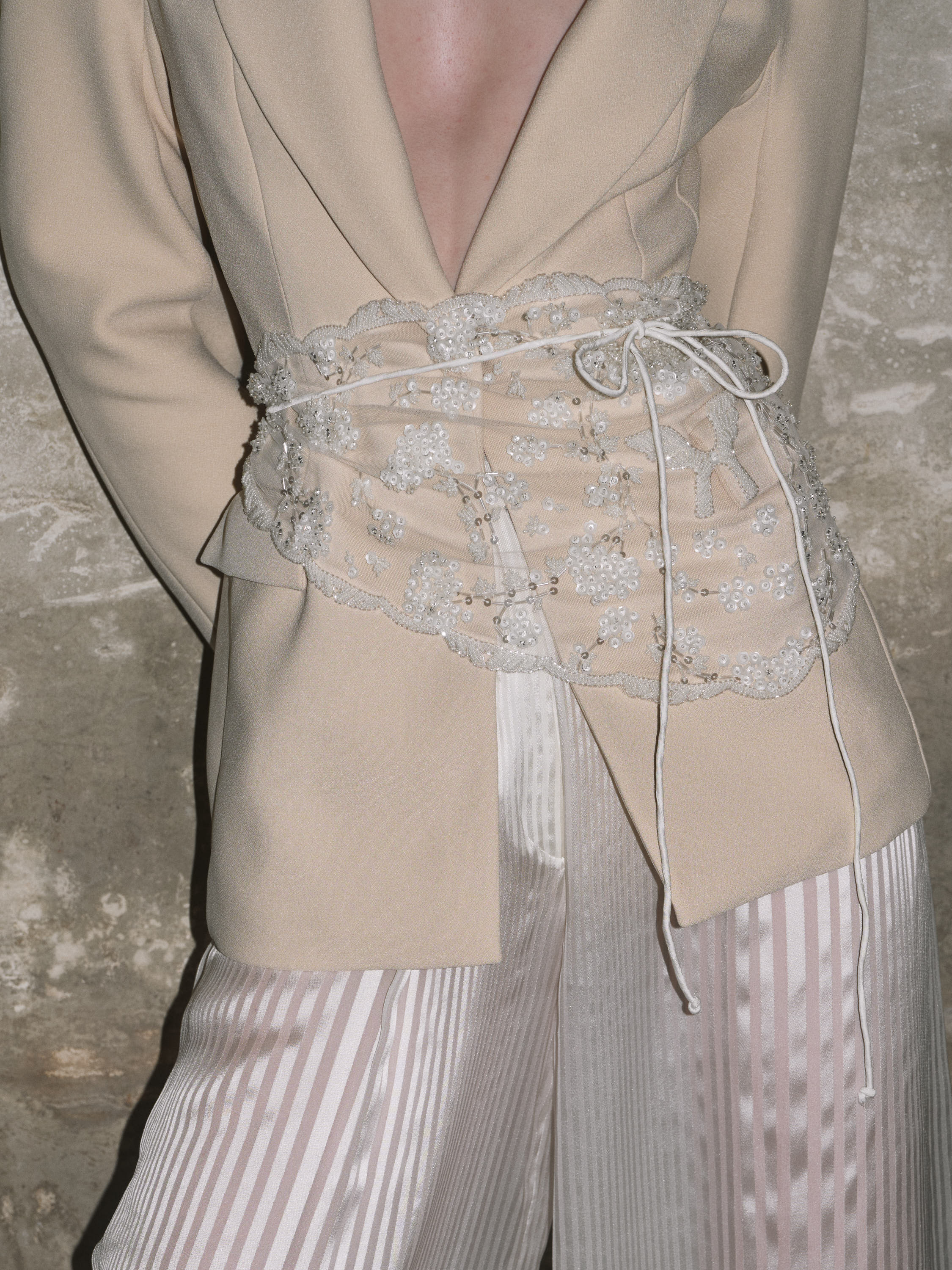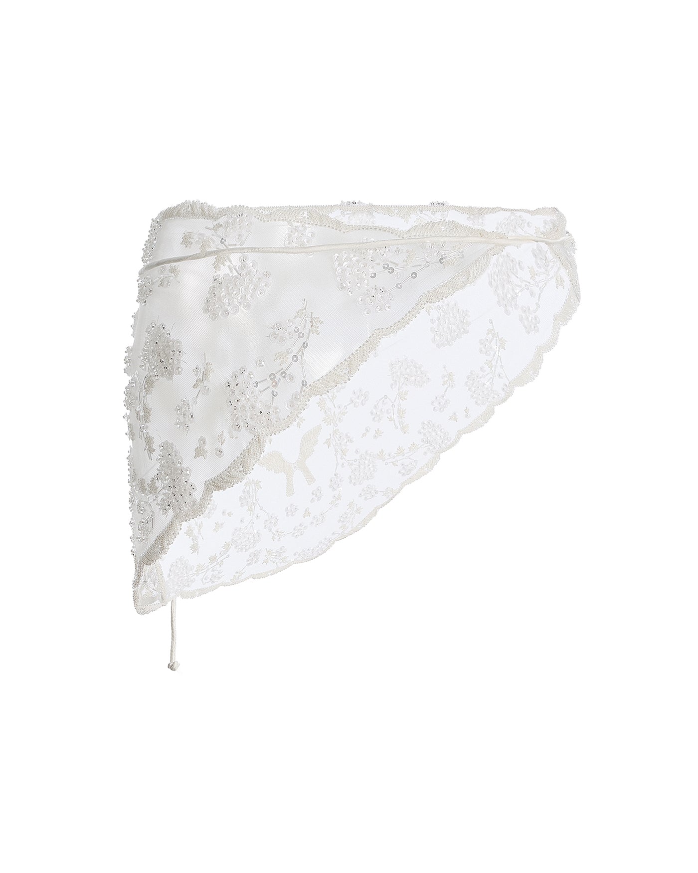 Light as air, the white lace bandana crowns tailoring with ornament. Cut in embroidered tulle and traced with delicate beading, it ties at the waist with slender cords, softening structure with sheer romance. Draped over a blazer, dress, or gown, it is a gesture of embellishment that transforms restraint into reverie.