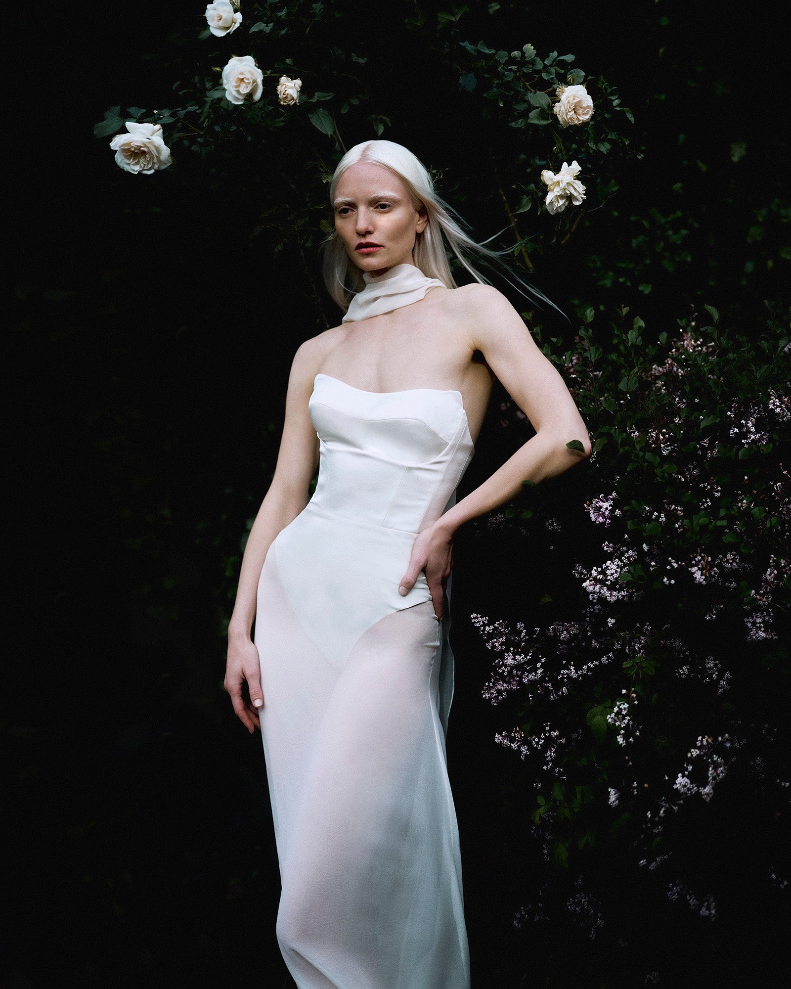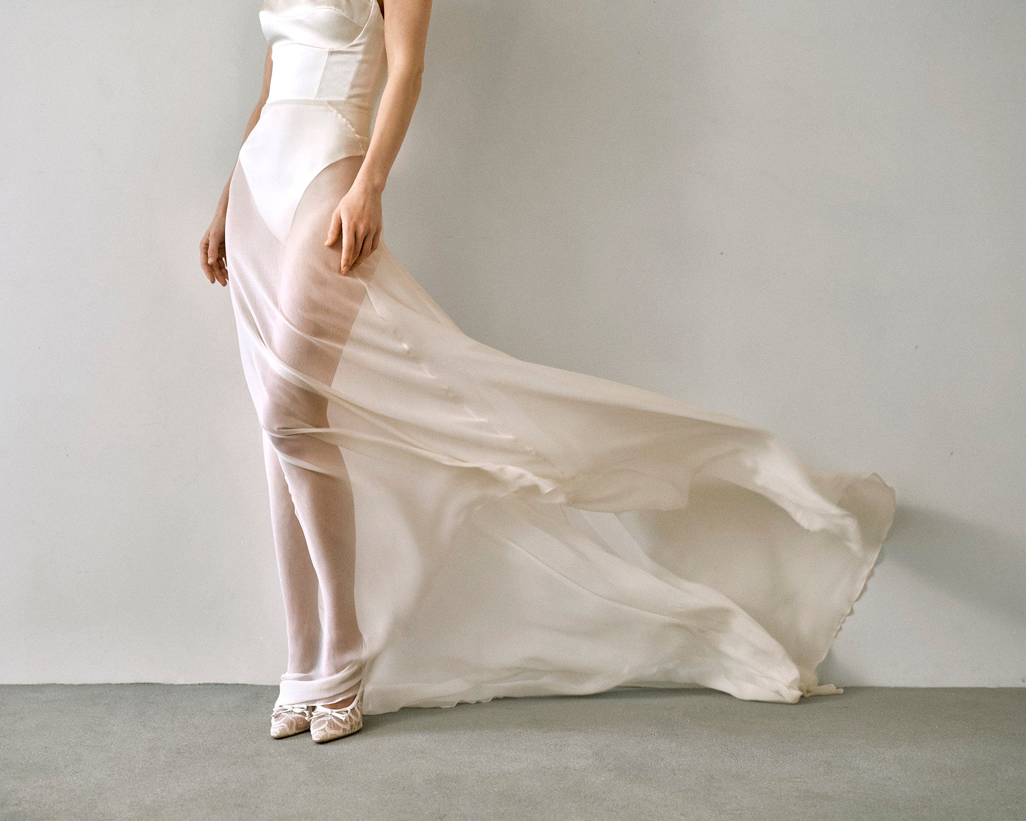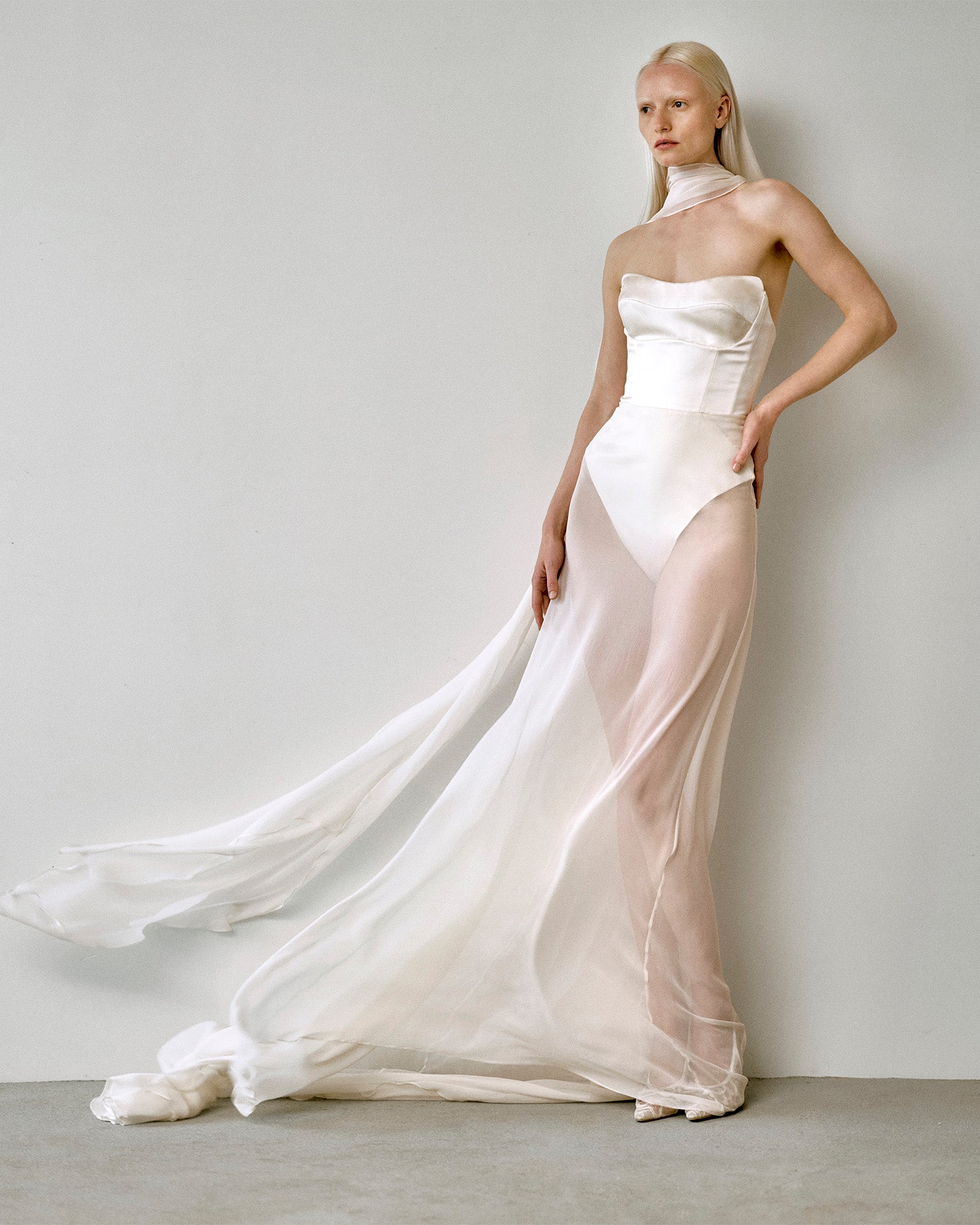 Valentina blends modern sensuality with Renaissance poise. Crafted from off-white satin duchess and silk georgette, this form-hugging gown features a built-in bodysuit and sheer train, embodying lightness and allure.