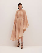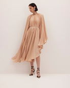 AMBROSE has a floaty, asymmetrical silhouette crafted from swathes of lightweight silk crepe de chine plissé. Finely pleated throughout, this dress features sleeves that fan out over the arms and is cinched at the waist before falling elegantly to a midi length.