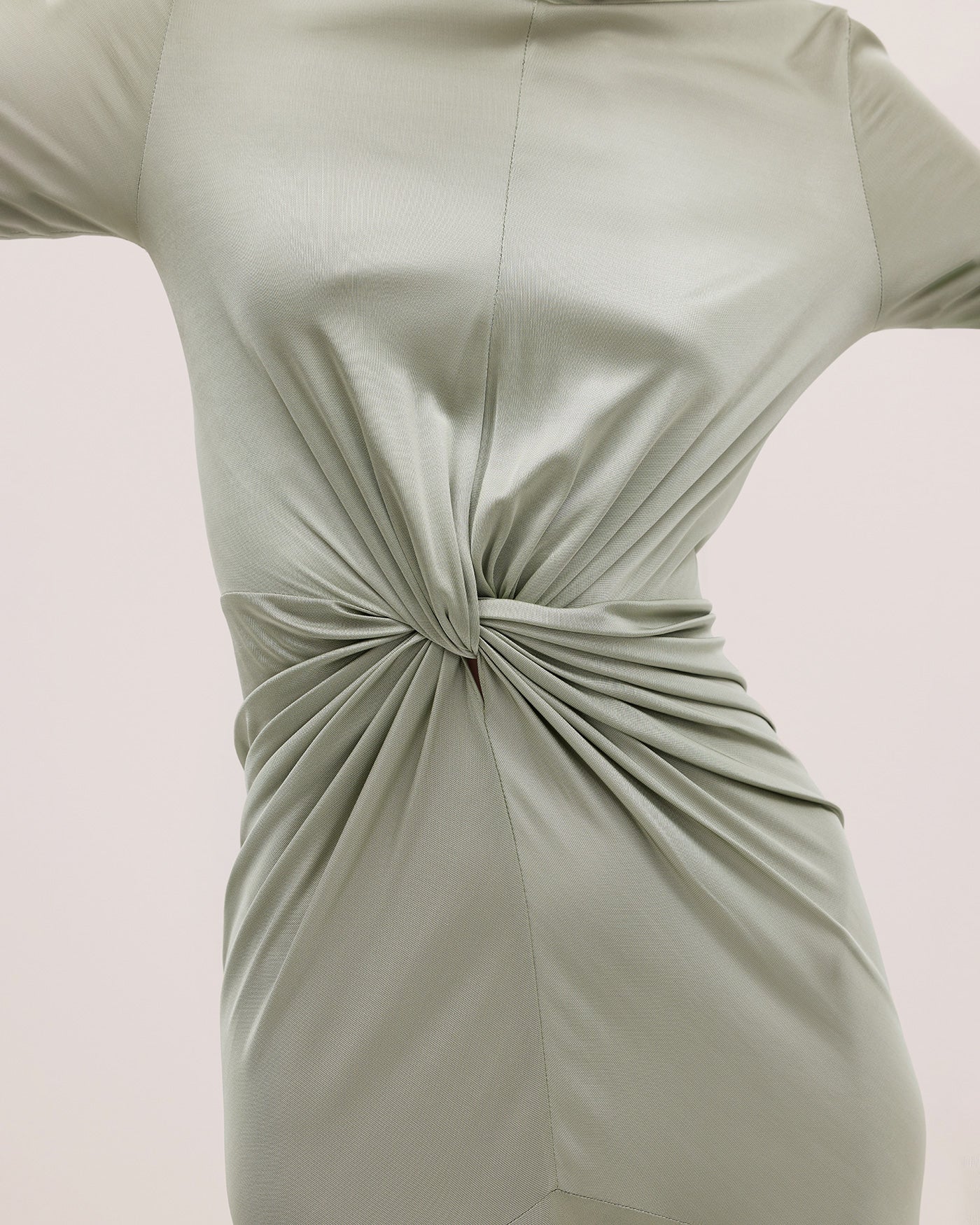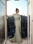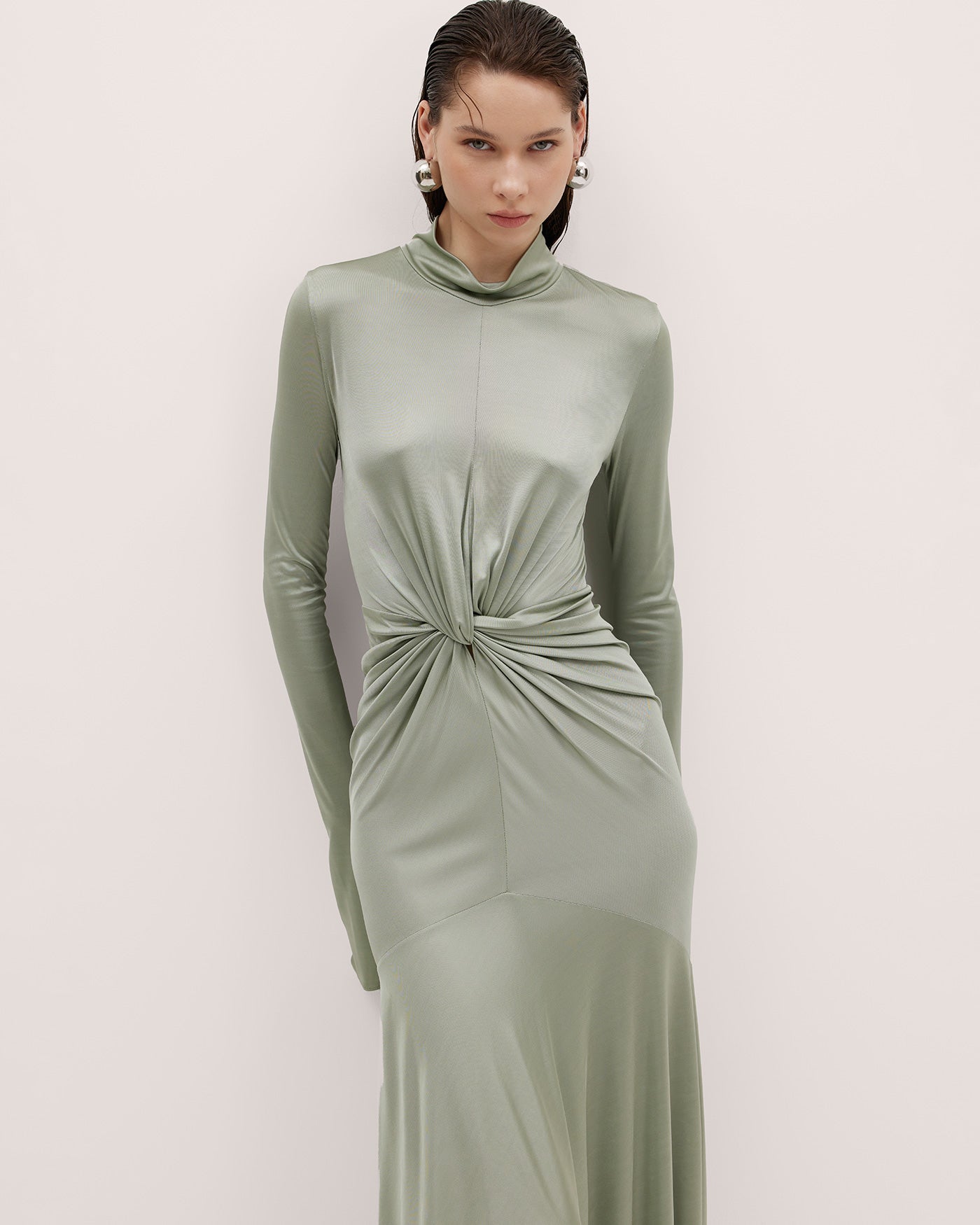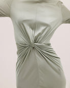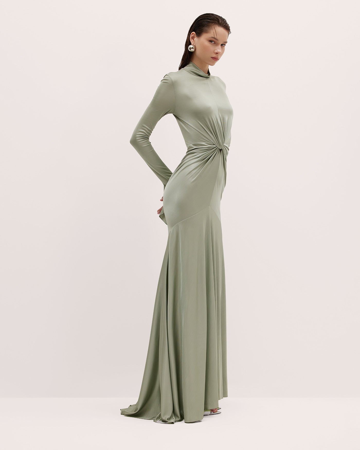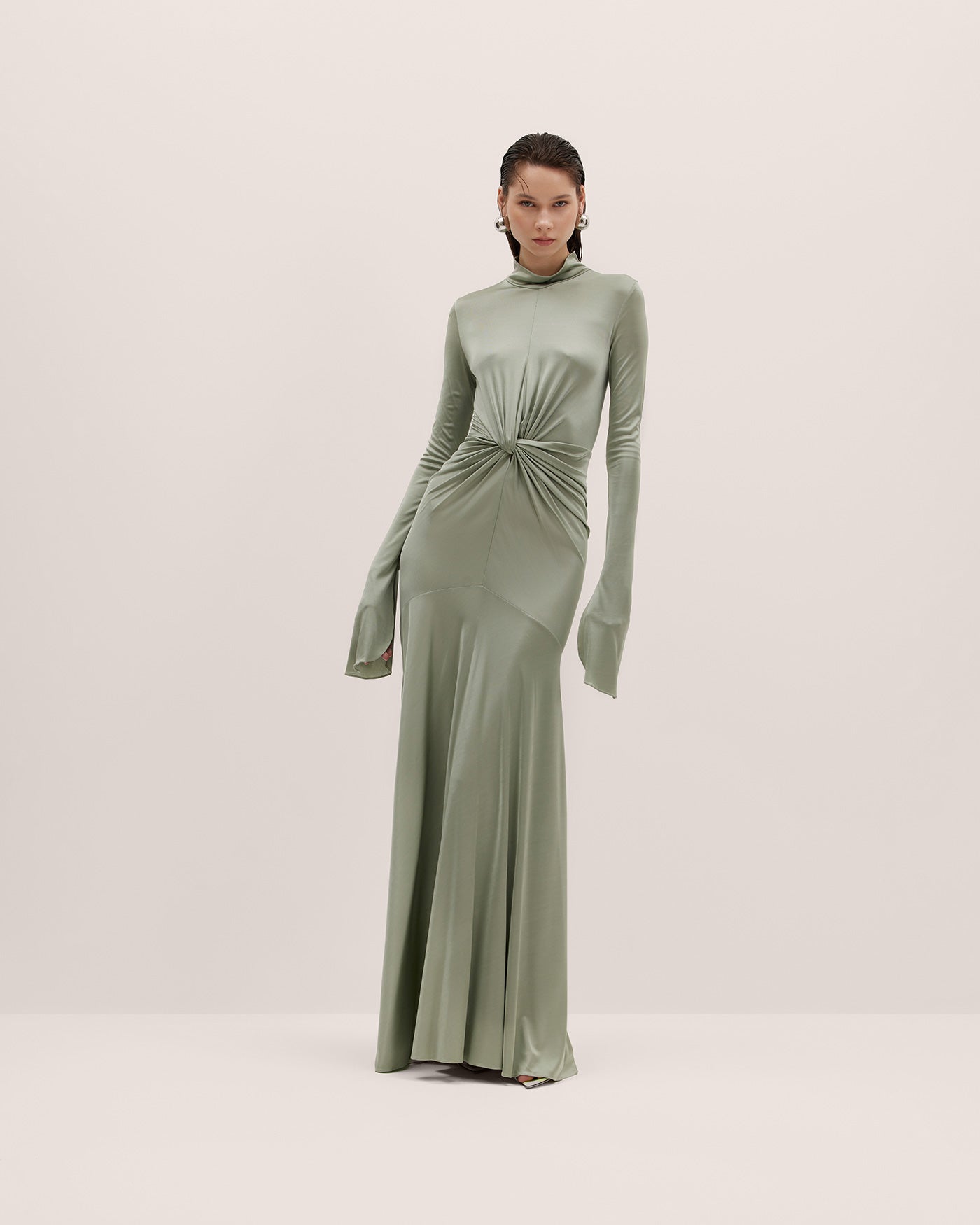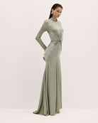 YASMIN is a long gown crafted from smooth silk jersey lycra—the fabric has been elegantly gathered to a refined front knot detail. A high collar, flared sleeves, and understated mermaid hem make for finishing touches.