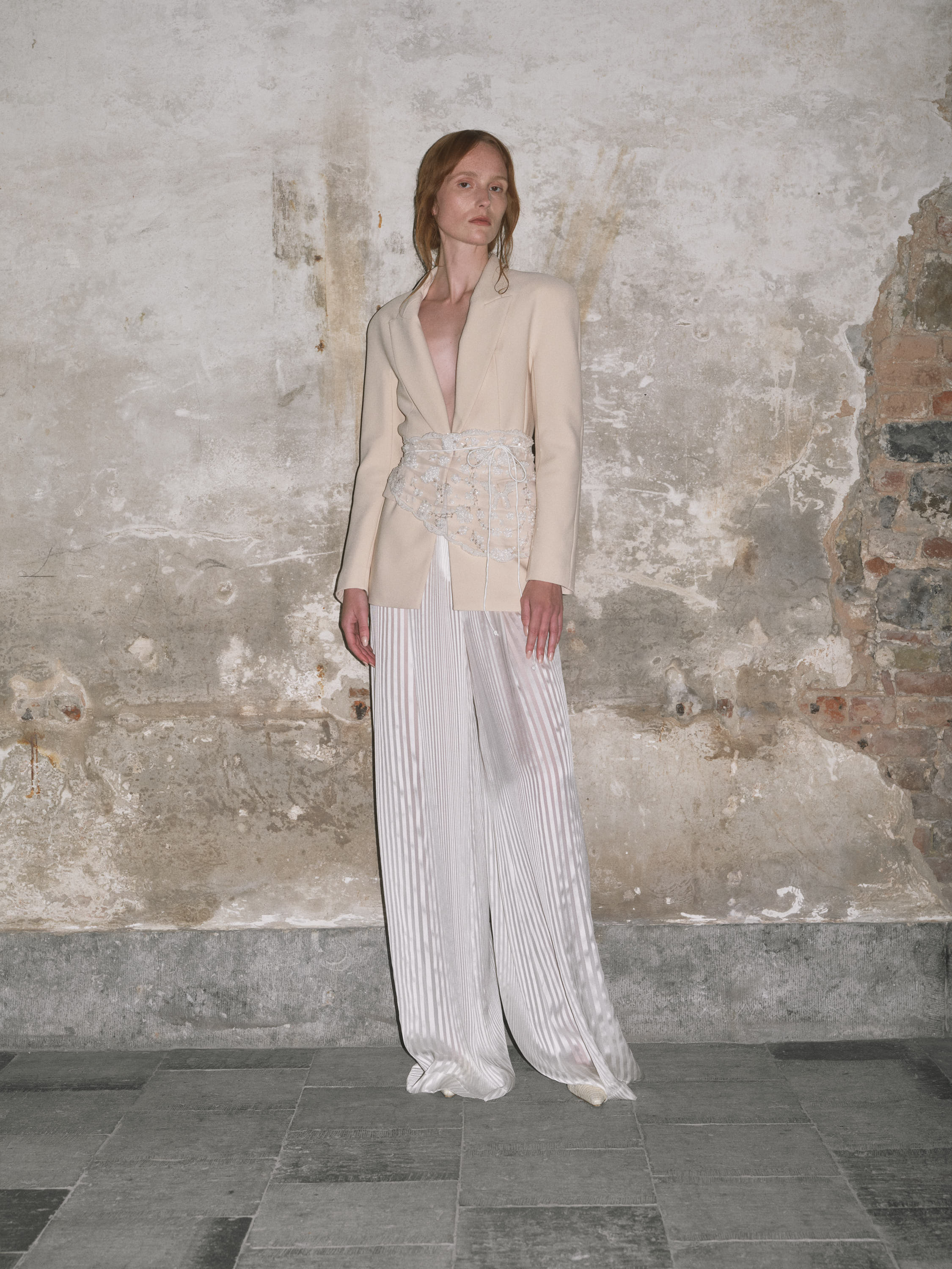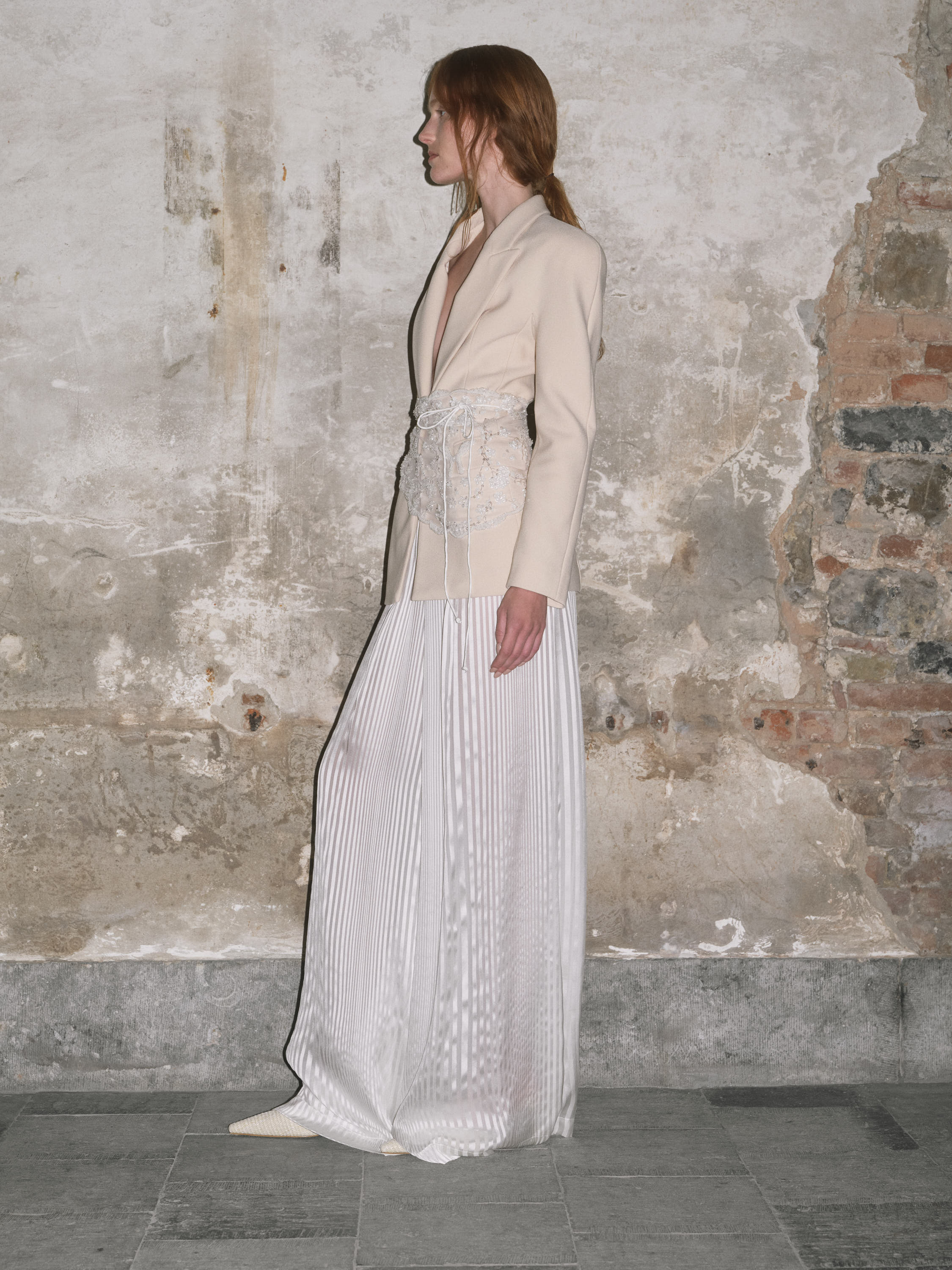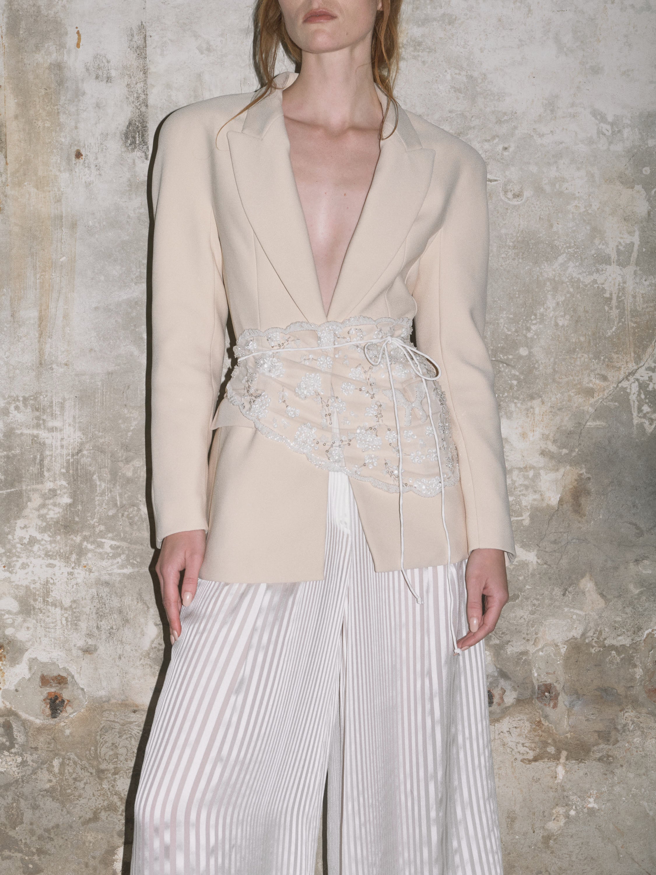 Tailoring and ornament held in dialogue. A single-breasted blazer in antique ivory double crepe sharpens at peak lapels and structured shoulders before tapering to the waist. Paired with high-waisted silk striped satin pants overlaid with chiffon, the silhouette rises clean and falls fluid, strength softened by flow.