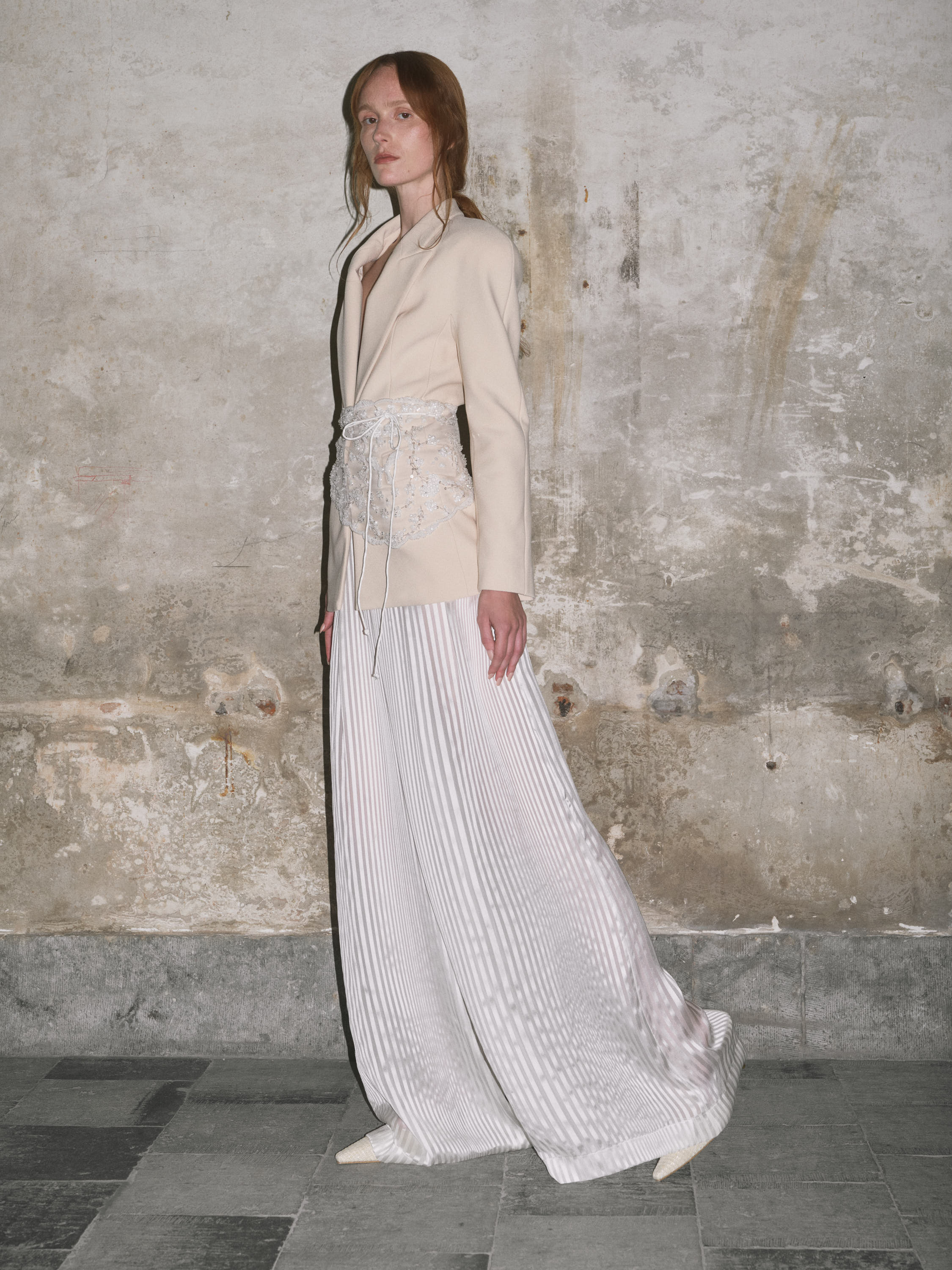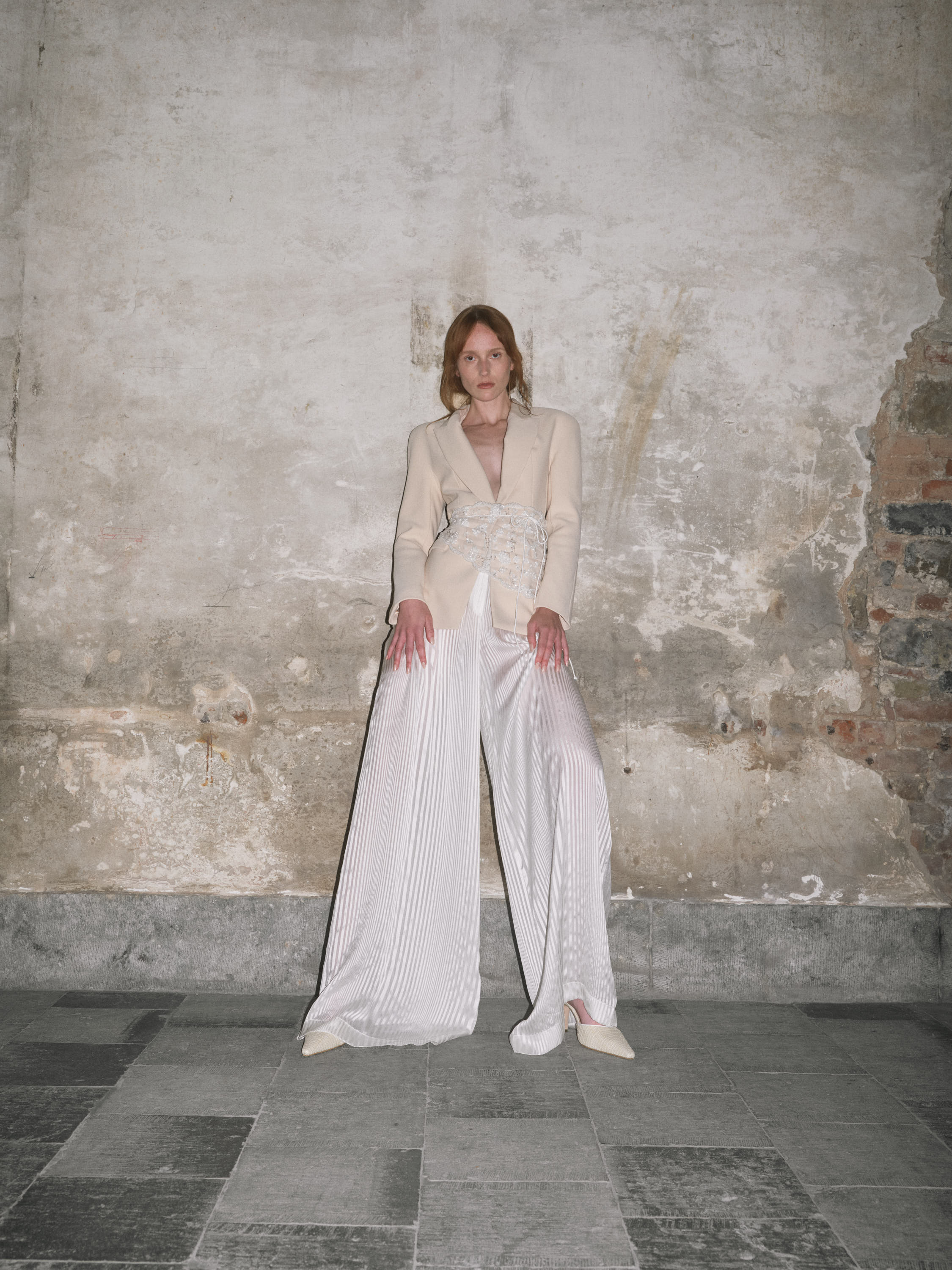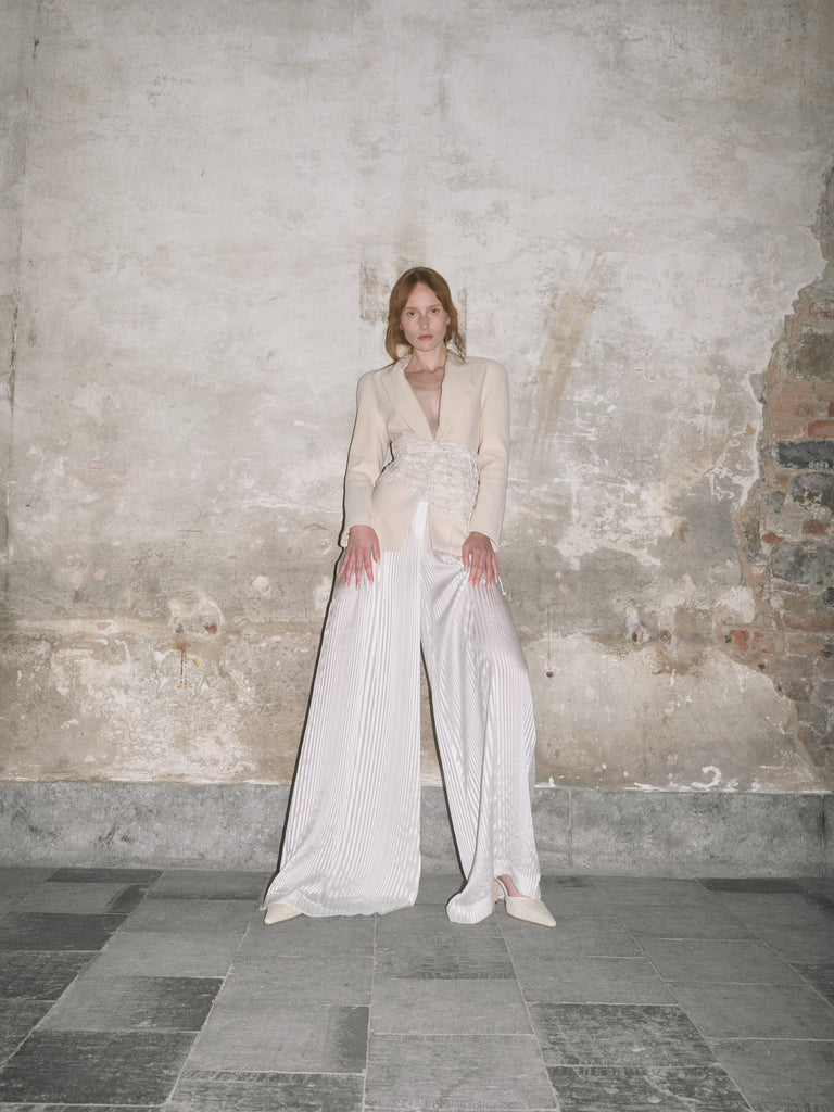 Tailoring and ornament held in dialogue. A single-breasted blazer in antique ivory double crepe sharpens at peak lapels and structured shoulders before tapering to the waist. Paired with high-waisted silk striped satin pants overlaid with chiffon, the silhouette rises clean and falls fluid, strength softened by flow.