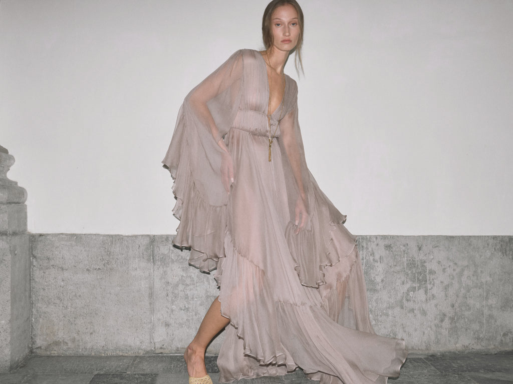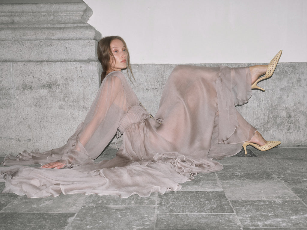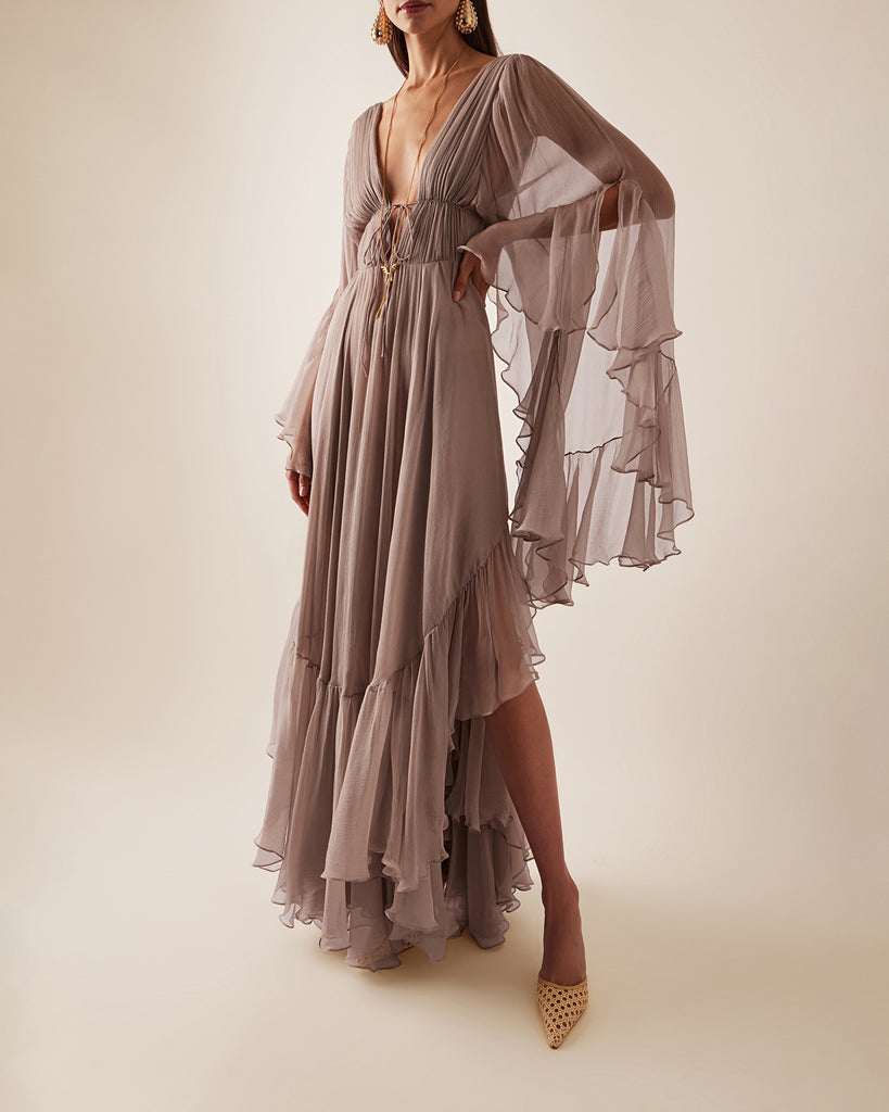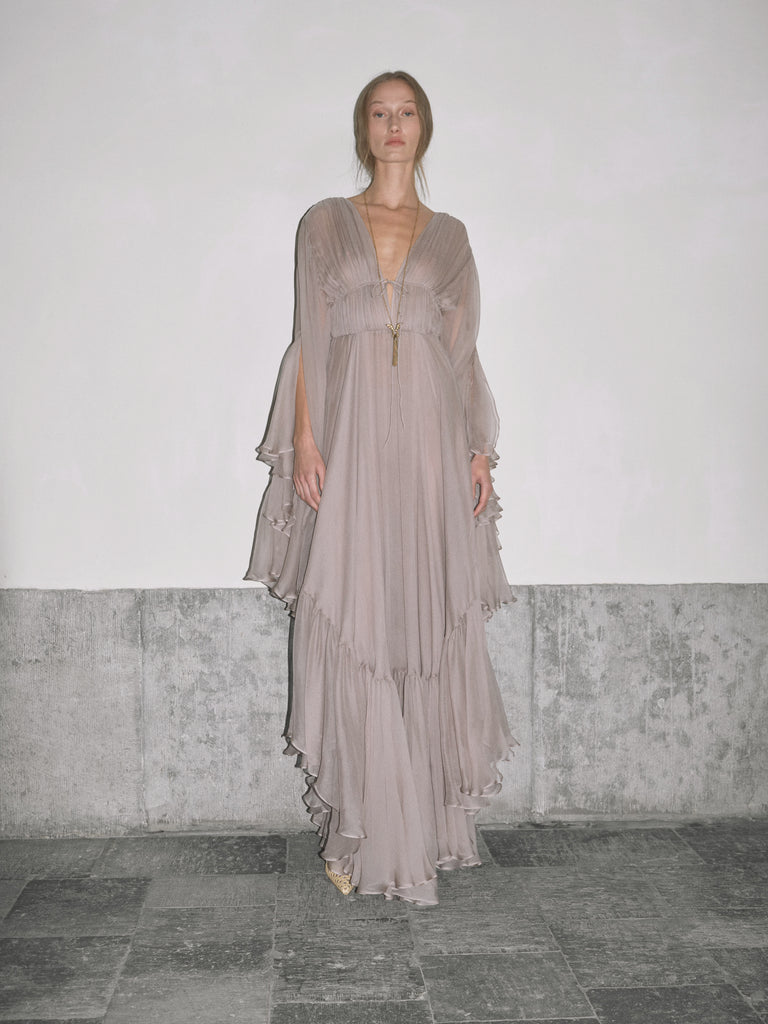 Nerina plunges like midnight waters, silk drawn deep then released in waves. Taupe-grey georgette gathers into a high ruched waist, cinched with a fine tie before falling loose at the arms. The skirt breaks in asymmetric tiers, cascading to a floor-length hem that ripples with each step, as irresistible as the tide pulling toward Capri’s shore.