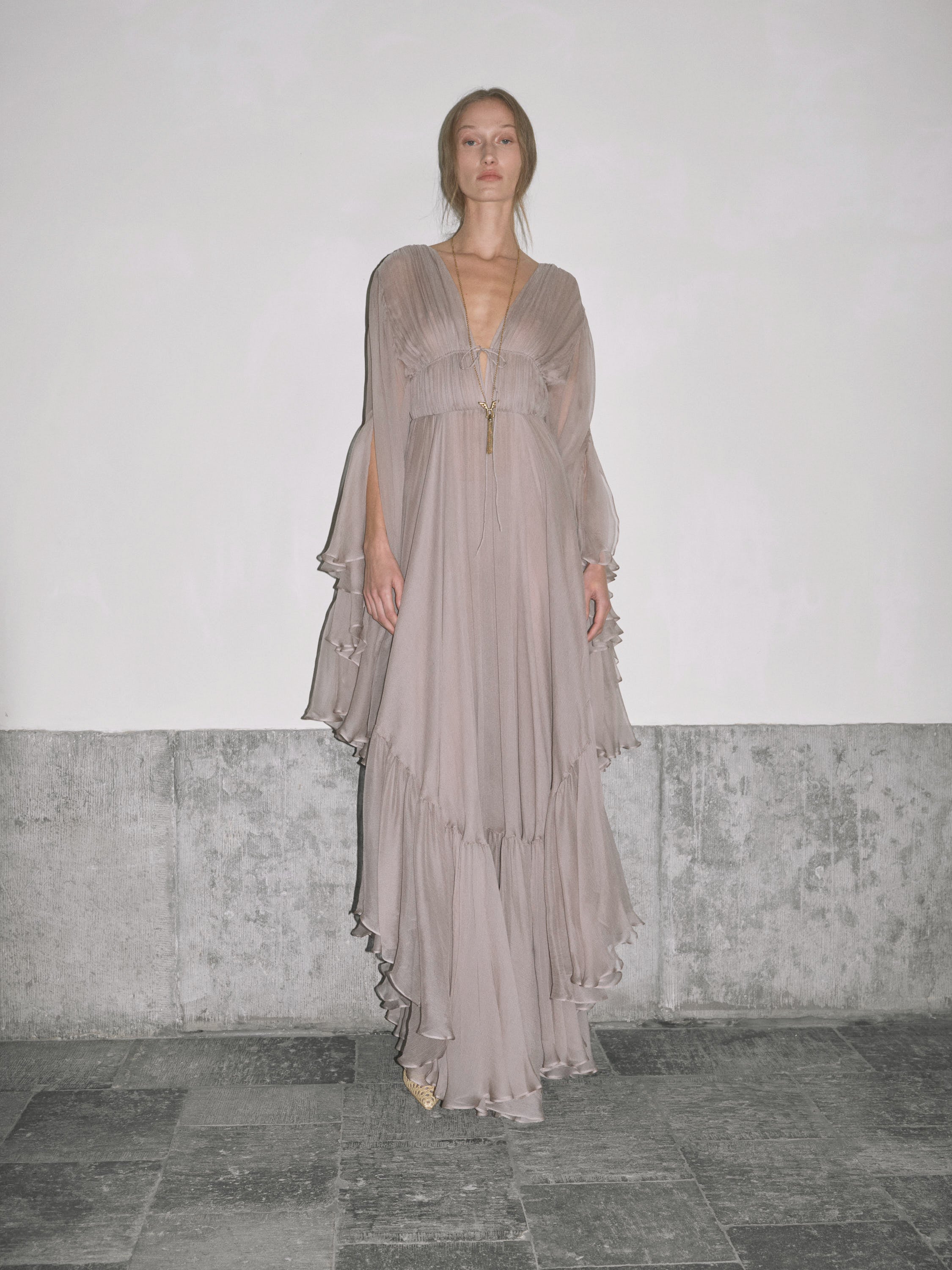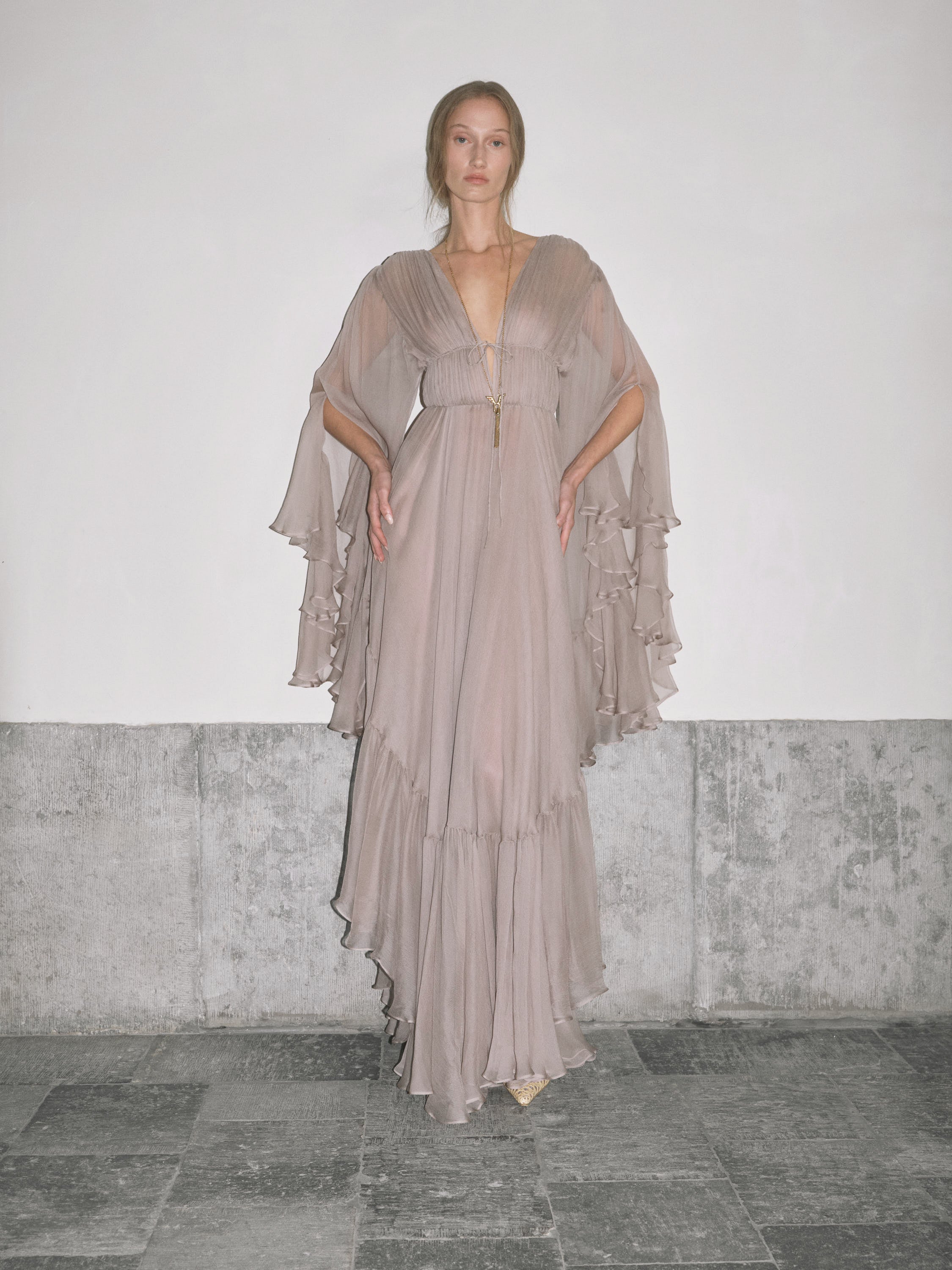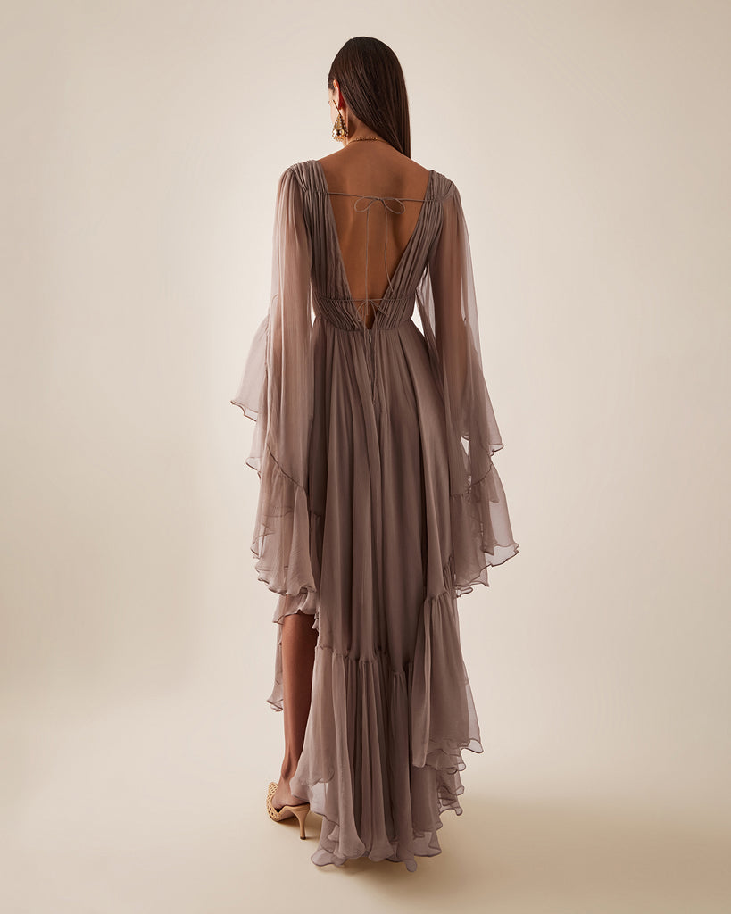 Nerina plunges like midnight waters, silk drawn deep then released in waves. Taupe-grey georgette gathers into a high ruched waist, cinched with a fine tie before falling loose at the arms. The skirt breaks in asymmetric tiers, cascading to a floor-length hem that ripples with each step, as irresistible as the tide pulling toward Capri’s shore.