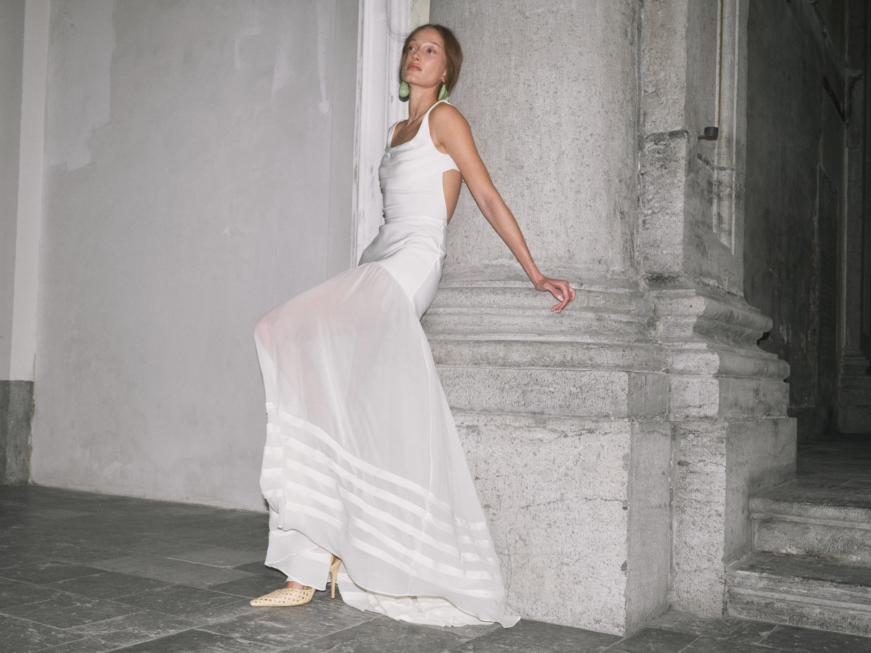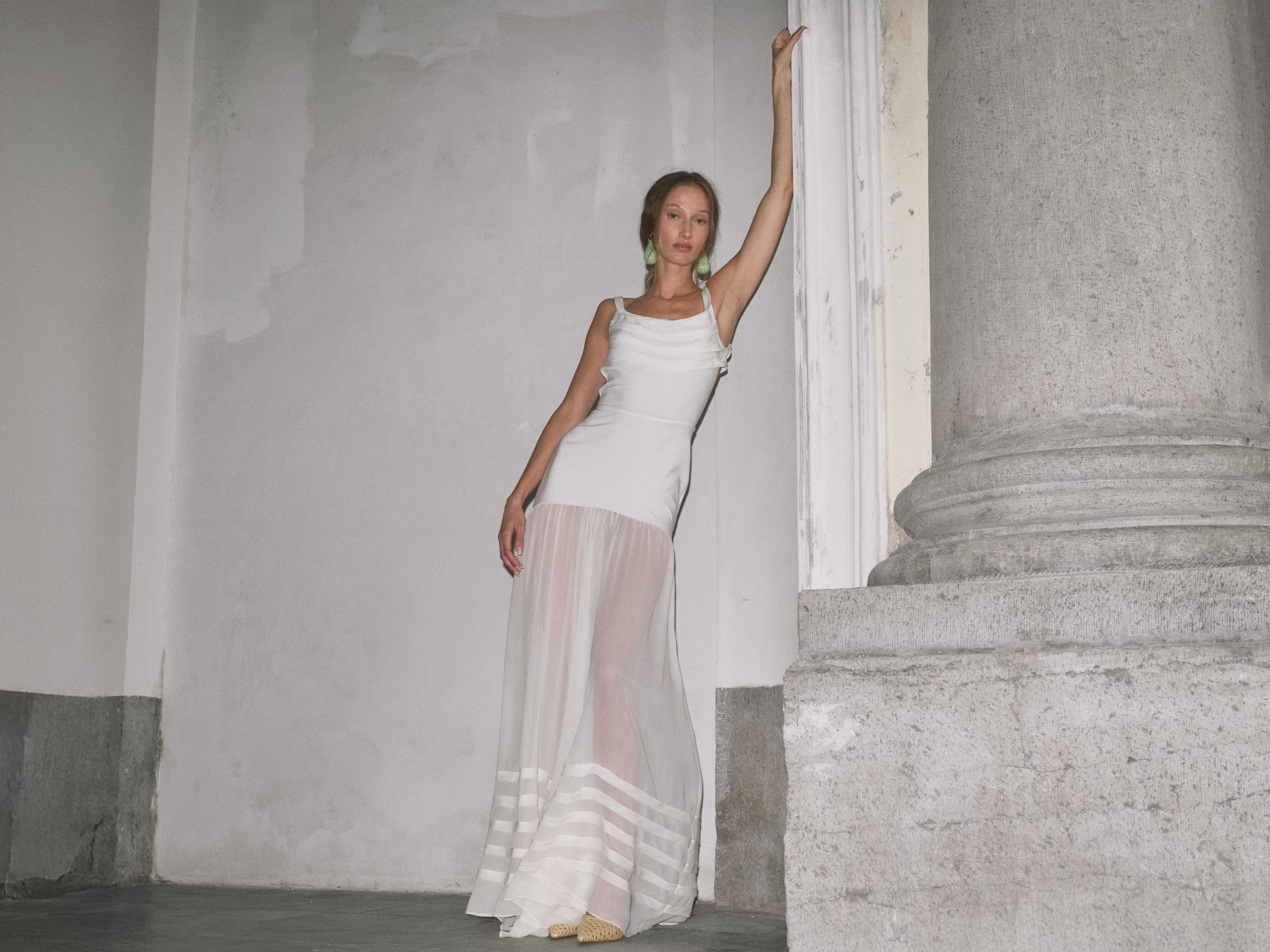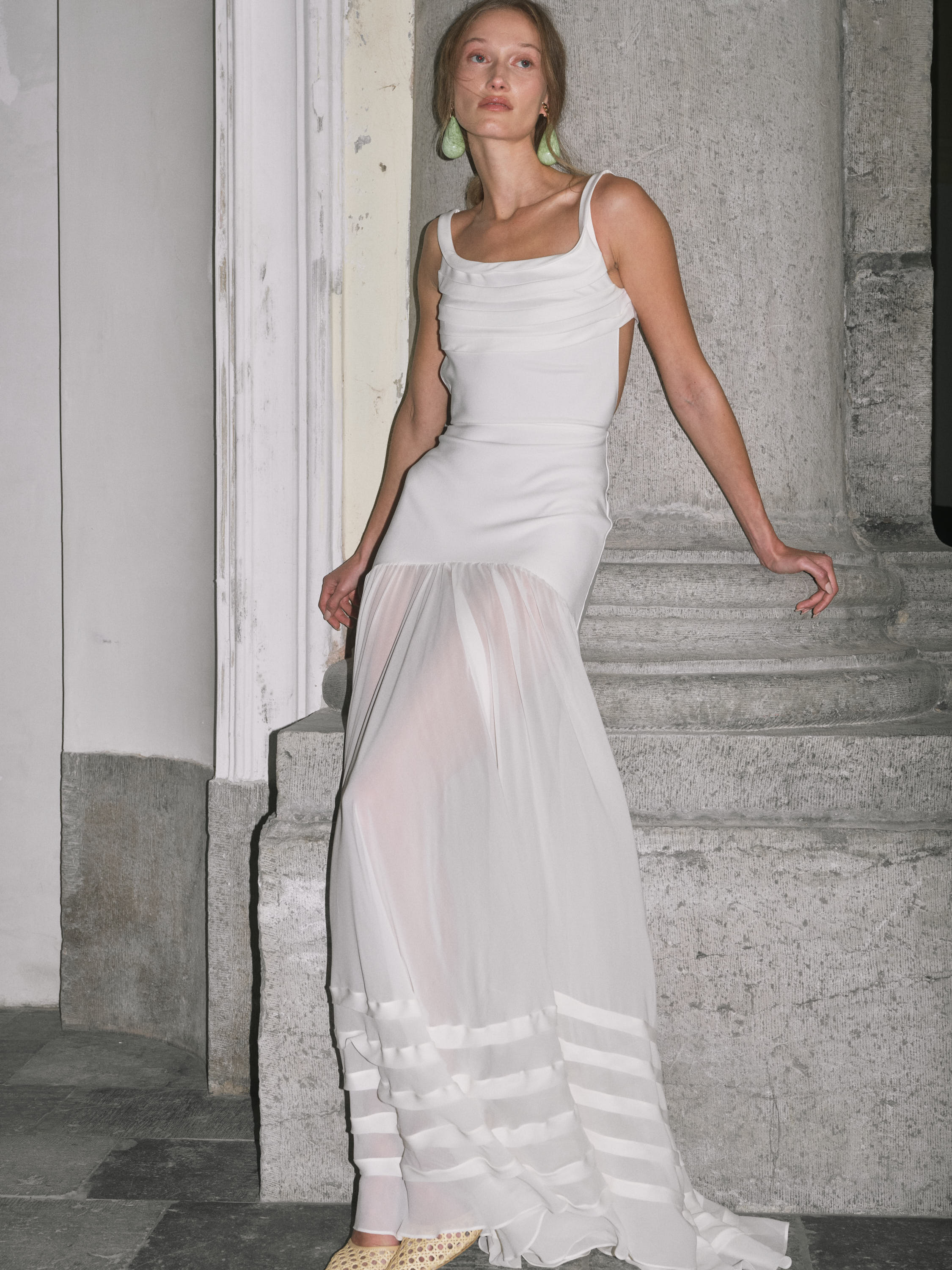 In porcelain crepe and sheer georgette, Teresa carries the warmth of high summer, restraint dissolving into radiance. Draped bands frame the shoulders and bust before revealing an open back. Fitted close through waist and hips, the drop waist releases into a sheer skirt, lightly gathered and traced at the hem with horizontal bands that mirror the rhythm above. A silhouette of renewal.