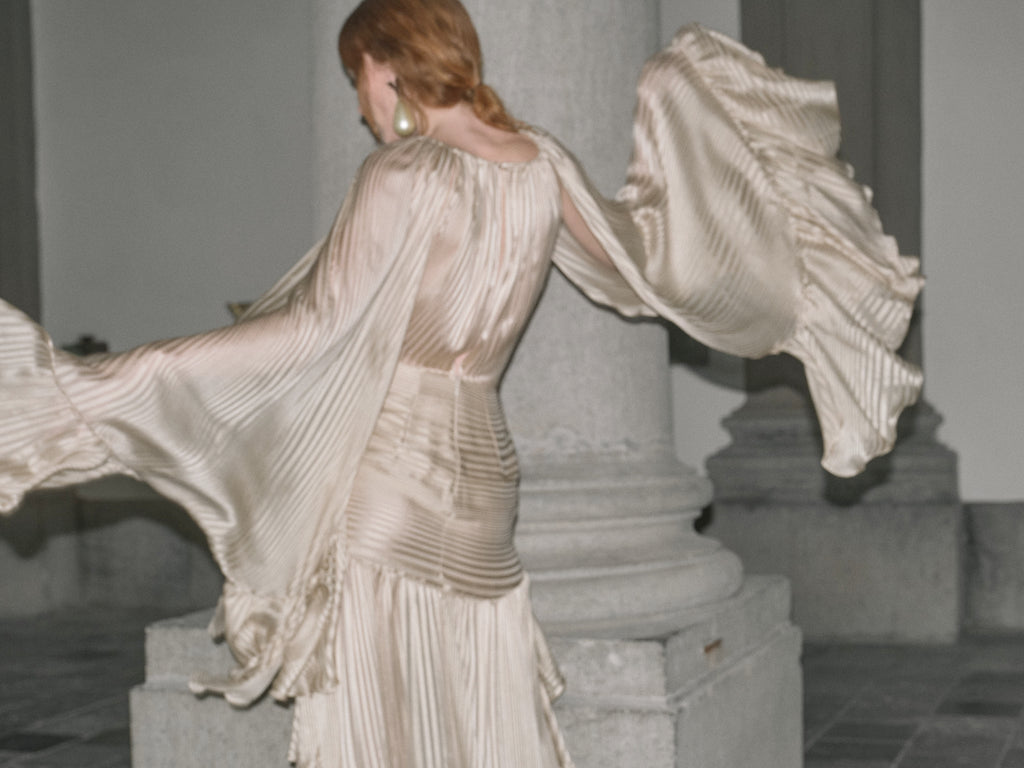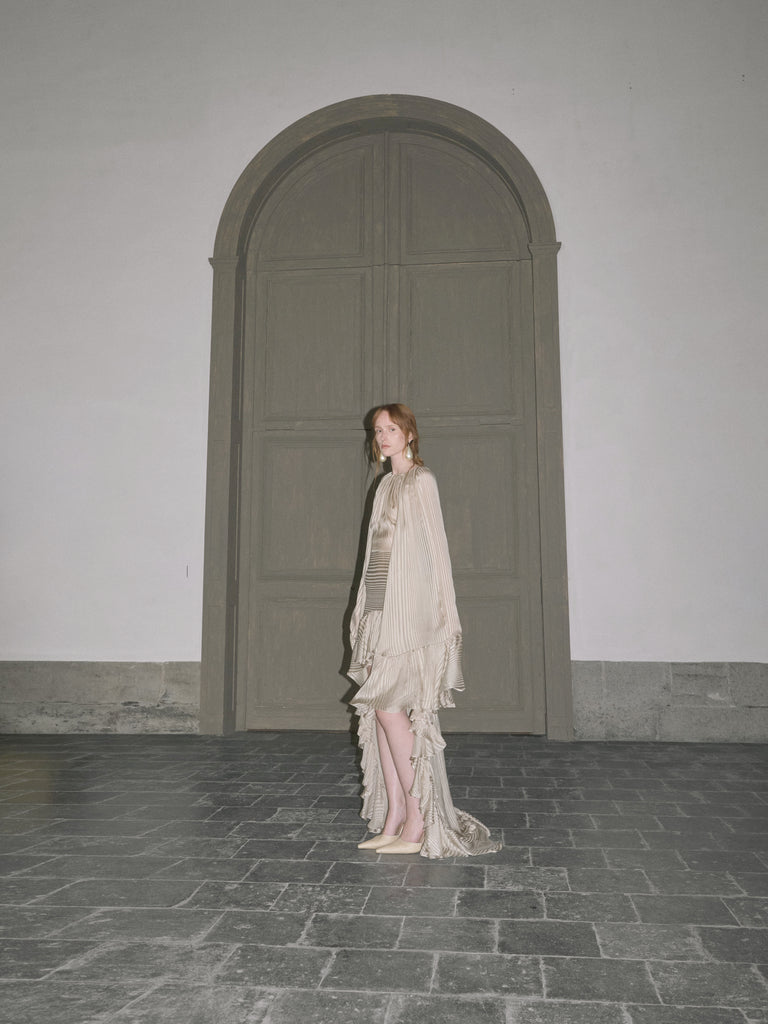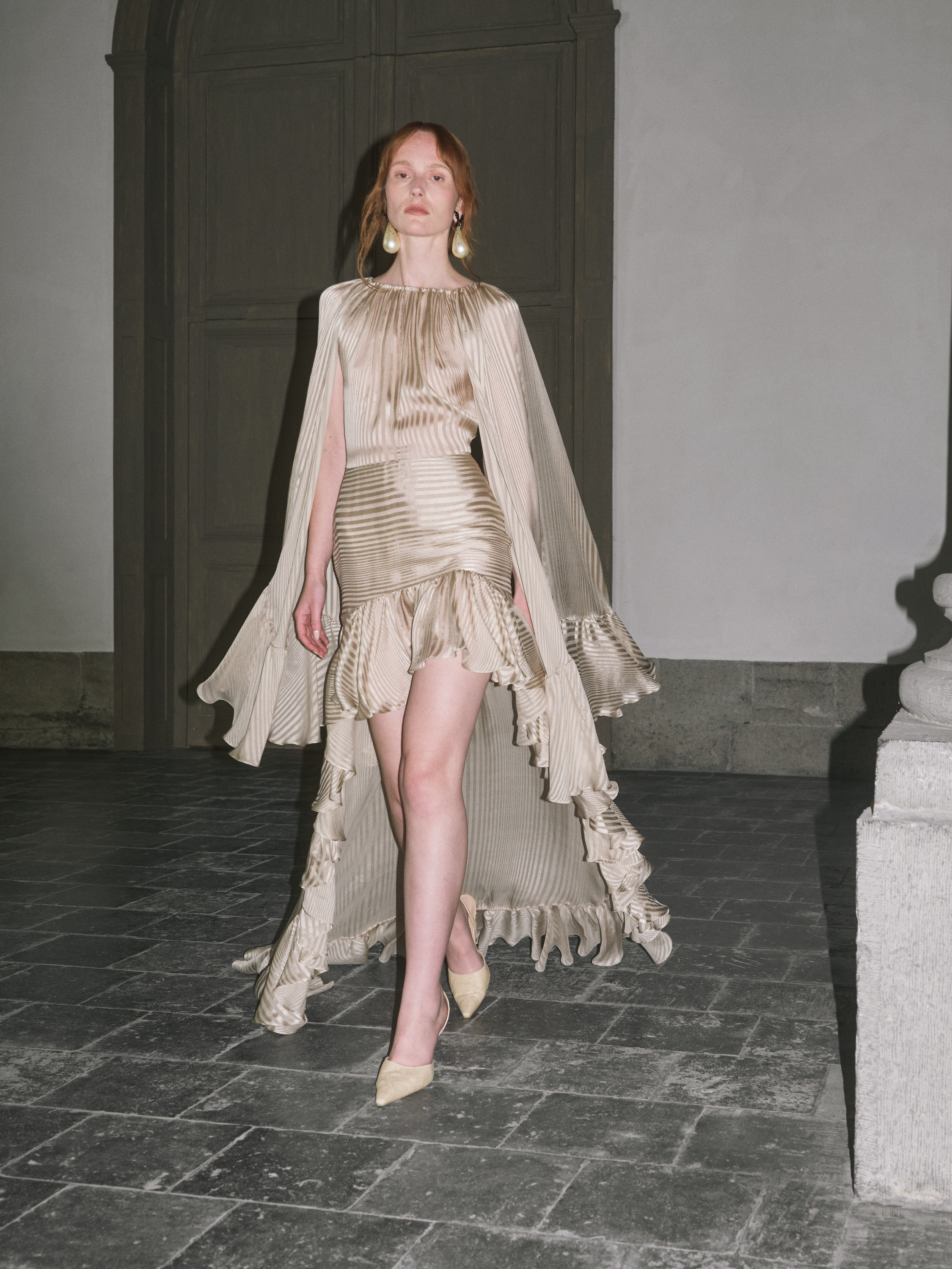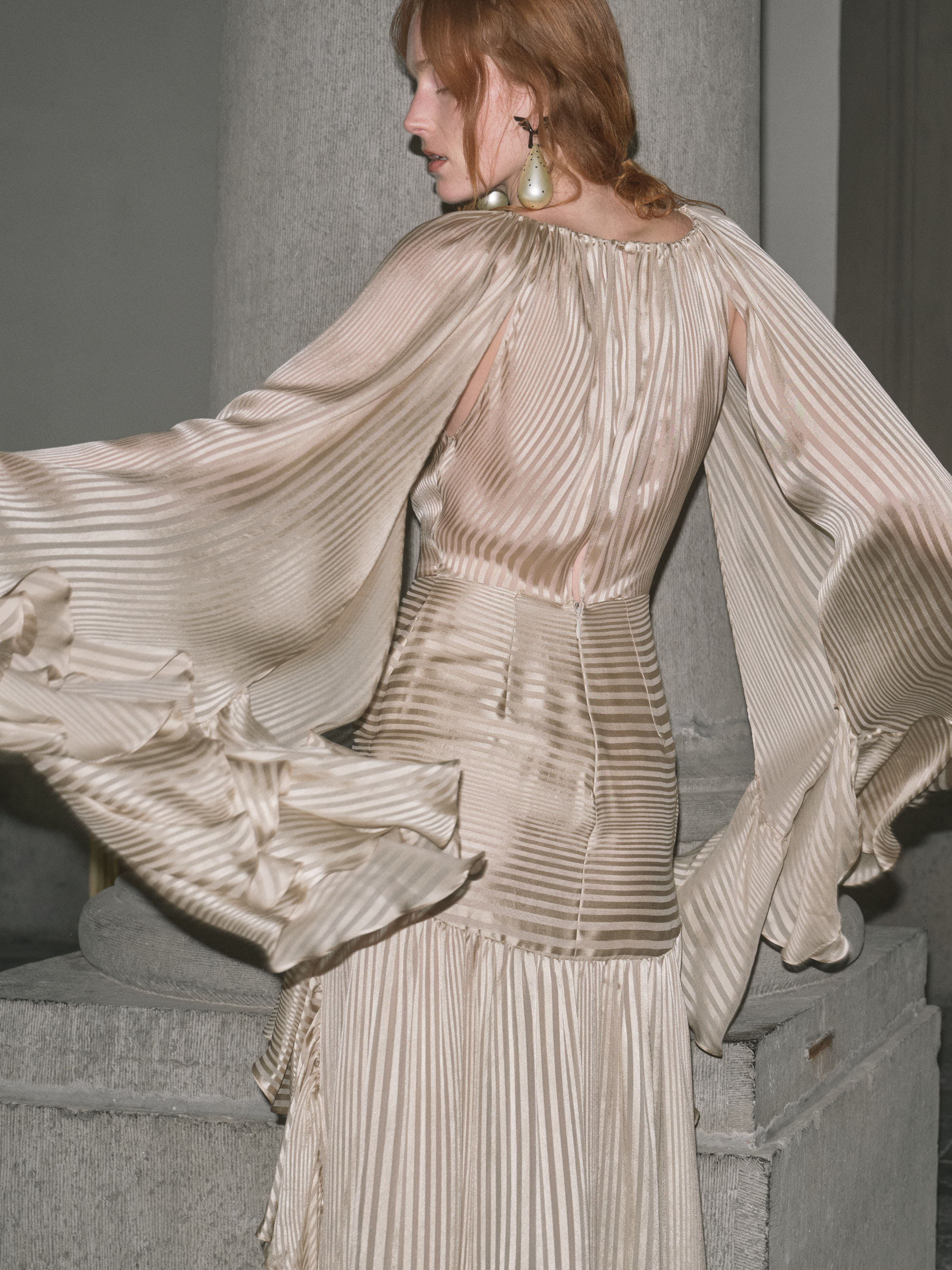 The ease of a breeze caught in silk, Vionetta’s surface shifts between satin and chiffon stripes in a muted greige. The neckline gathers softly at the bust, shaping a bodice that opens into wide sleeves edged in ruffles. A high-low skirt cascades in tiered flounces that fall to a sweeping train.