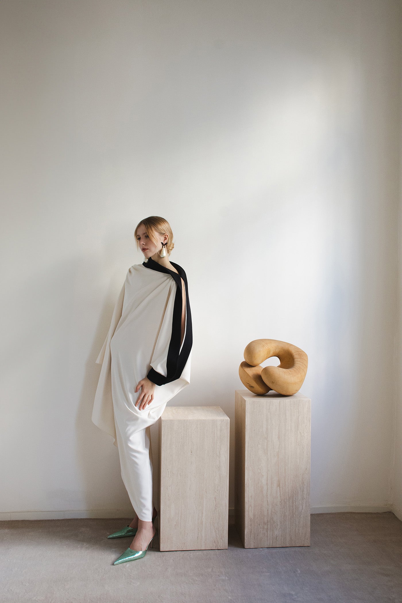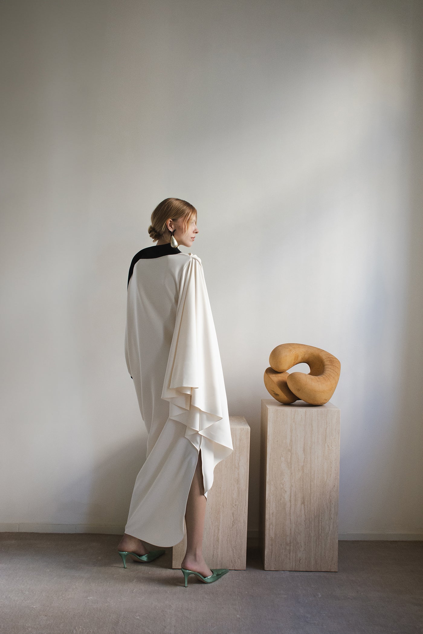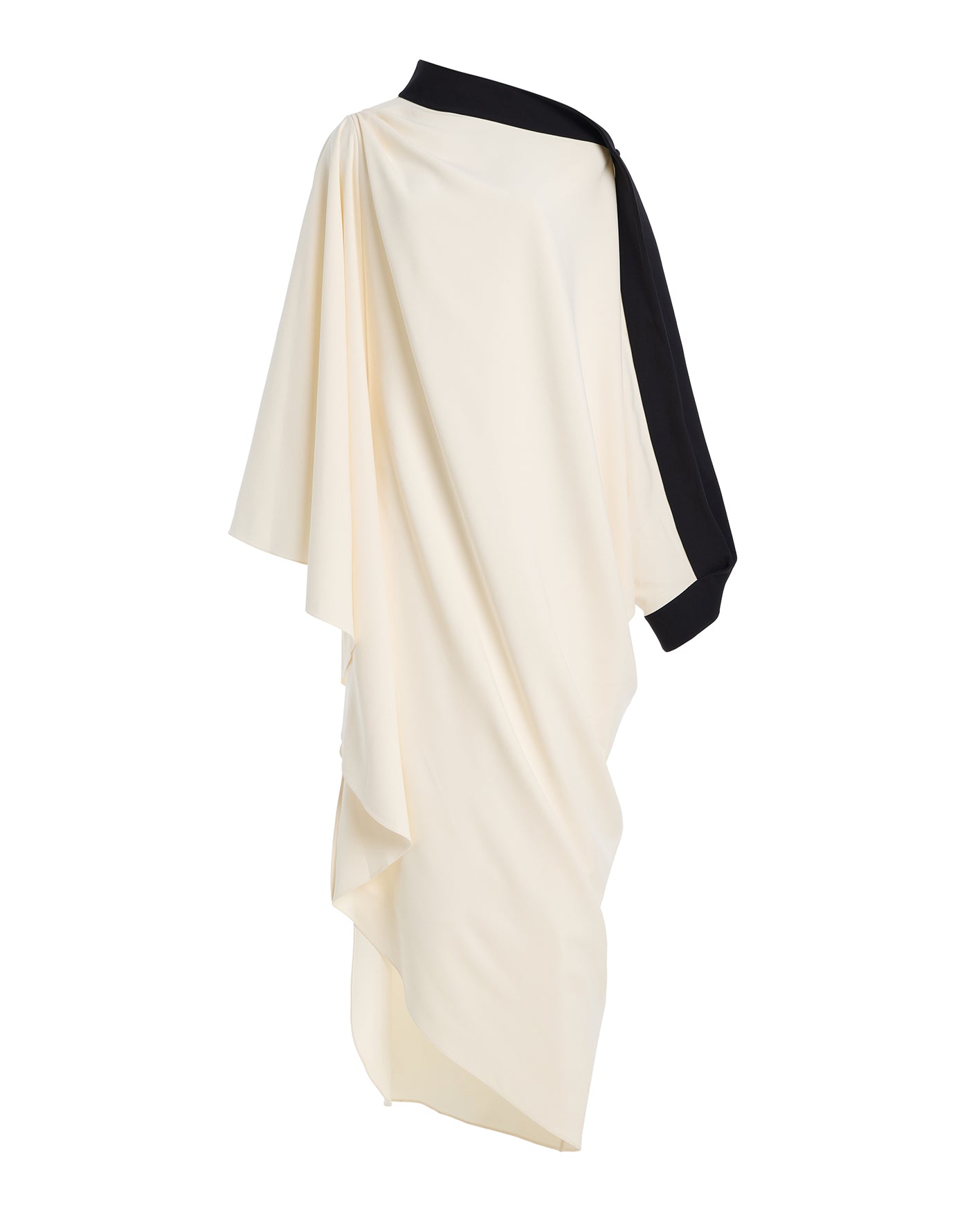 - Contrast border, asymmetric split sleeve, draped, maxi hem