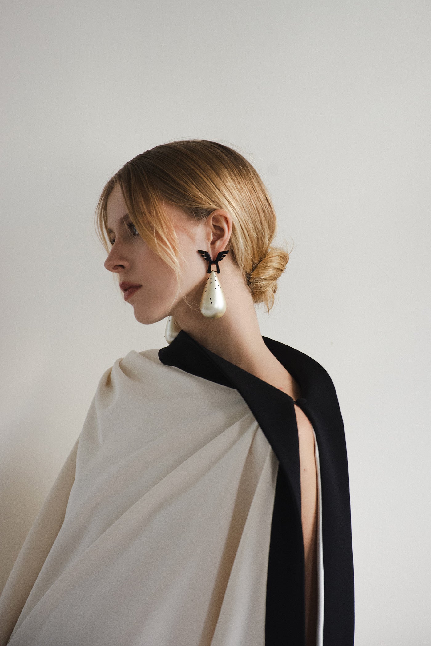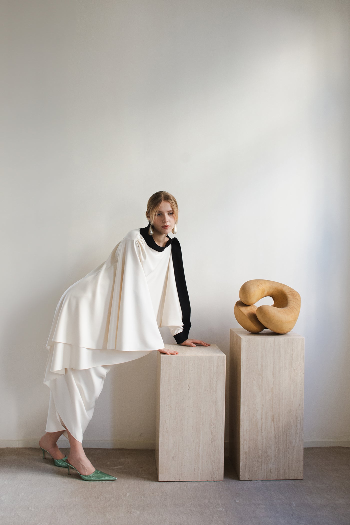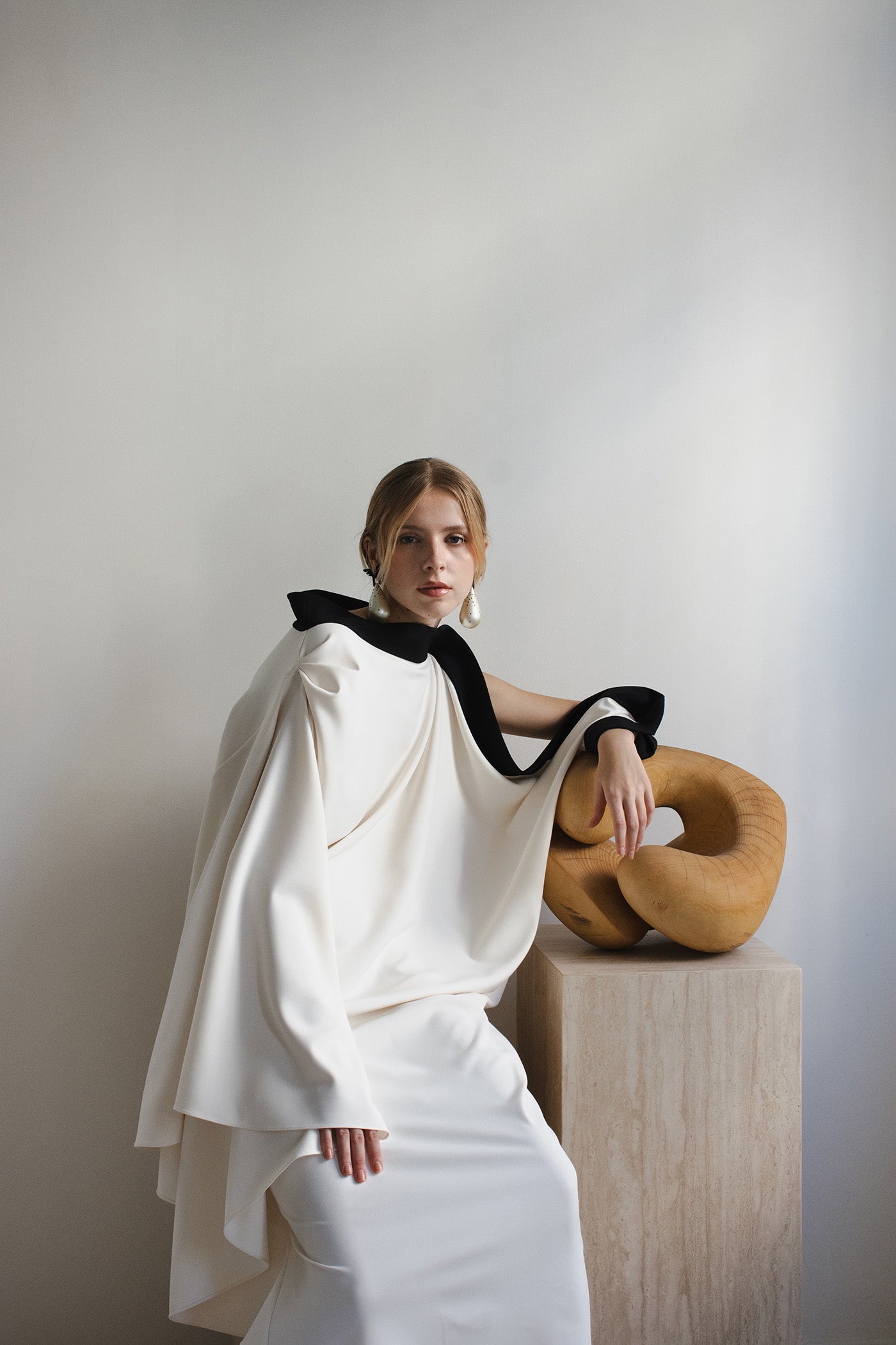 - Contrast border, asymmetric split sleeve, draped, maxi hem