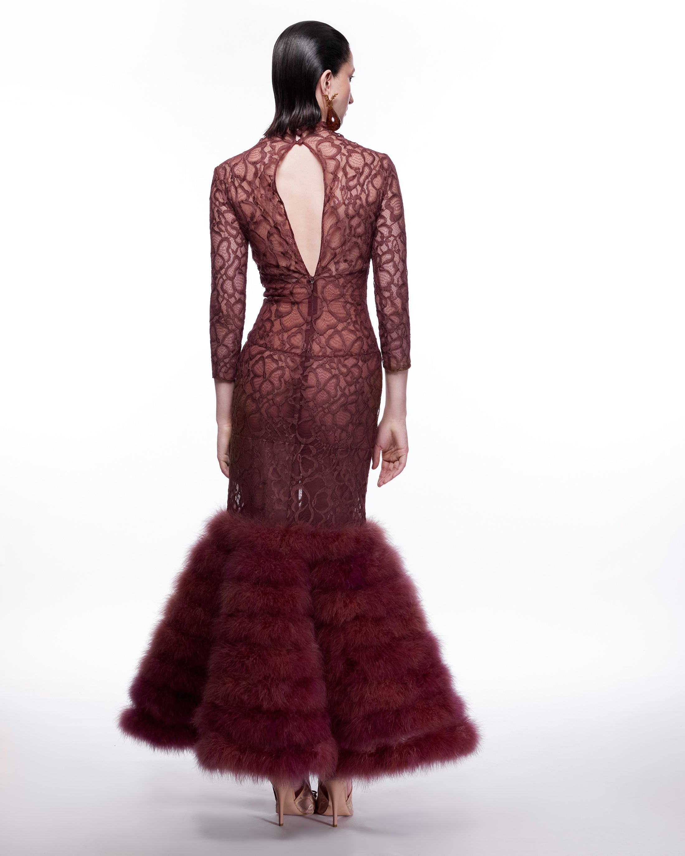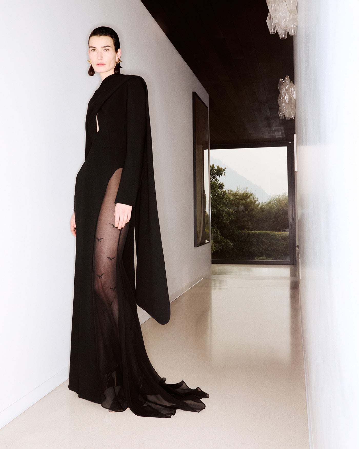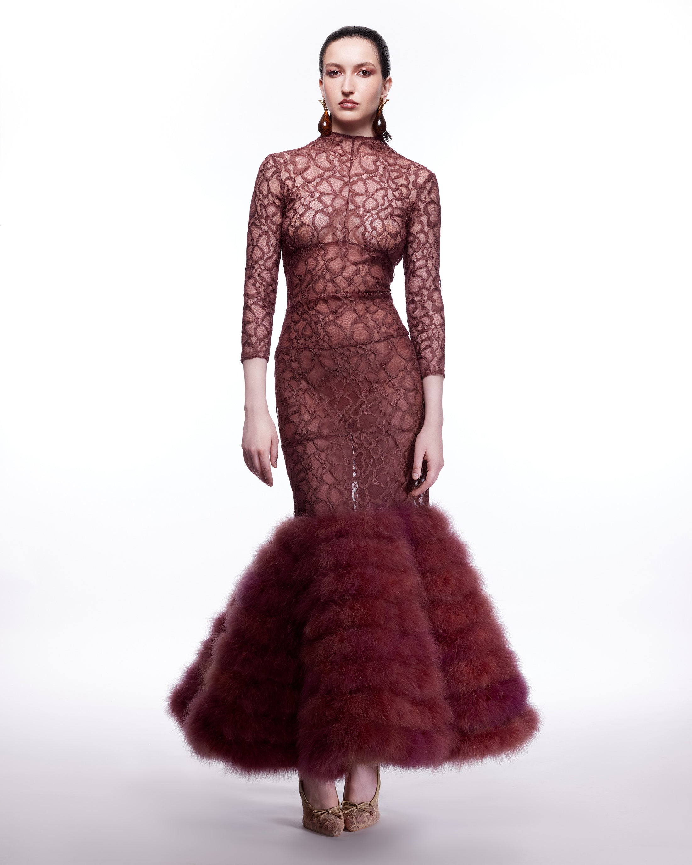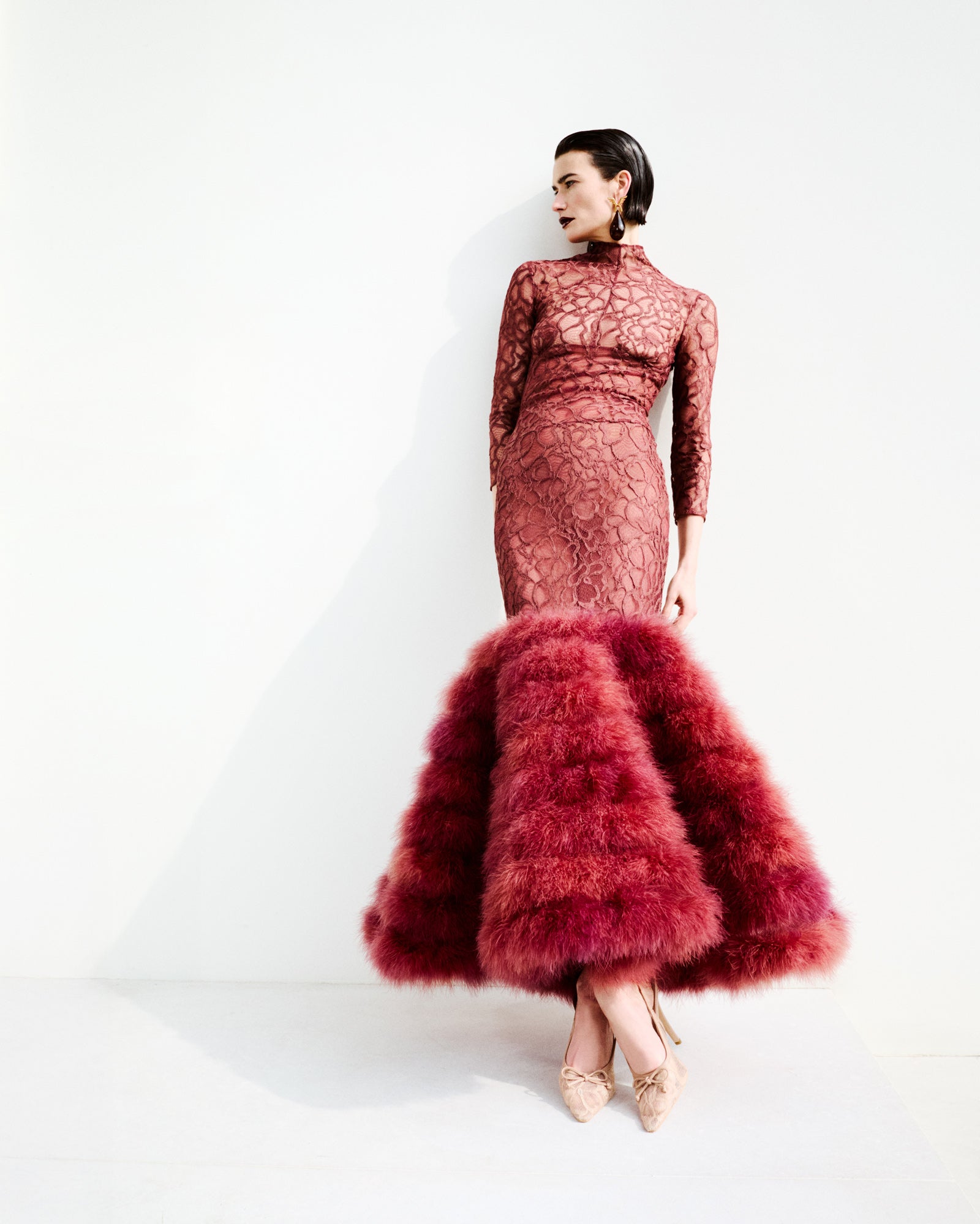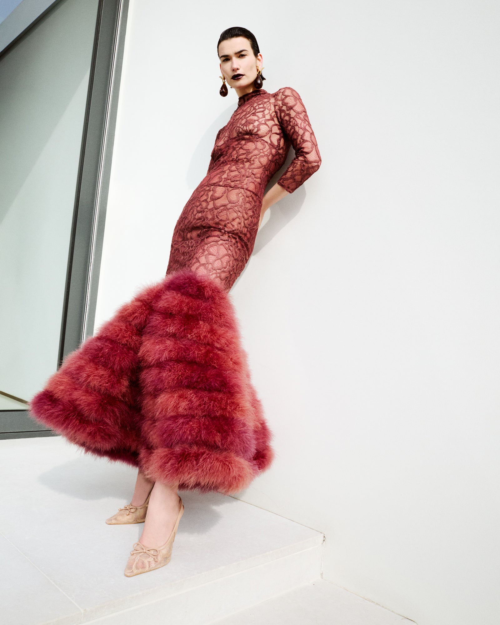 Exploring the many facets of womanhood, the collection reimagines classic silhouettes through a modern lens. Sculpted hourglass tailoring, signature teardrop openings, and plumed gowns in nude rosé and wine lace define the season’s vision of strength and sensuality.