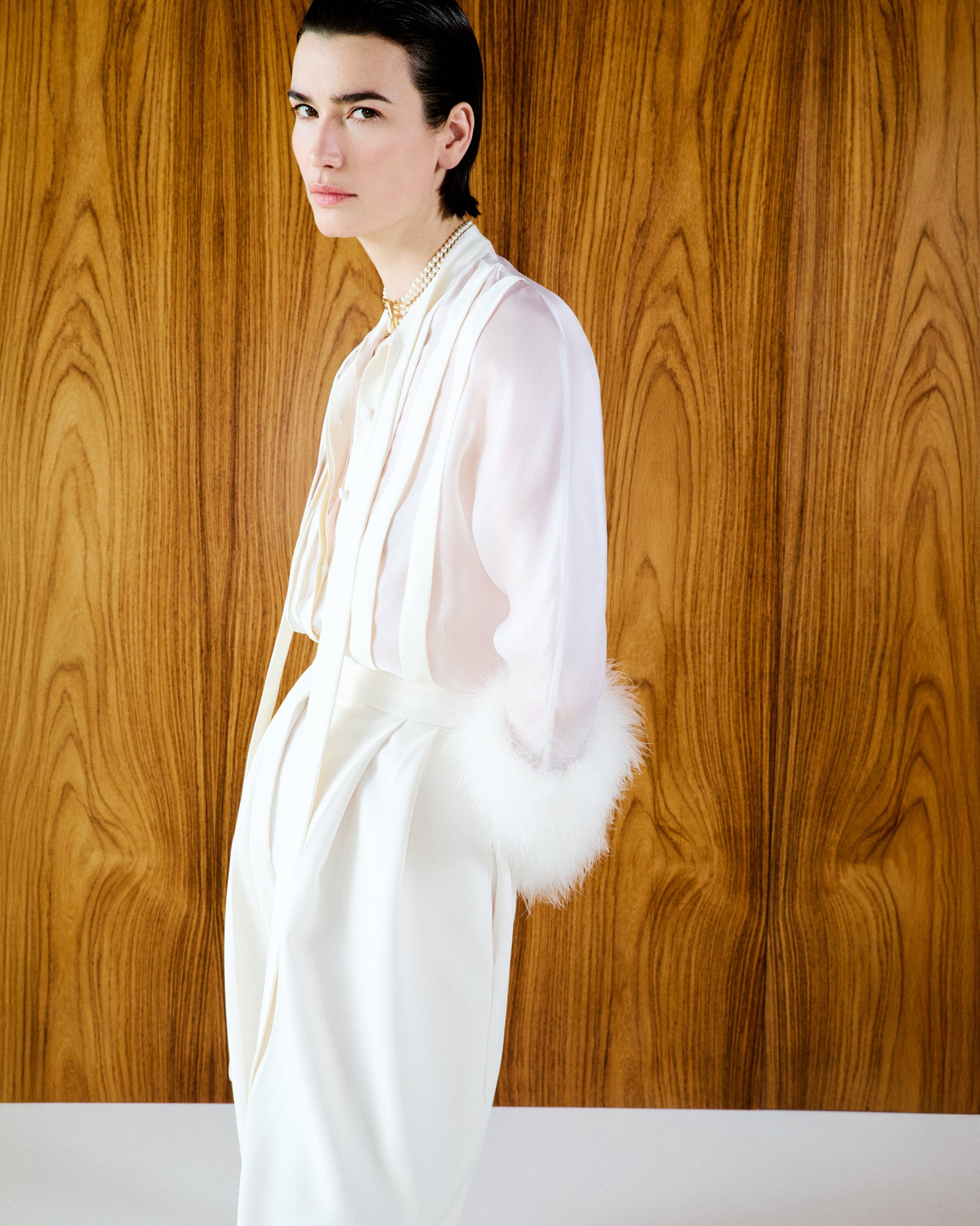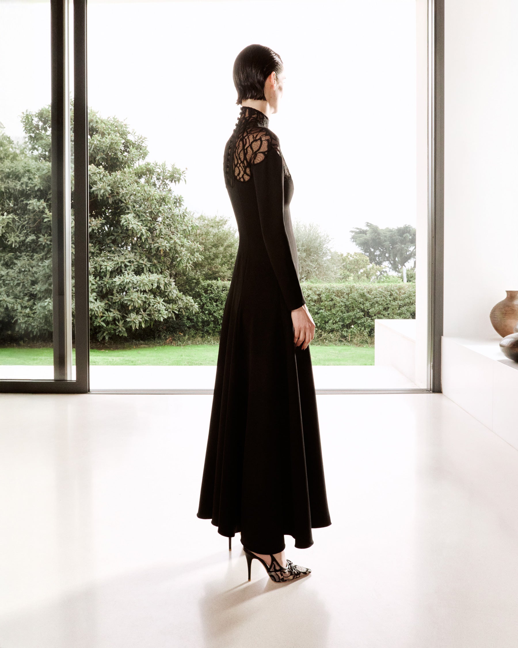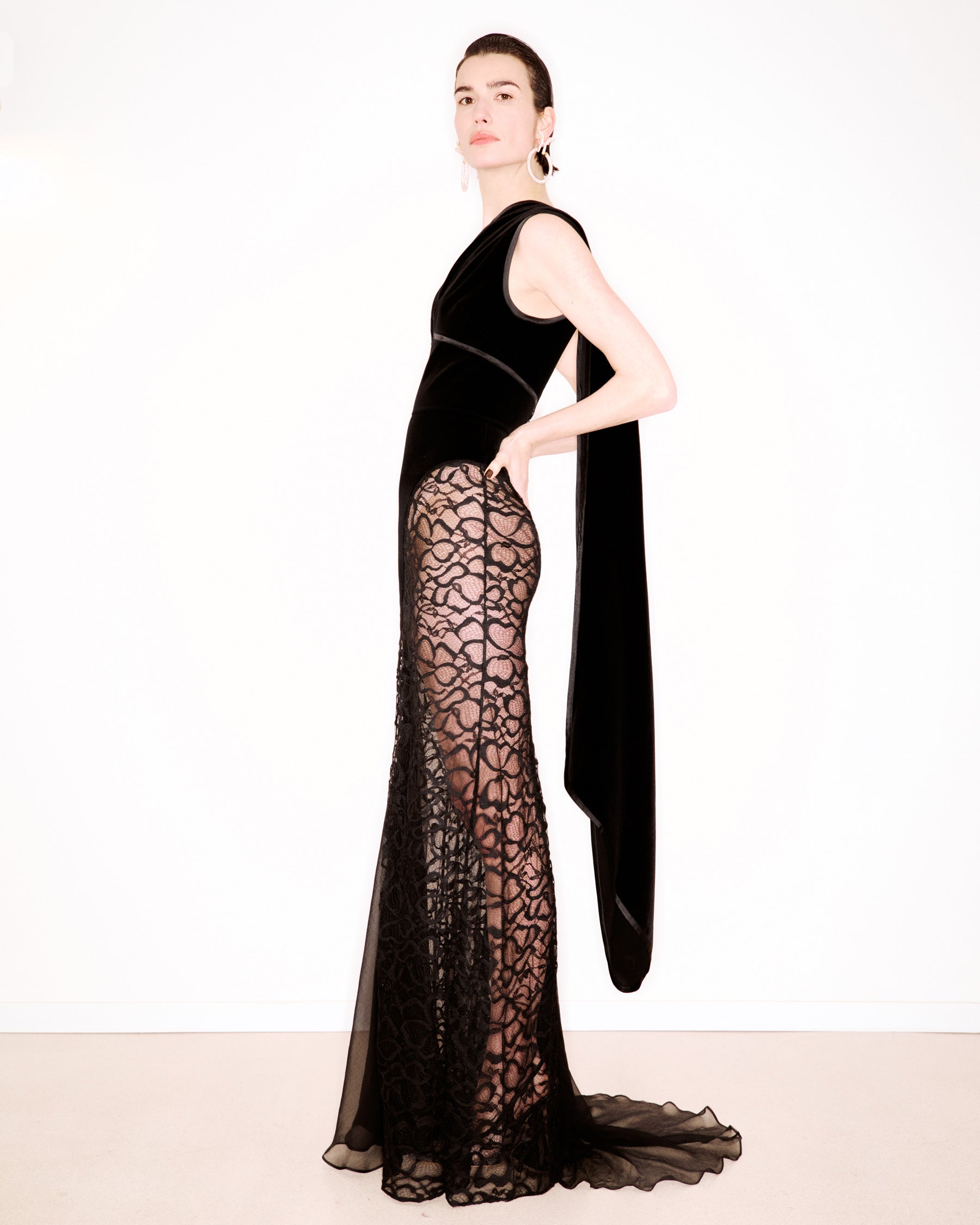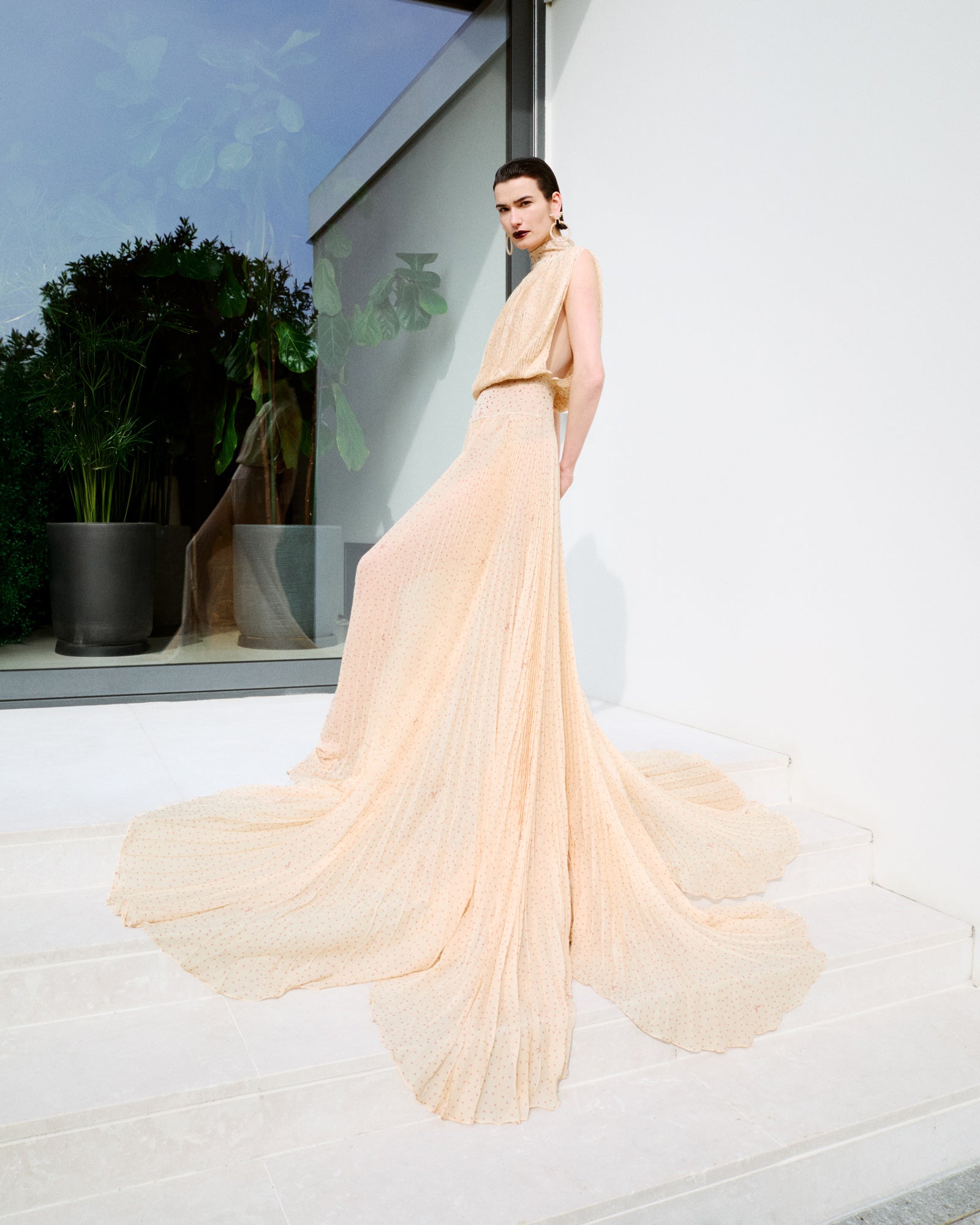 Exploring the many facets of womanhood, the collection reimagines classic silhouettes through a modern lens. Sculpted hourglass tailoring, signature teardrop openings, and plumed gowns in nude rosé and wine lace define the season’s vision of strength and sensuality.
