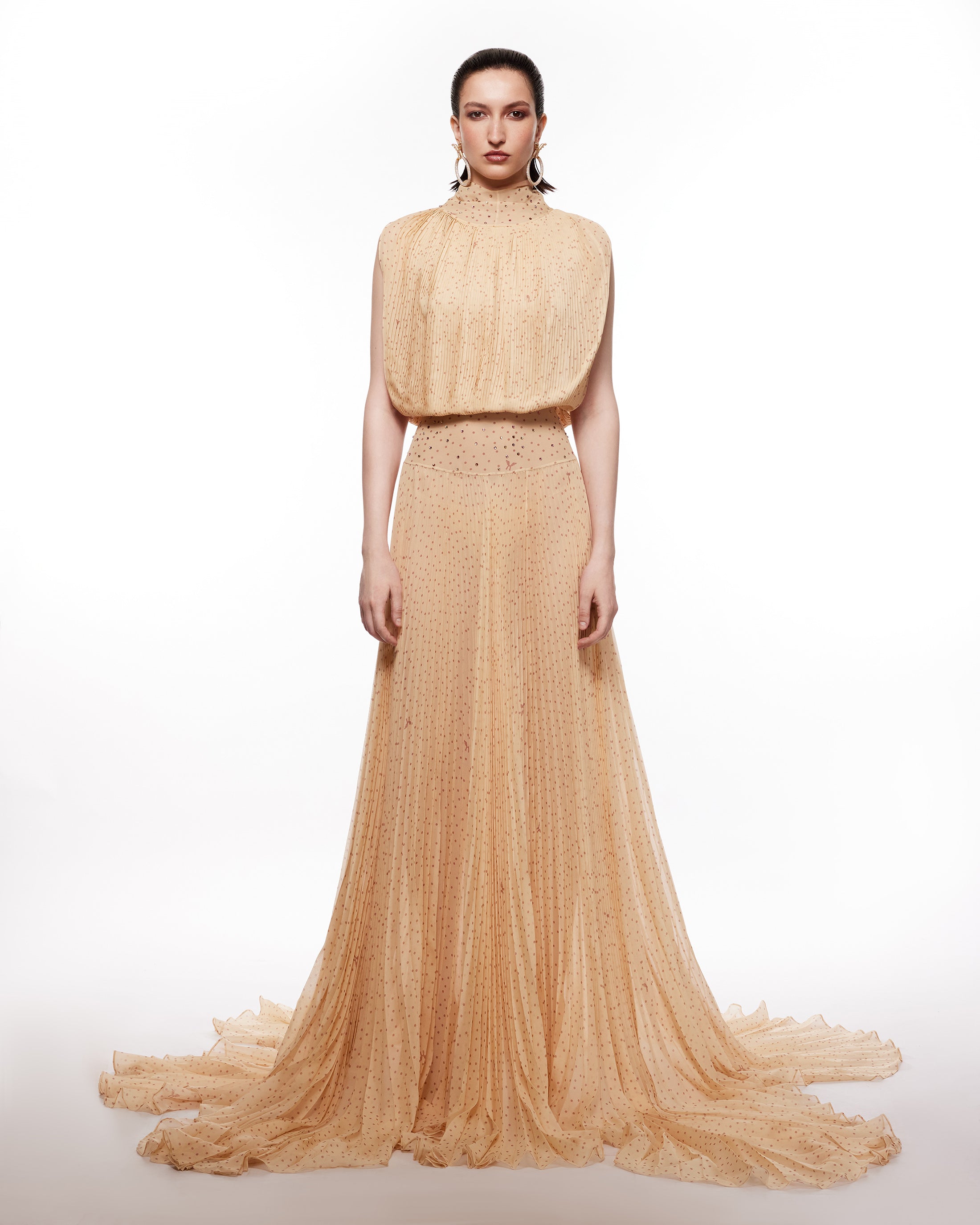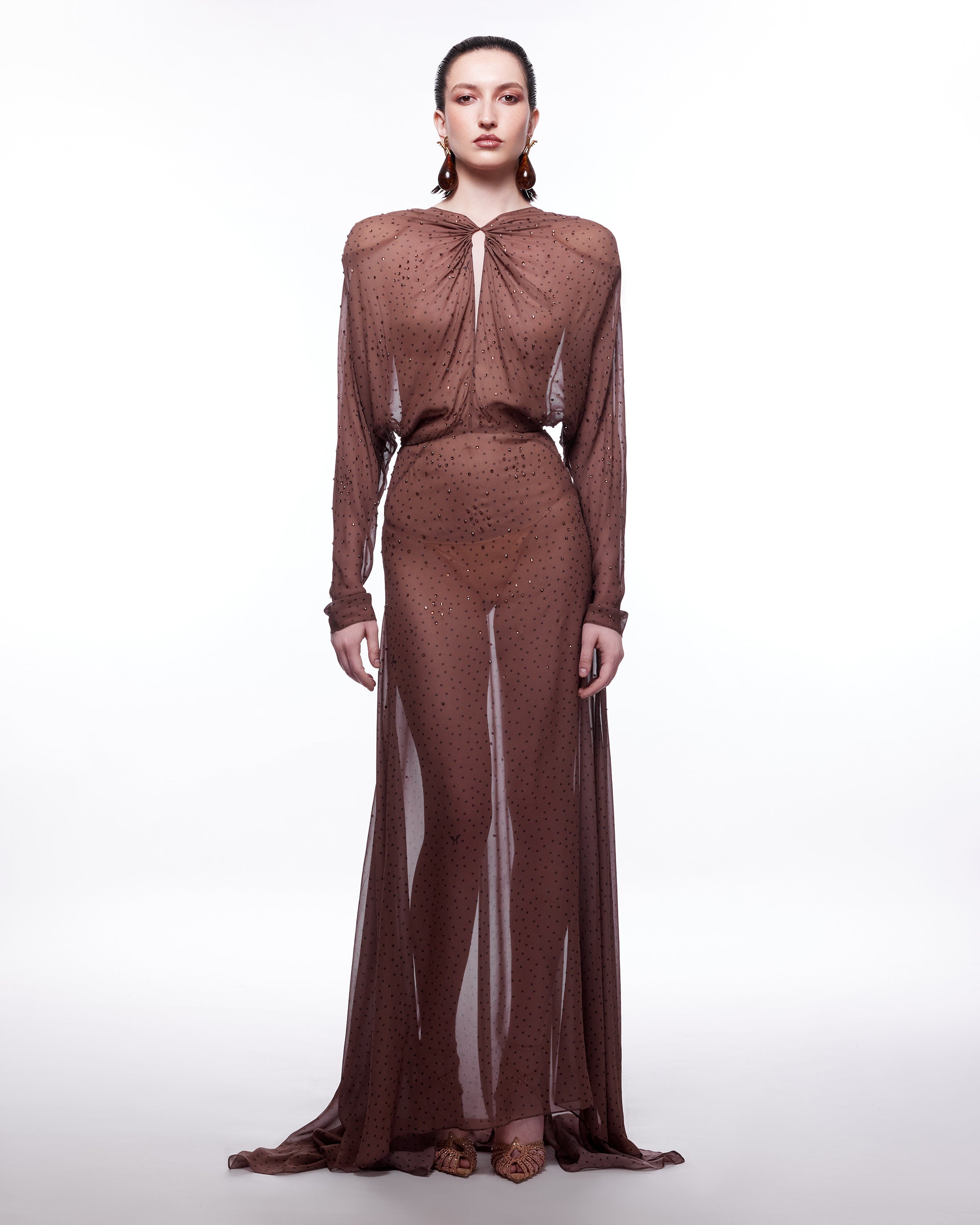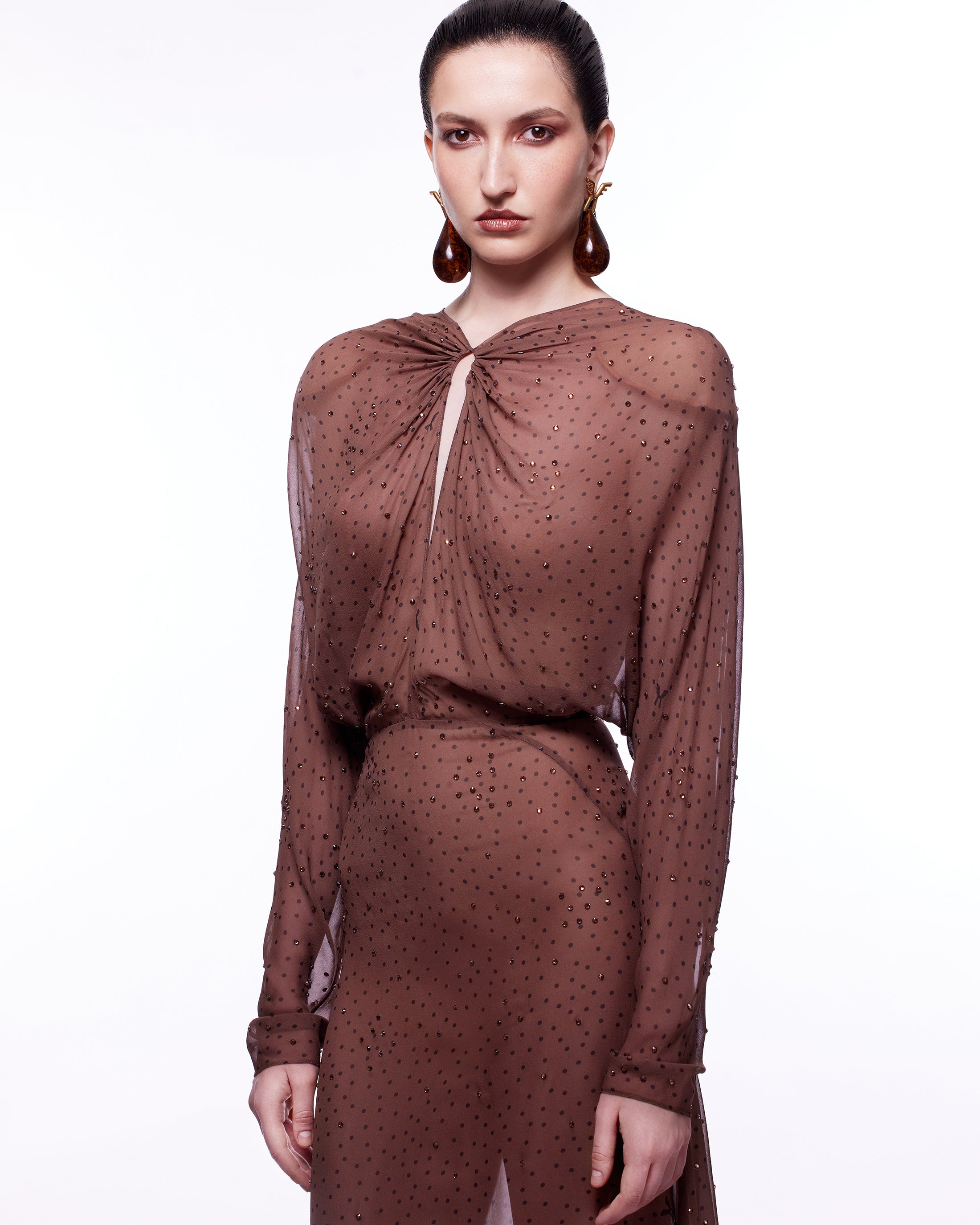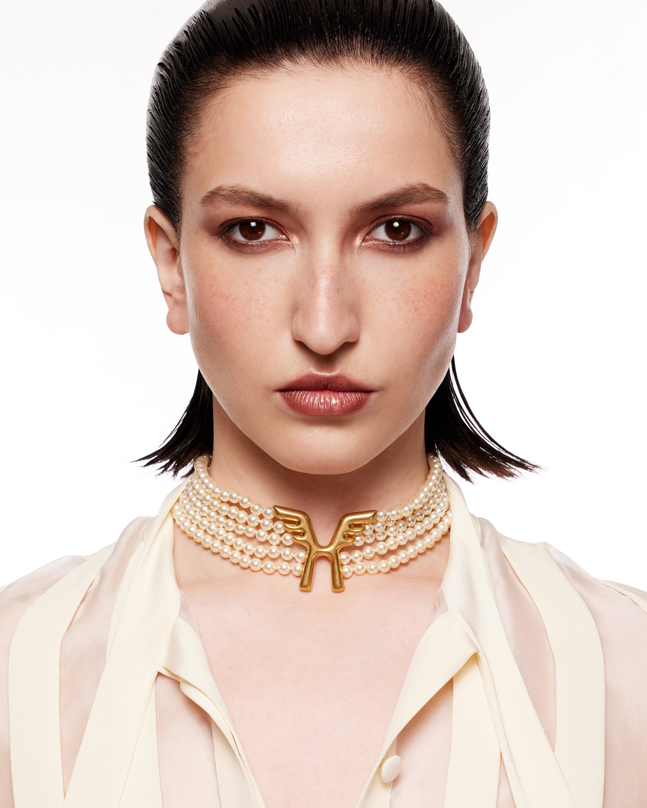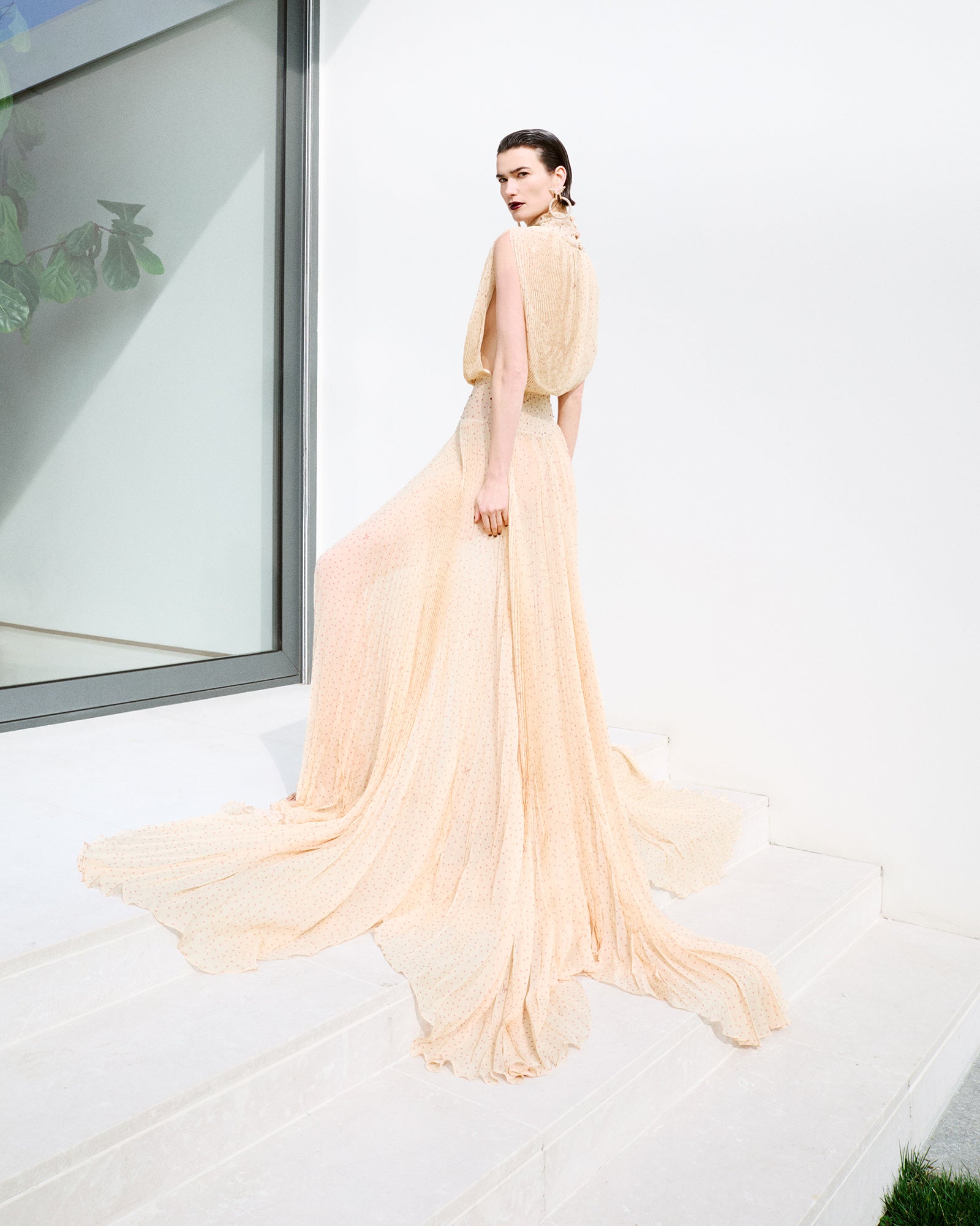 Exploring the many facets of womanhood, the collection reimagines classic silhouettes through a modern lens. Sculpted hourglass tailoring, signature teardrop openings, and plumed gowns in nude rosé and wine lace define the season’s vision of strength and sensuality.