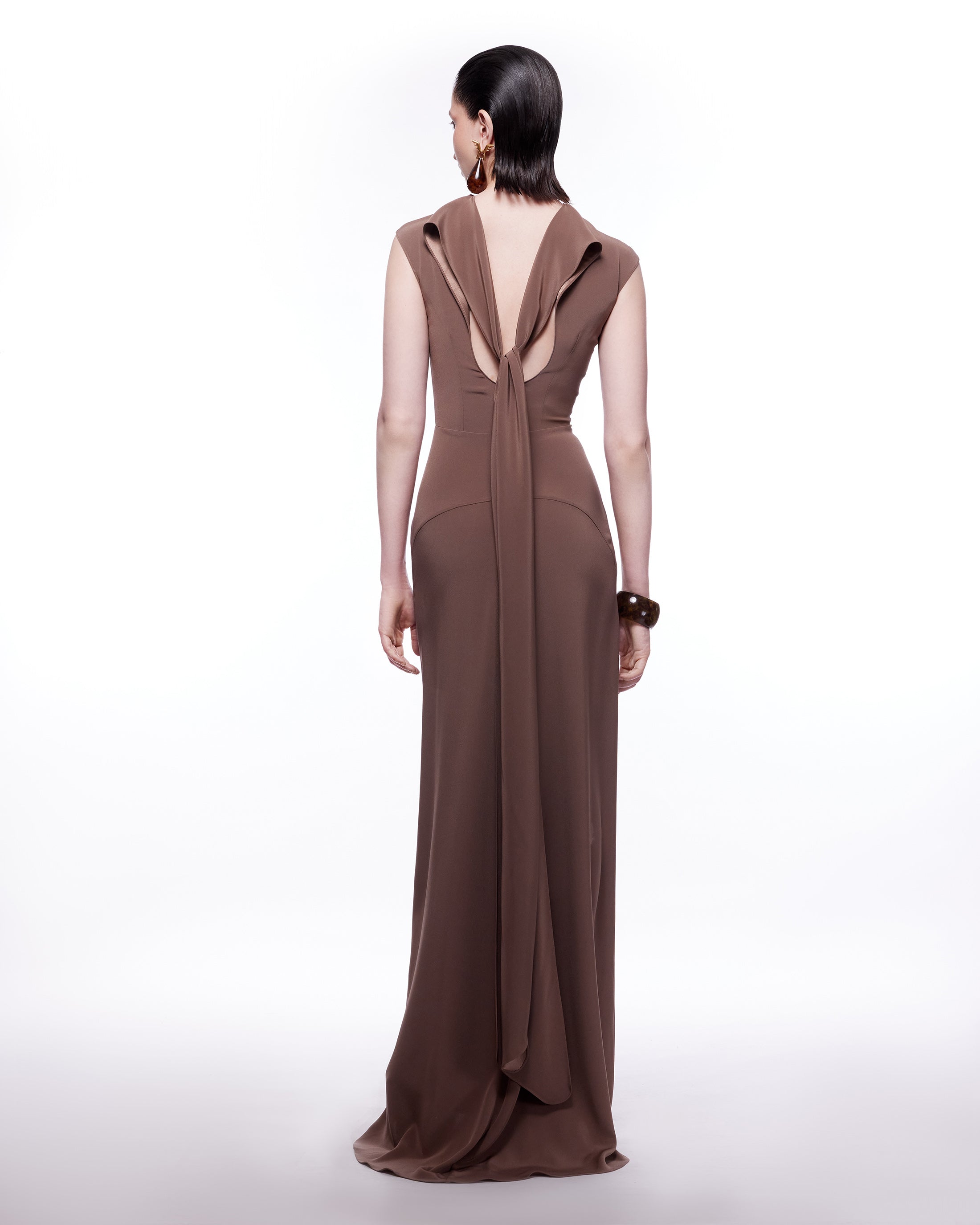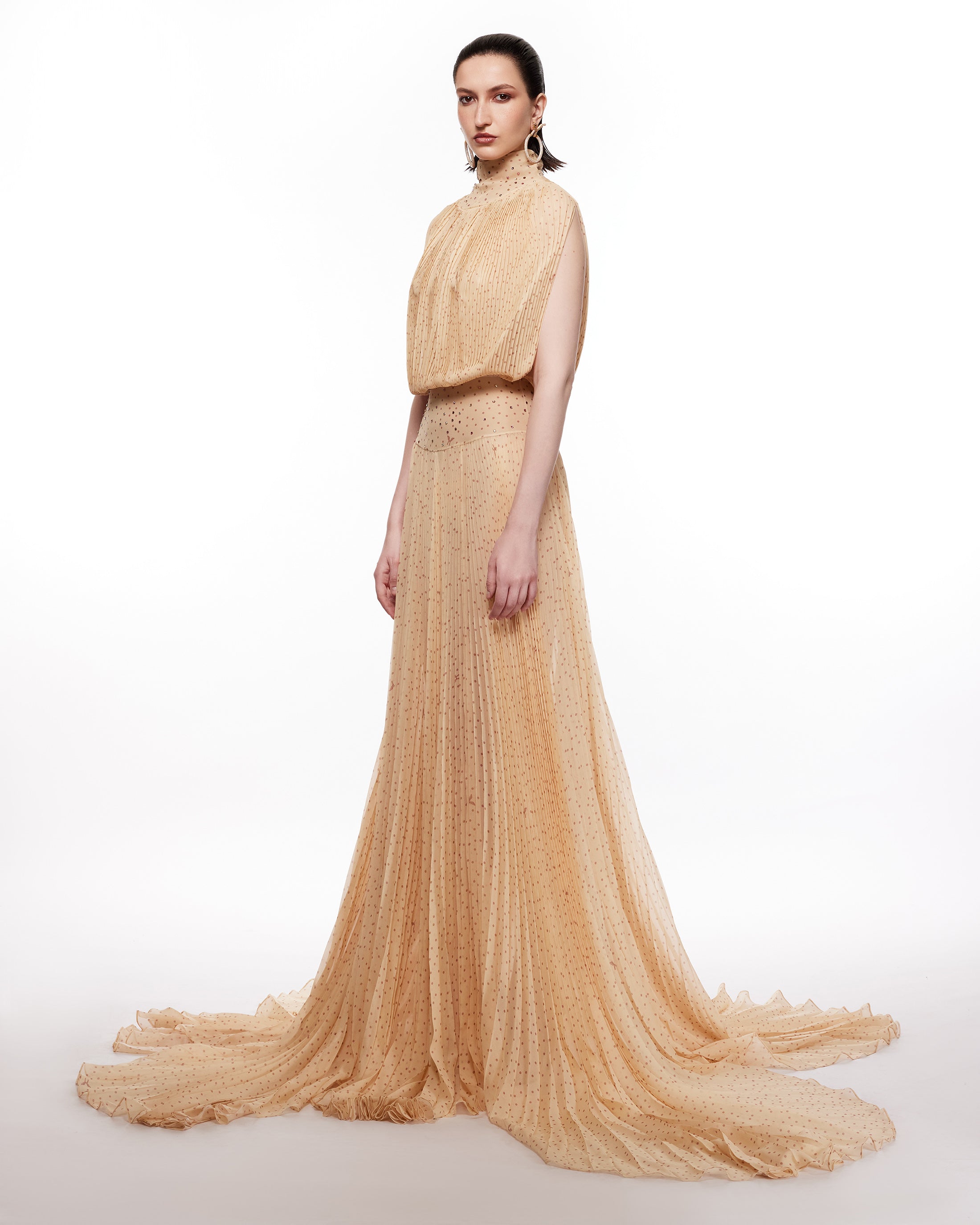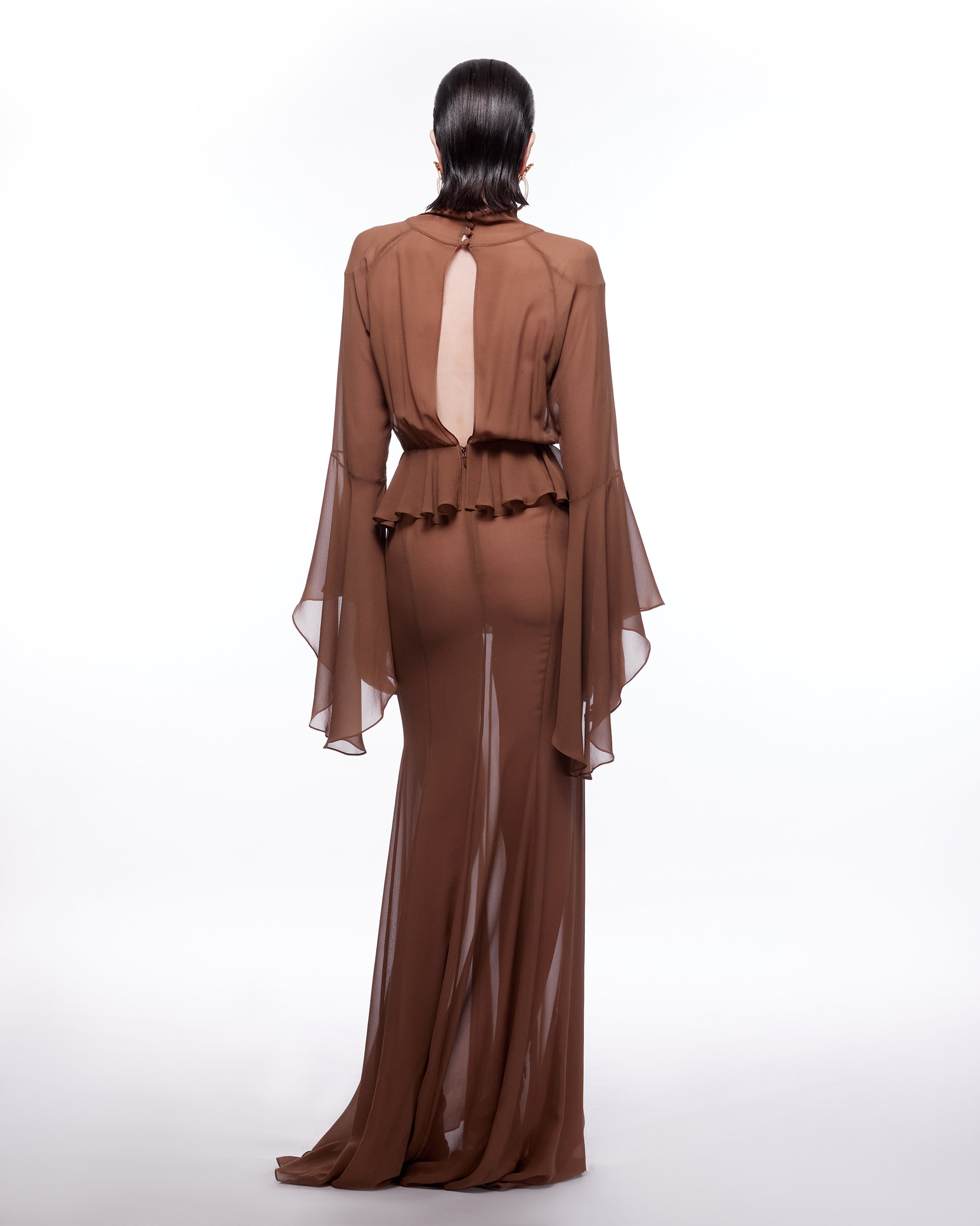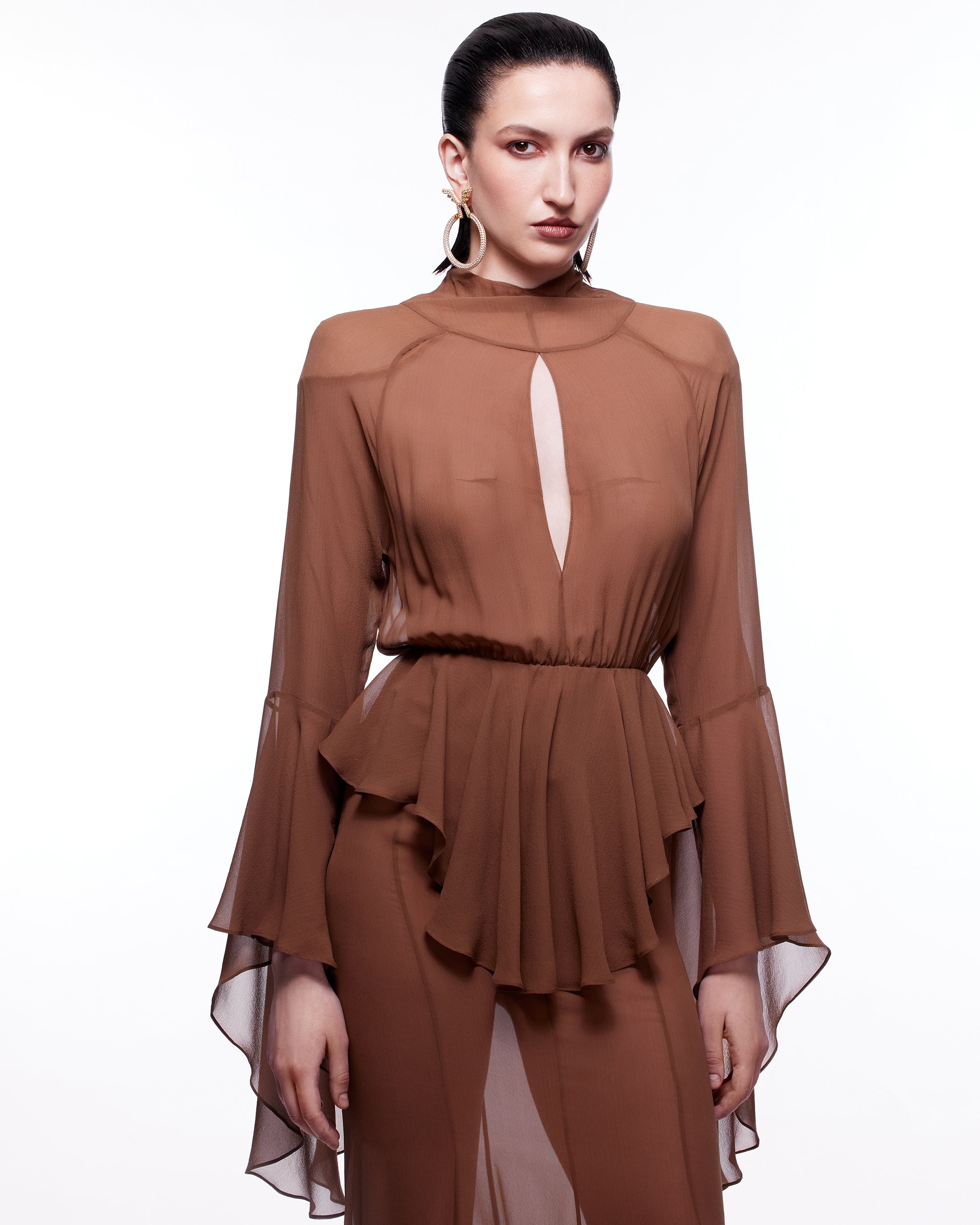 Exploring the many facets of womanhood, the collection reimagines classic silhouettes through a modern lens. Sculpted hourglass tailoring, signature teardrop openings, and plumed gowns in nude rosé and wine lace define the season’s vision of strength and sensuality.