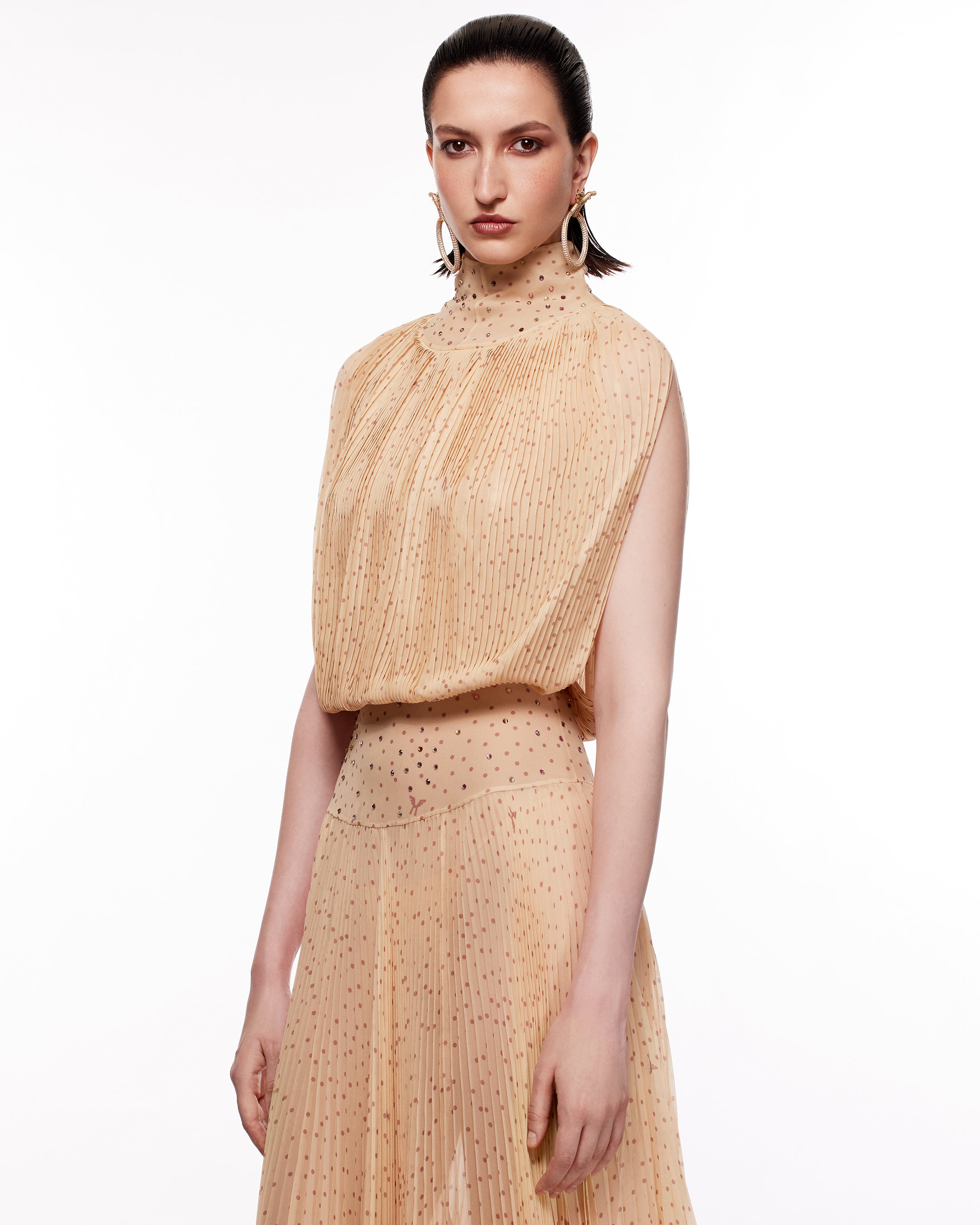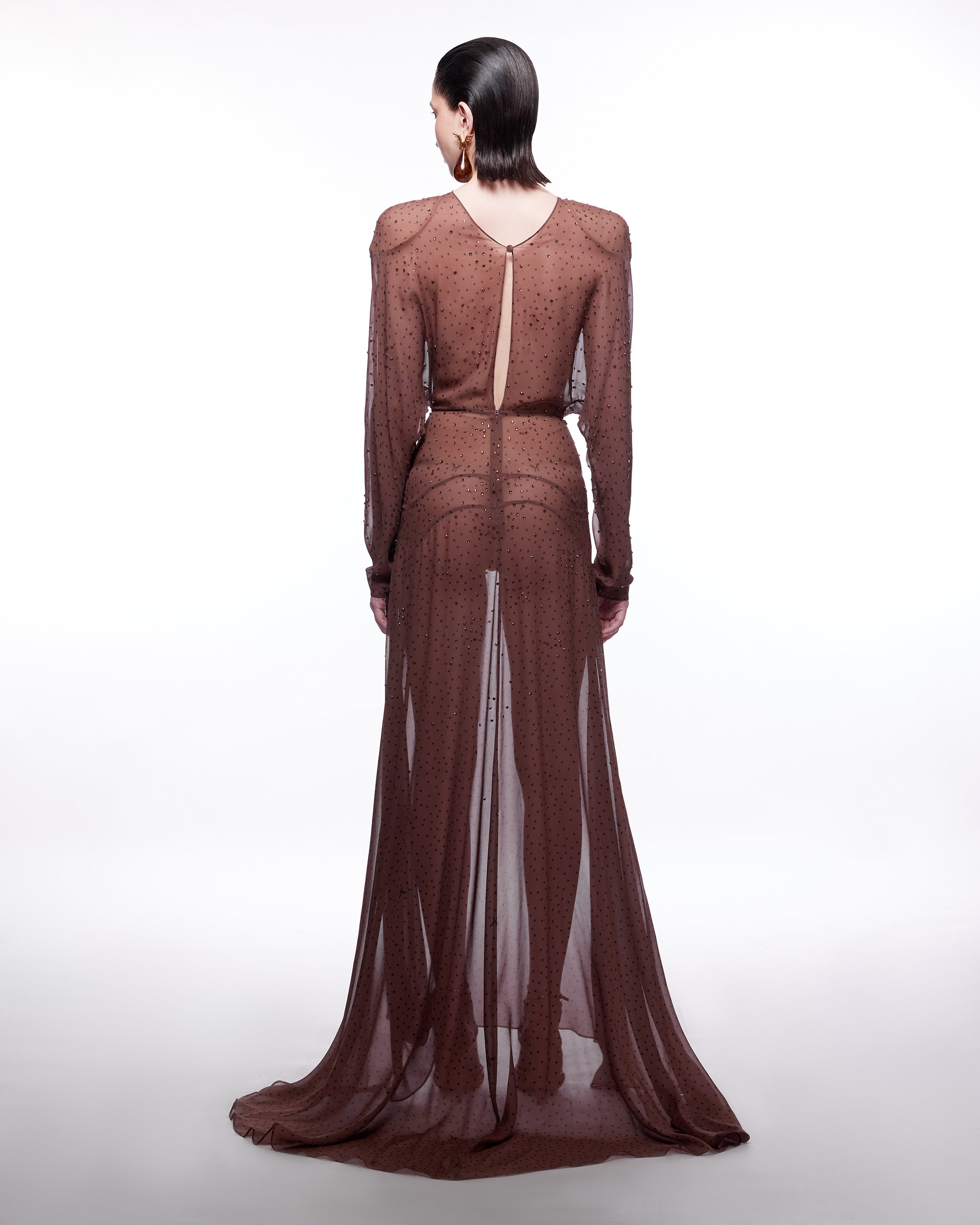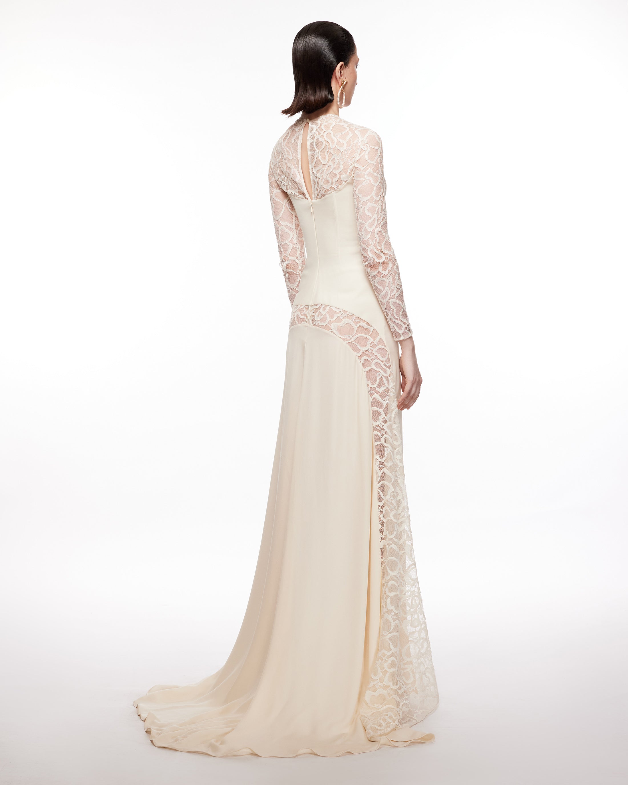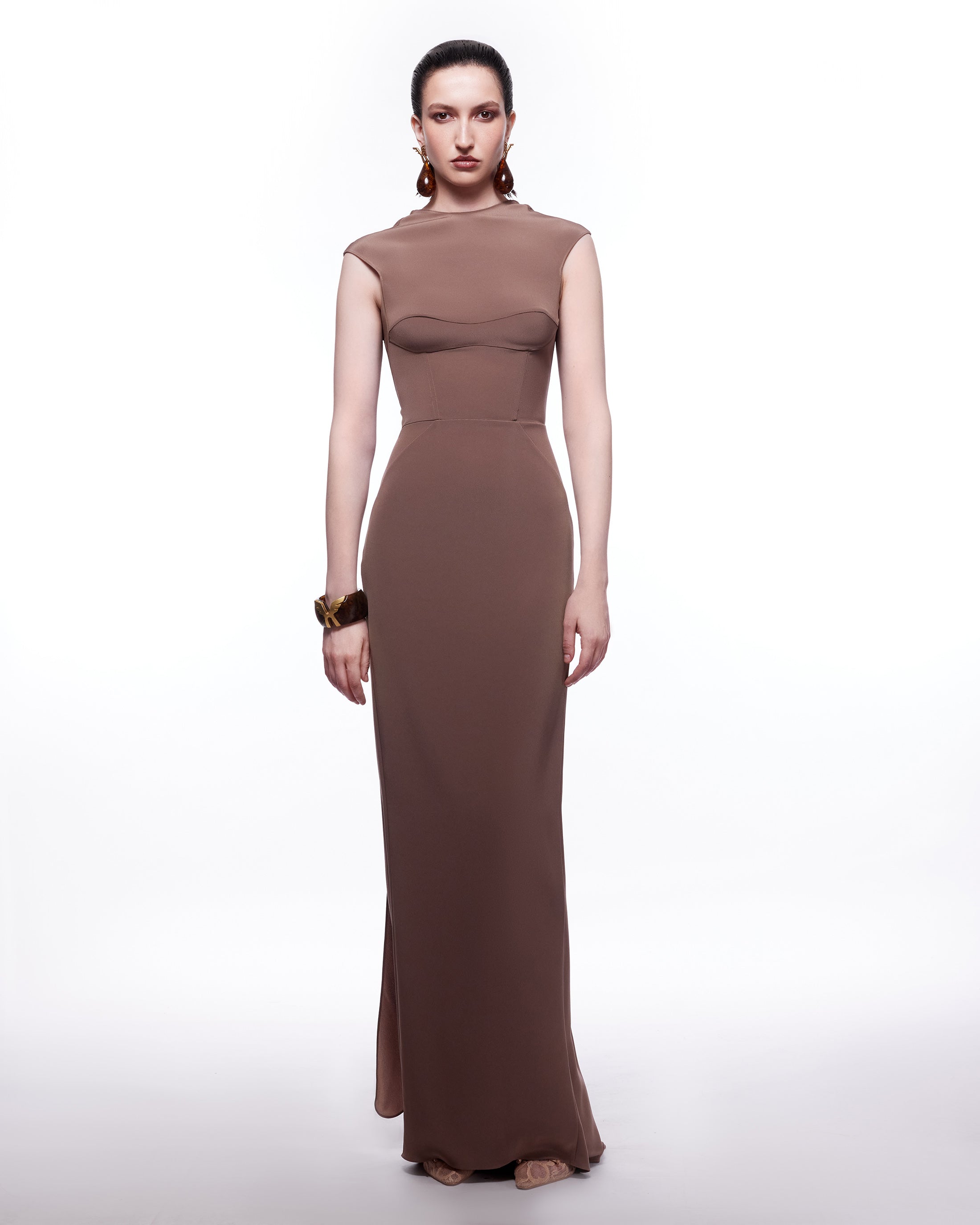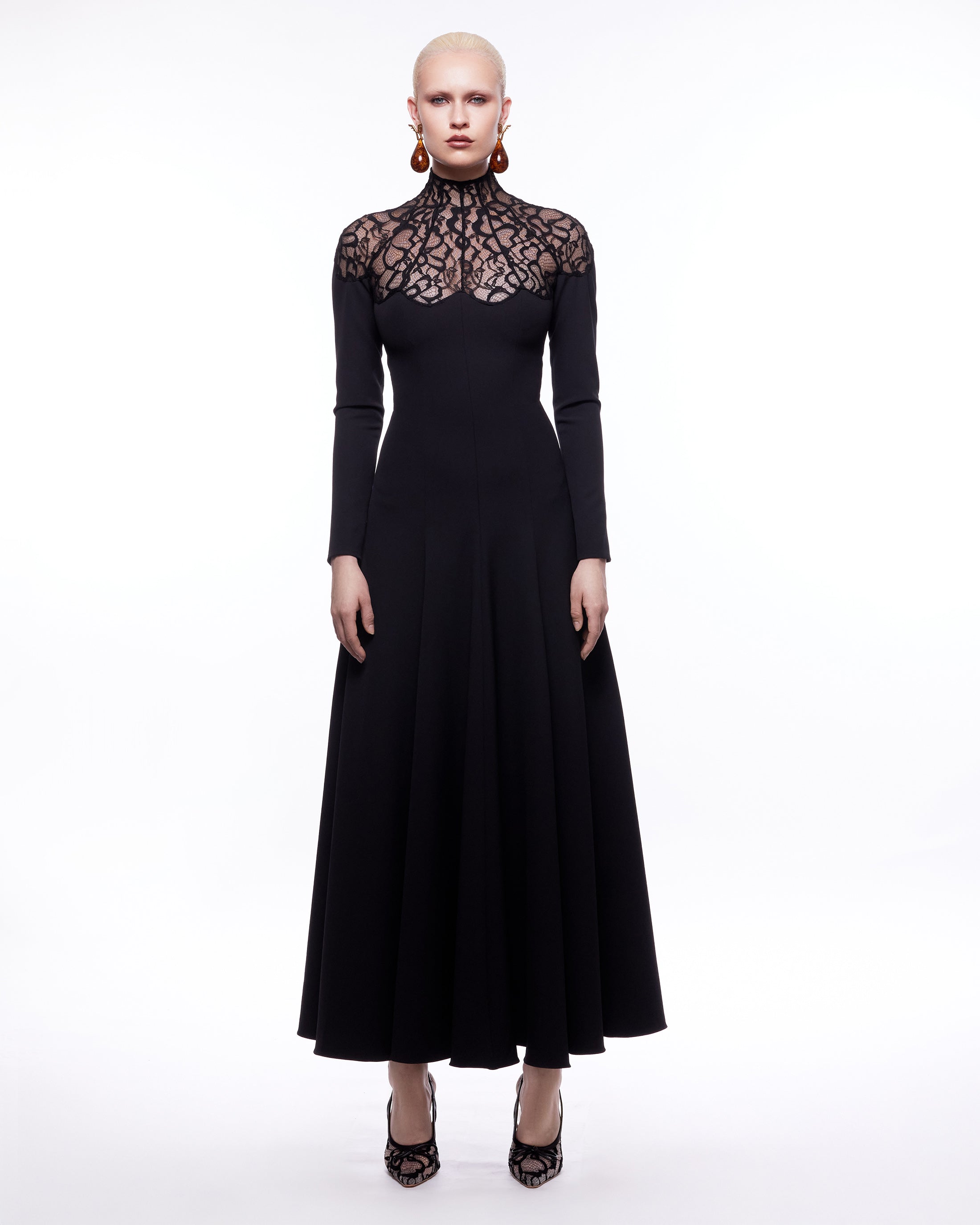 Exploring the many facets of womanhood, the collection reimagines classic silhouettes through a modern lens. Sculpted hourglass tailoring, signature teardrop openings, and plumed gowns in nude rosé and wine lace define the season’s vision of strength and sensuality.