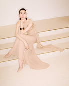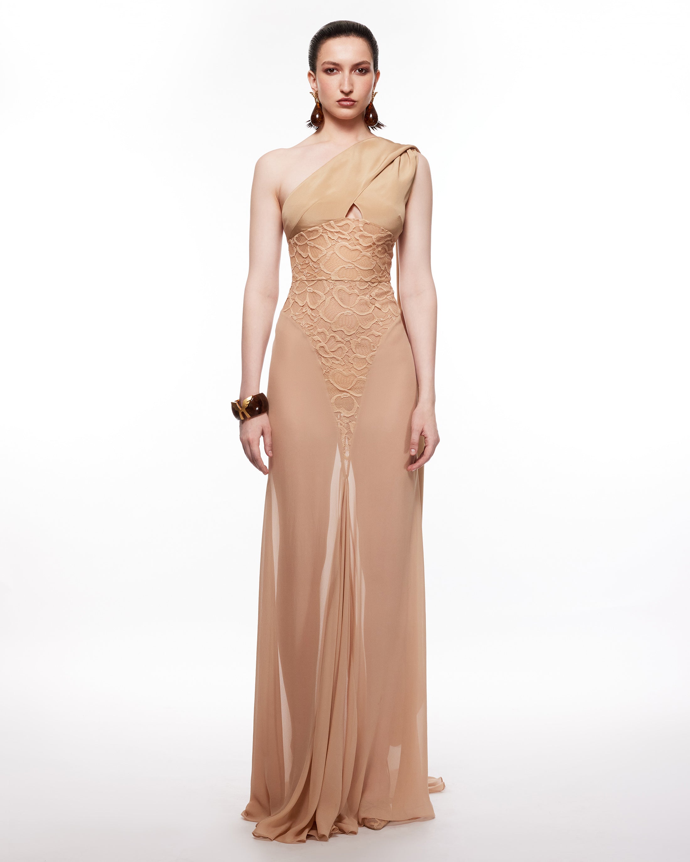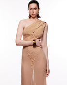A marriage of fitted antique nude butterfly motif lace, silk crepe morrocain and flowy silk crepe georgette is testament to the couture prowess that MARISSA entails. The one shoulder, maxi gown ever so slightly opens at the center before demonstrating a house signature, the ubiquitous shoulder drape.
