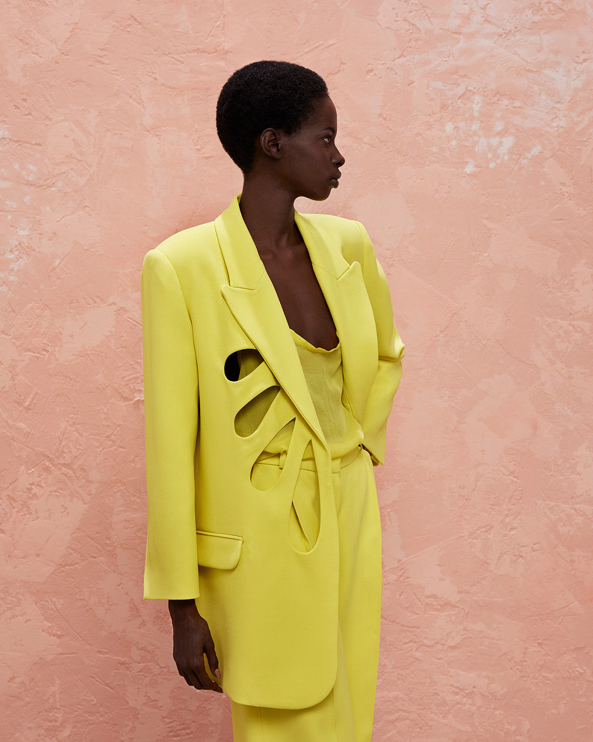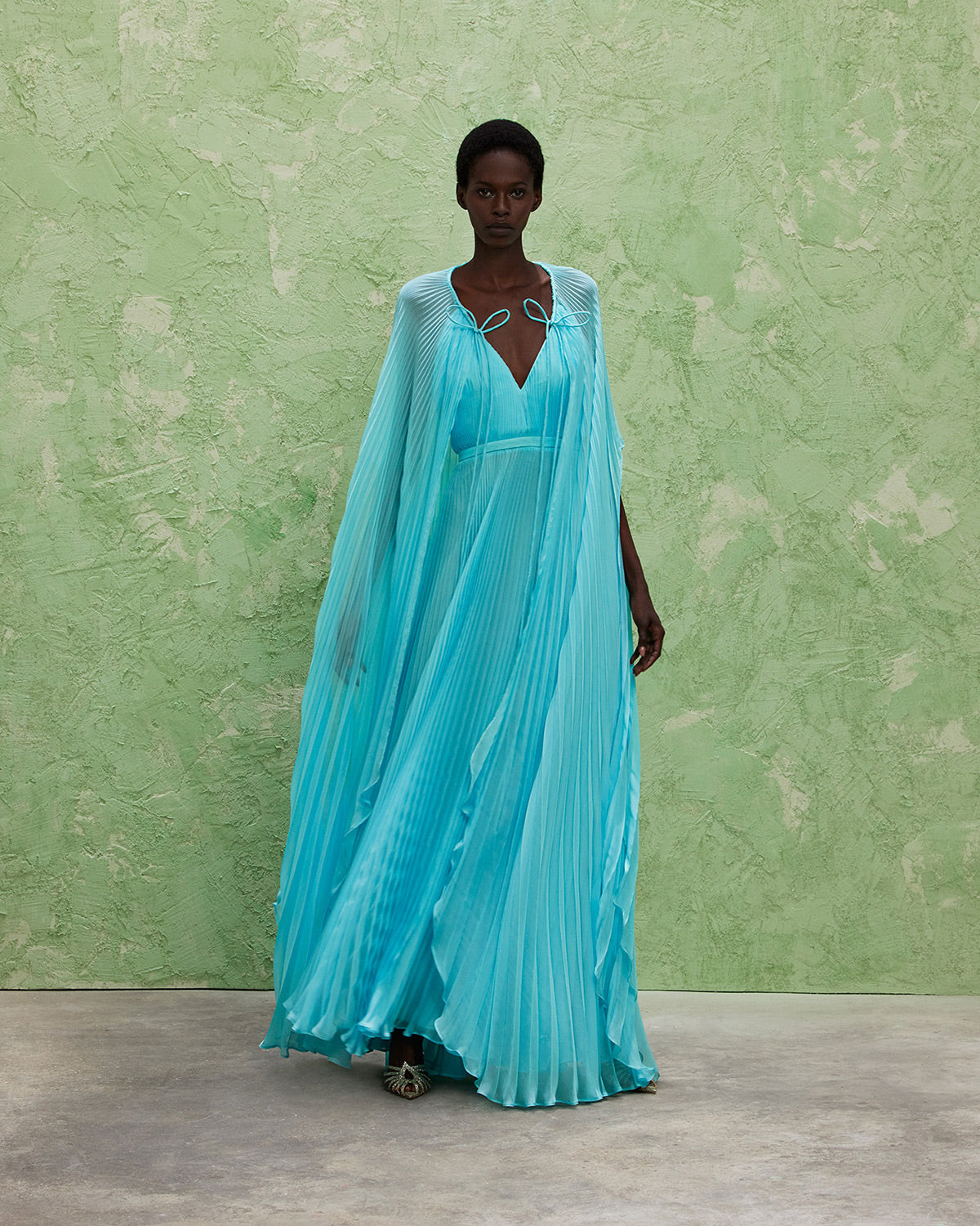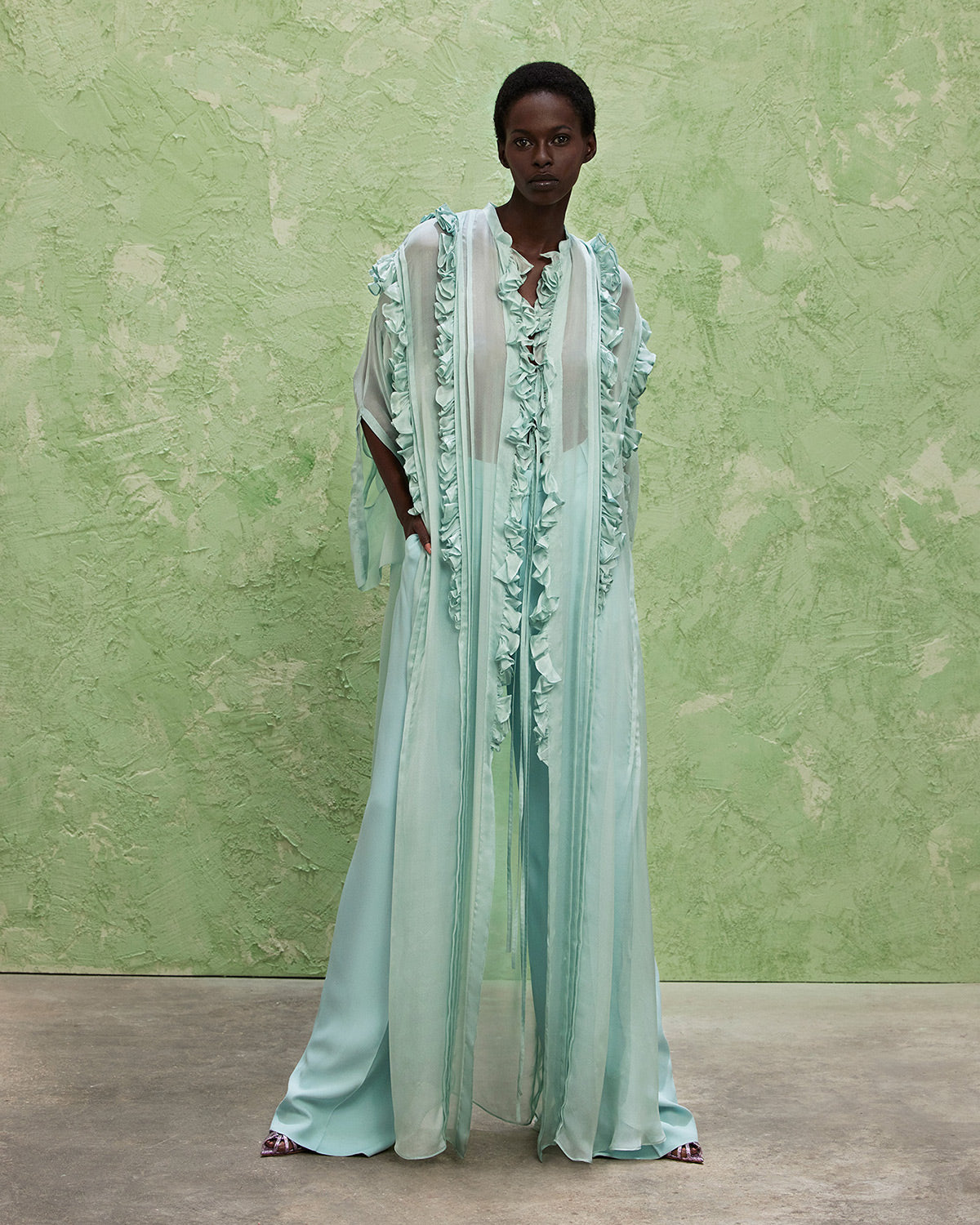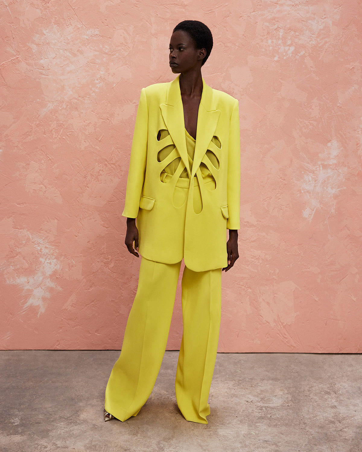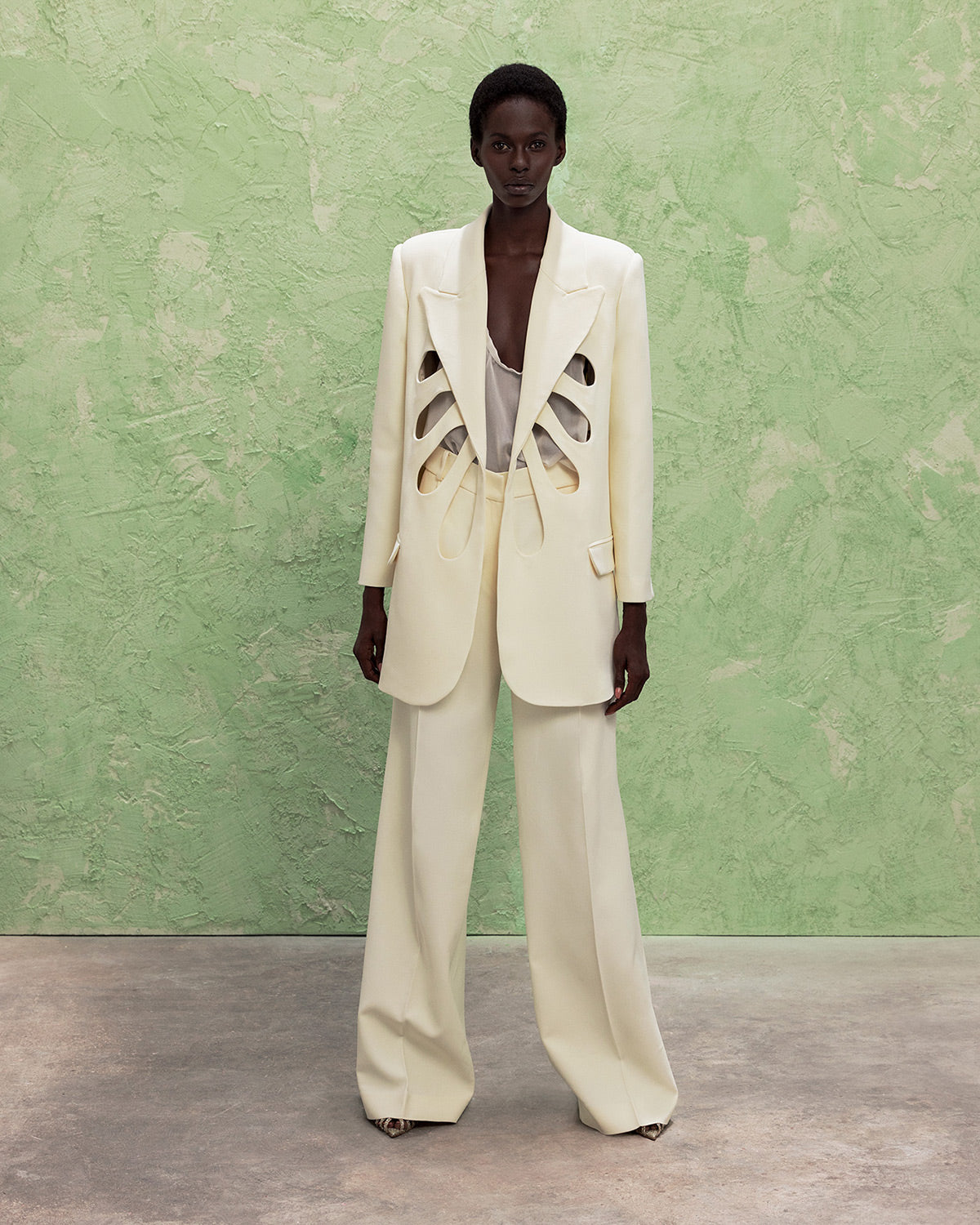 The collection also features a modern take on disco dresses, where kaftans and suiting are reimagined through the house’s signature tear designs that introduce new shapes of fluidity. These elements subtly reveal and kiss the skin, paying homage to the collection’s muse with mesmerizing grace.