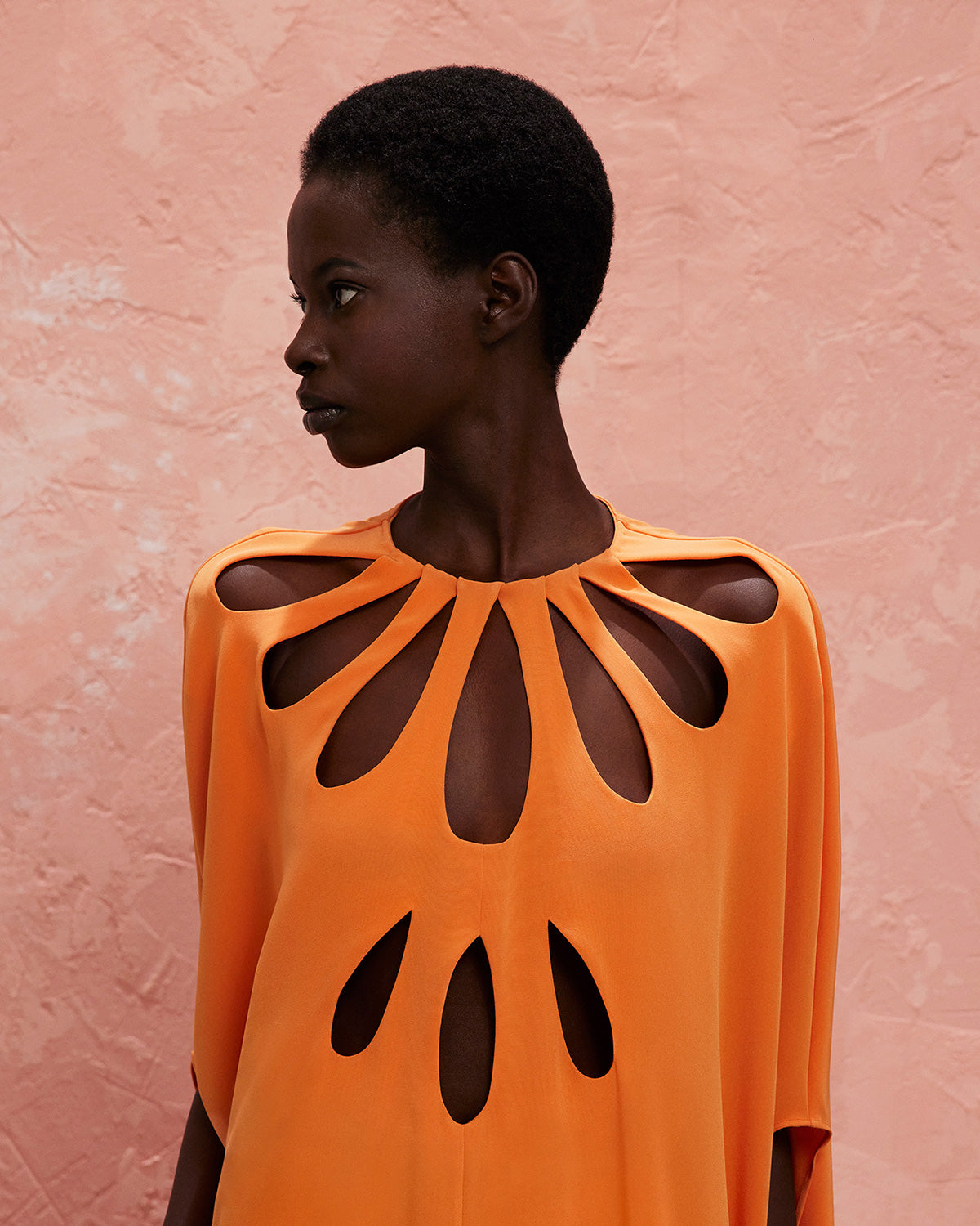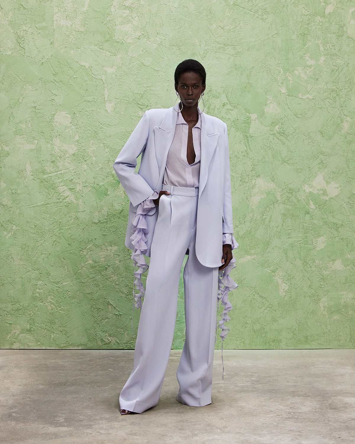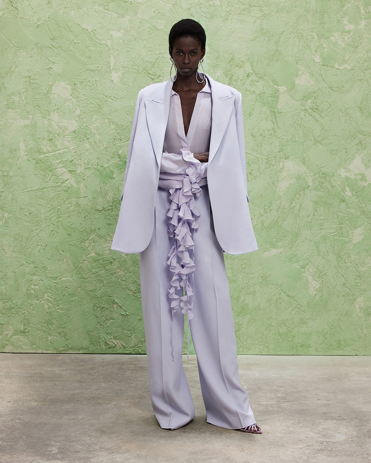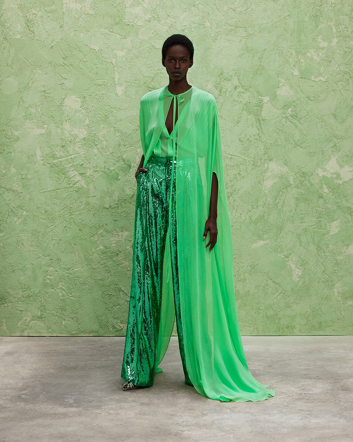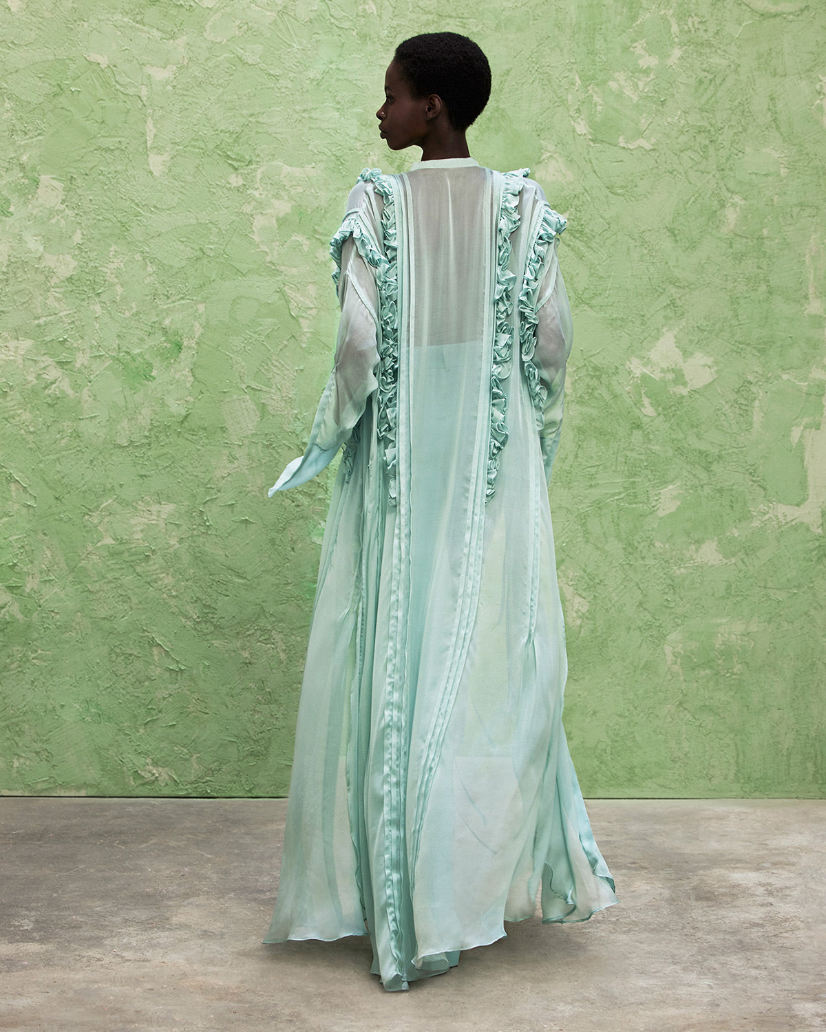 The collection also features a modern take on disco dresses, where kaftans and suiting are reimagined through the house’s signature tear designs that introduce new shapes of fluidity. These elements subtly reveal and kiss the skin, paying homage to the collection’s muse with mesmerizing grace.