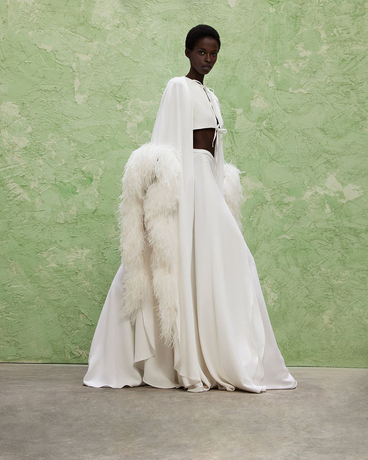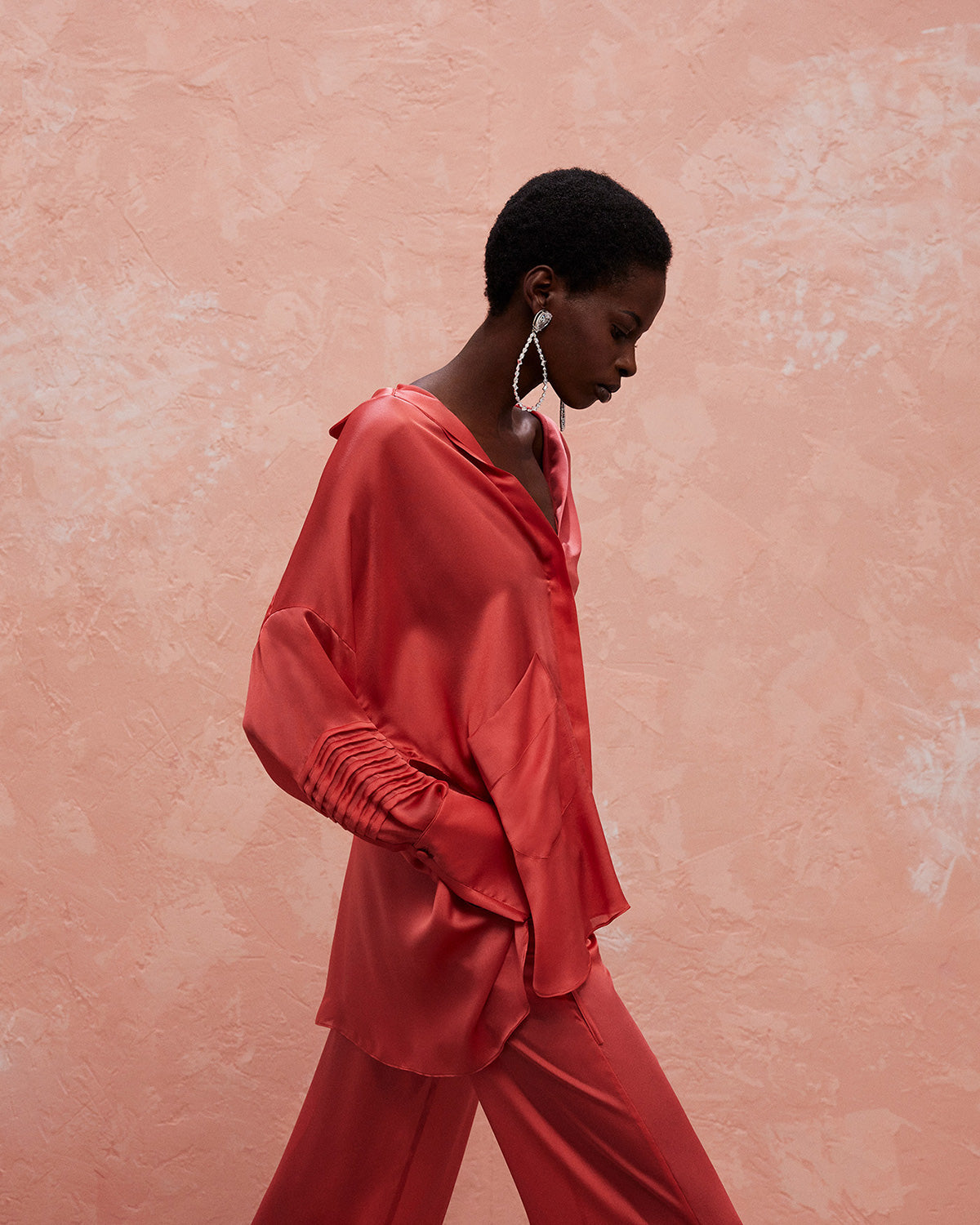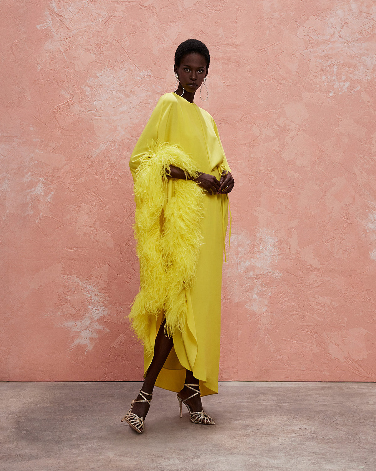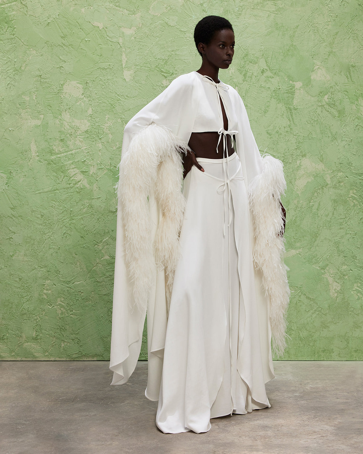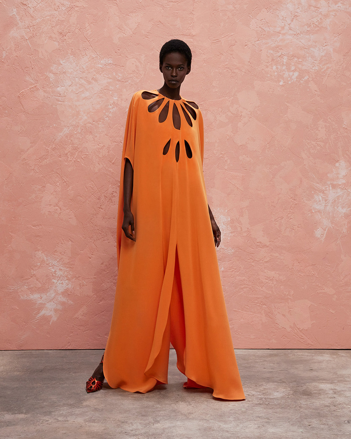 The collection also features a modern take on disco dresses, where kaftans and suiting are reimagined through the house’s signature tear designs that introduce new shapes of fluidity. These elements subtly reveal and kiss the skin, paying homage to the collection’s muse with mesmerizing grace.