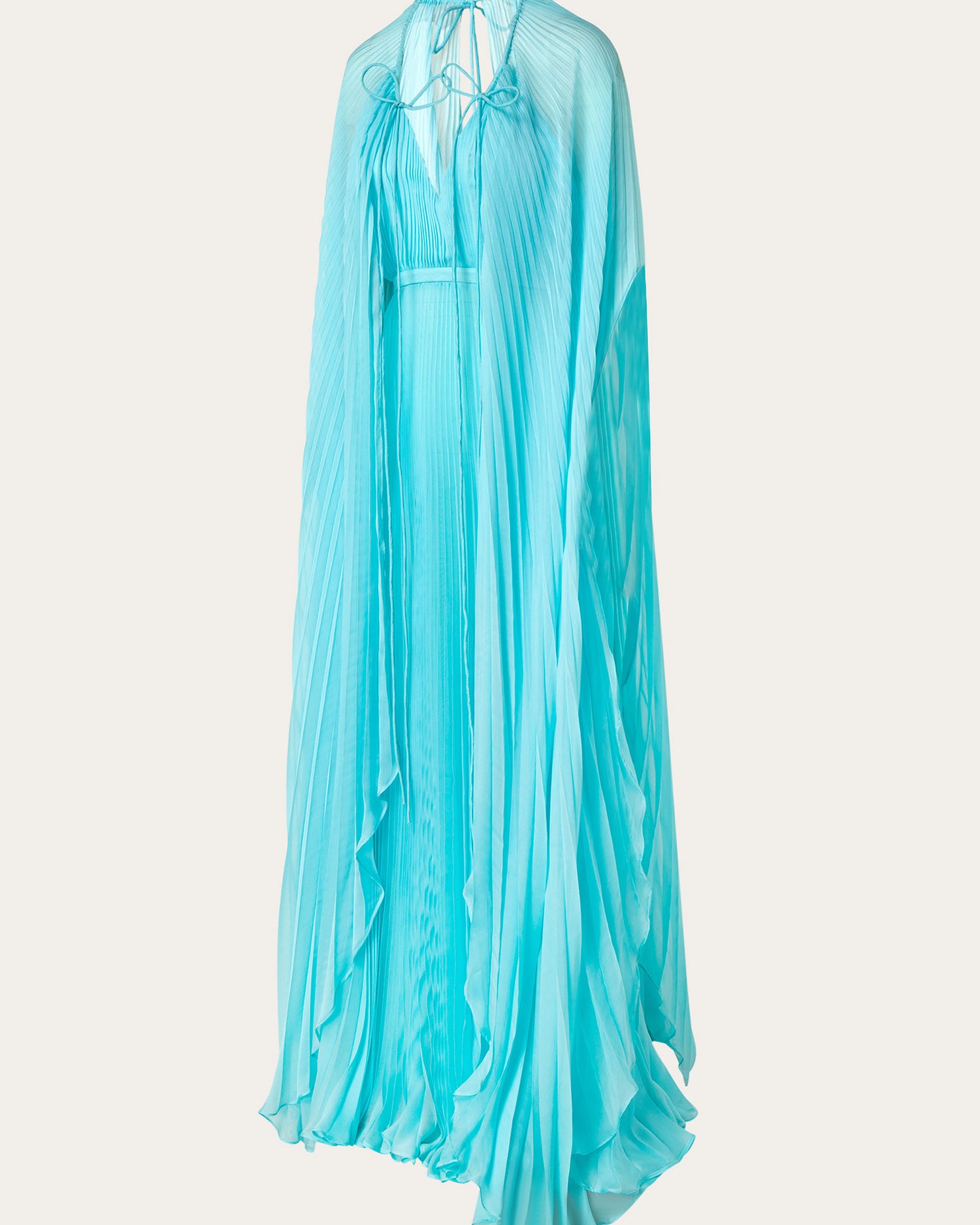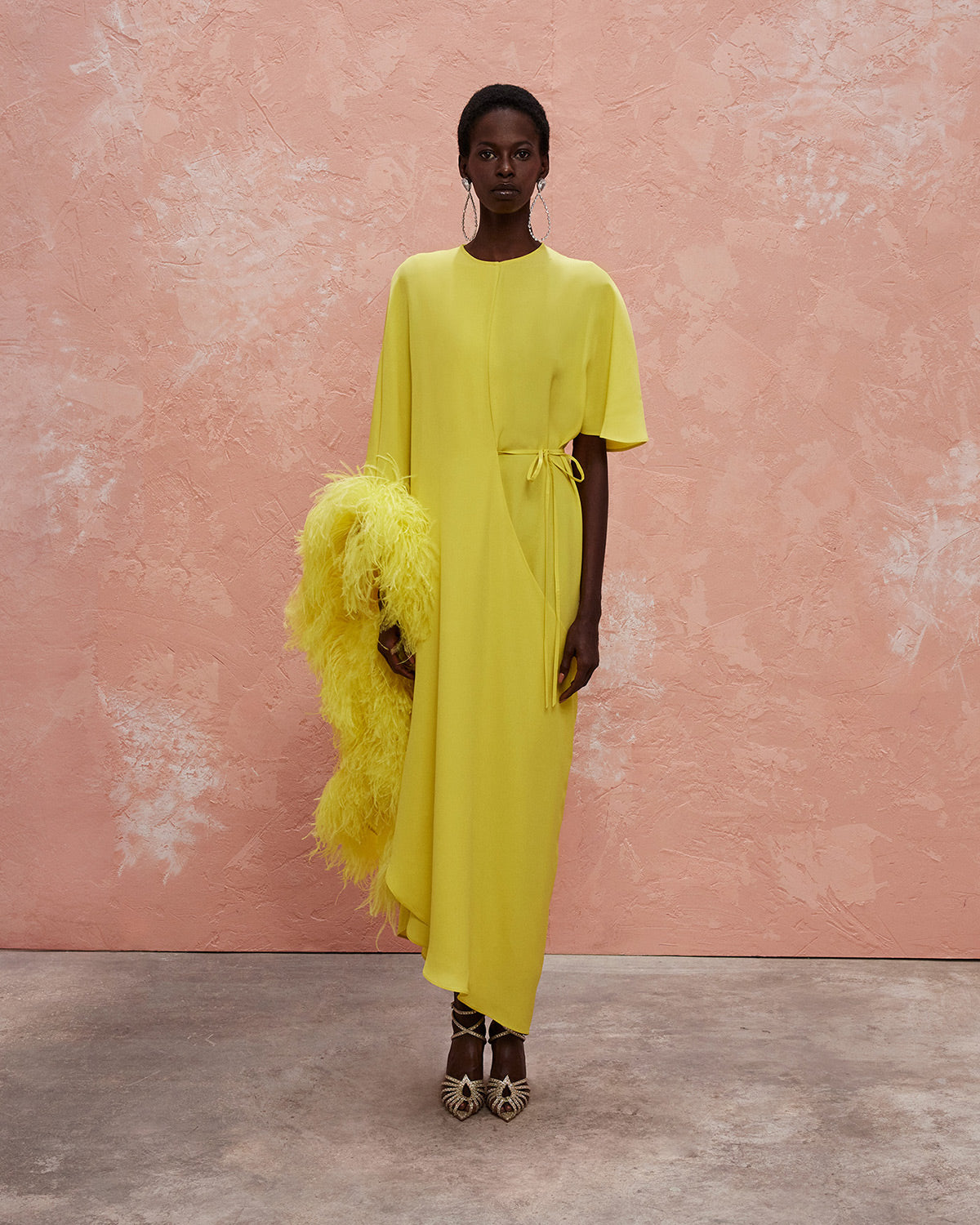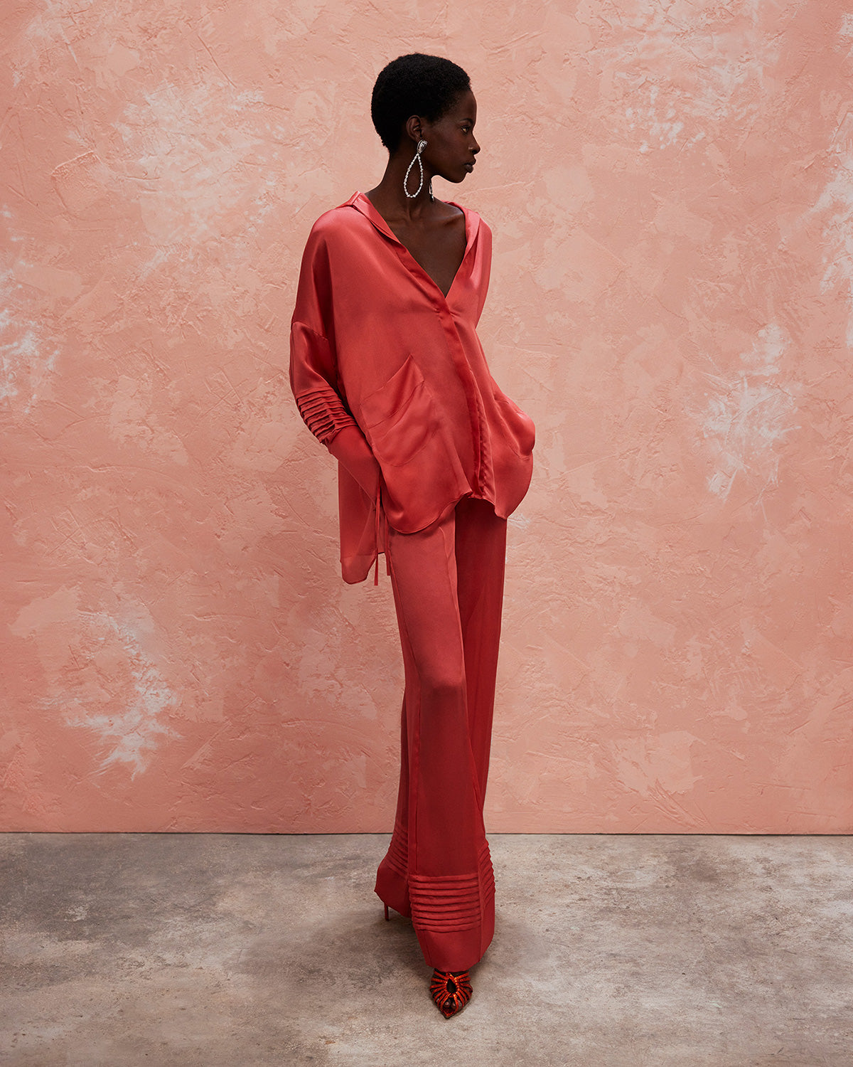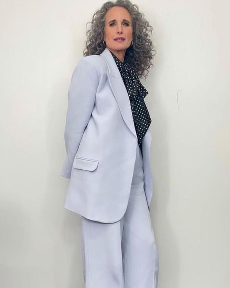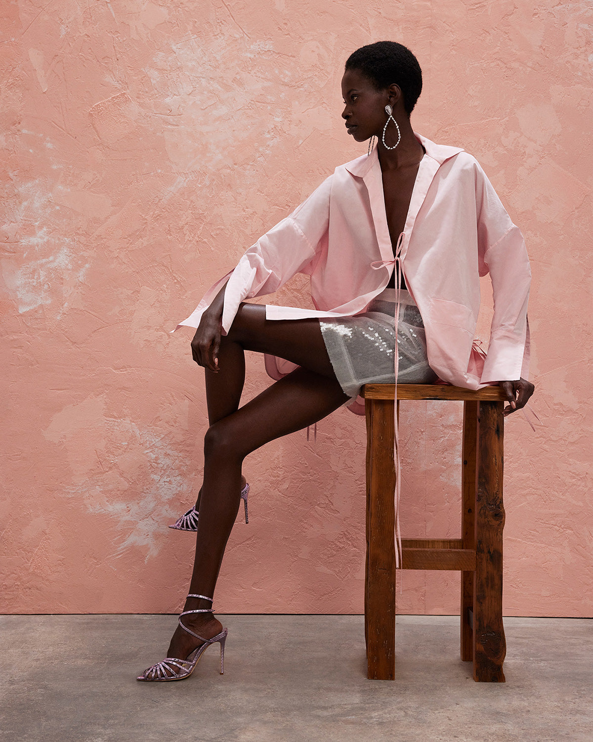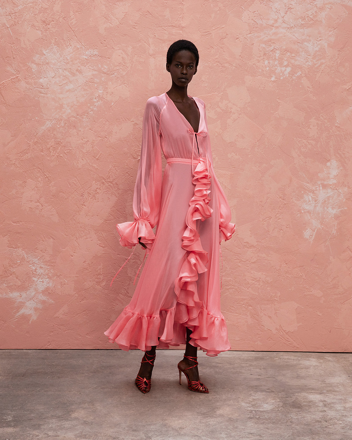 The collection also features a modern take on disco dresses, where kaftans and suiting are reimagined through the house’s signature tear designs that introduce new shapes of fluidity. These elements subtly reveal and kiss the skin, paying homage to the collection’s muse with mesmerizing grace.