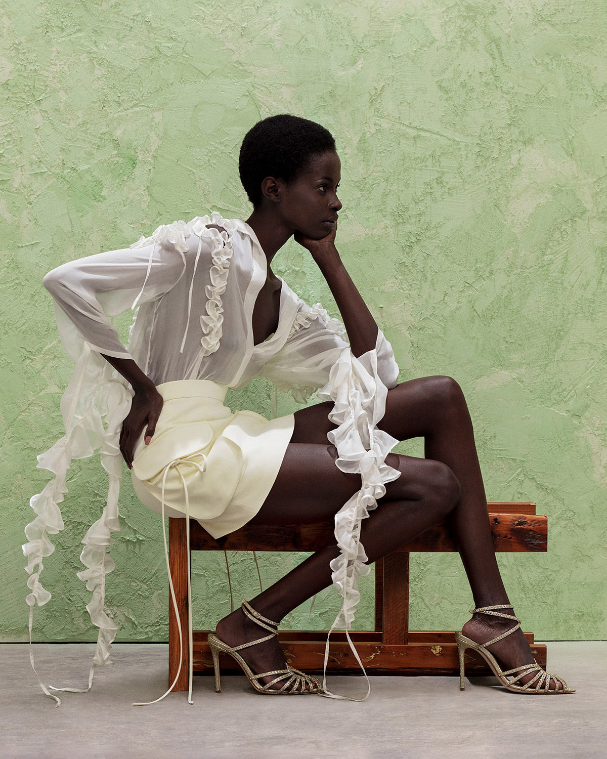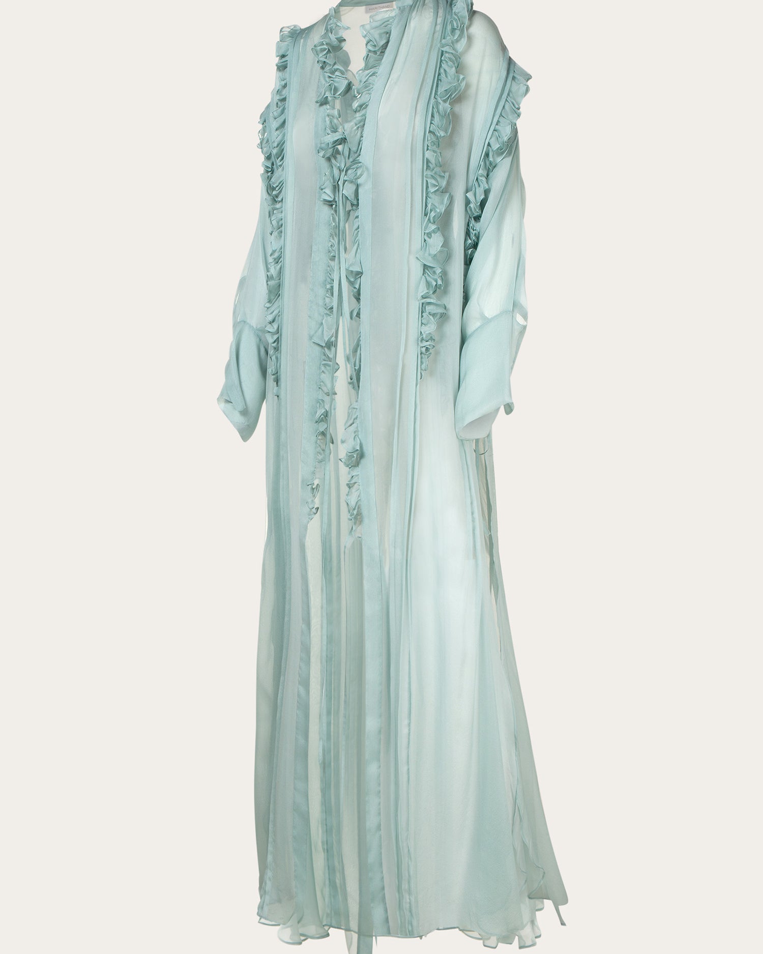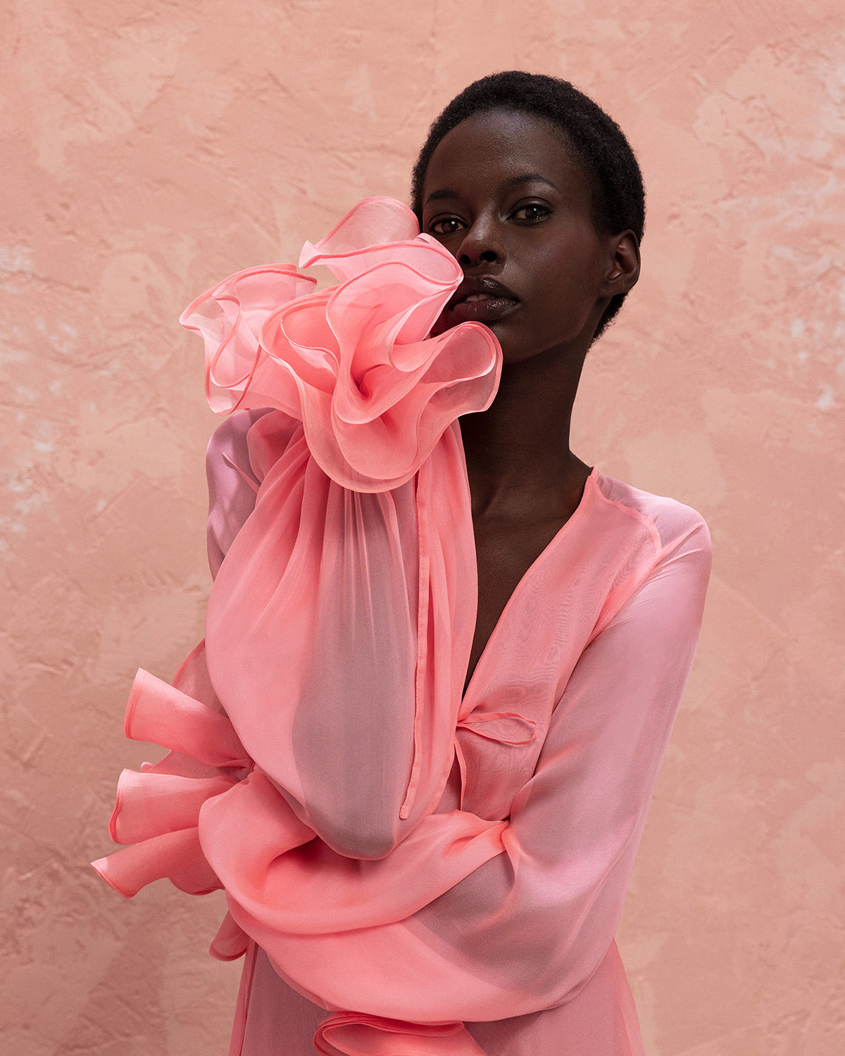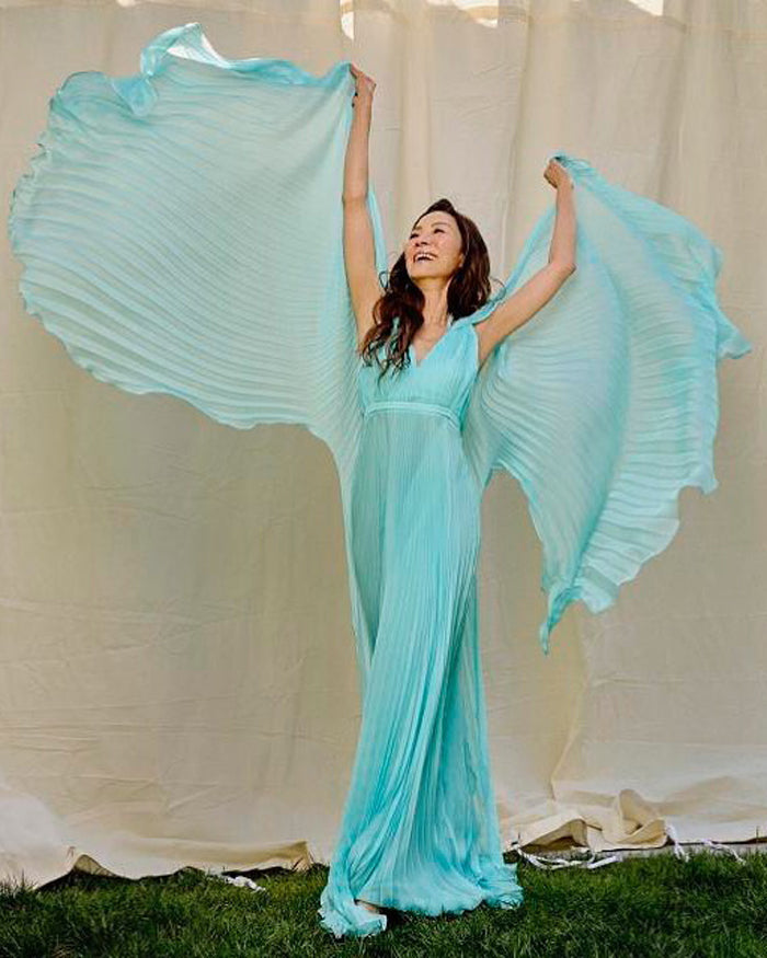 In "Madama Butterfly," designer day dresses and evening wear for women come alive with superfine pleating, feathery details, and cascading ruffles that captivate and stir the senses. Each piece is designed to keep the eye moving, celebrating the sensual aura of femininity with every fold and flutter.