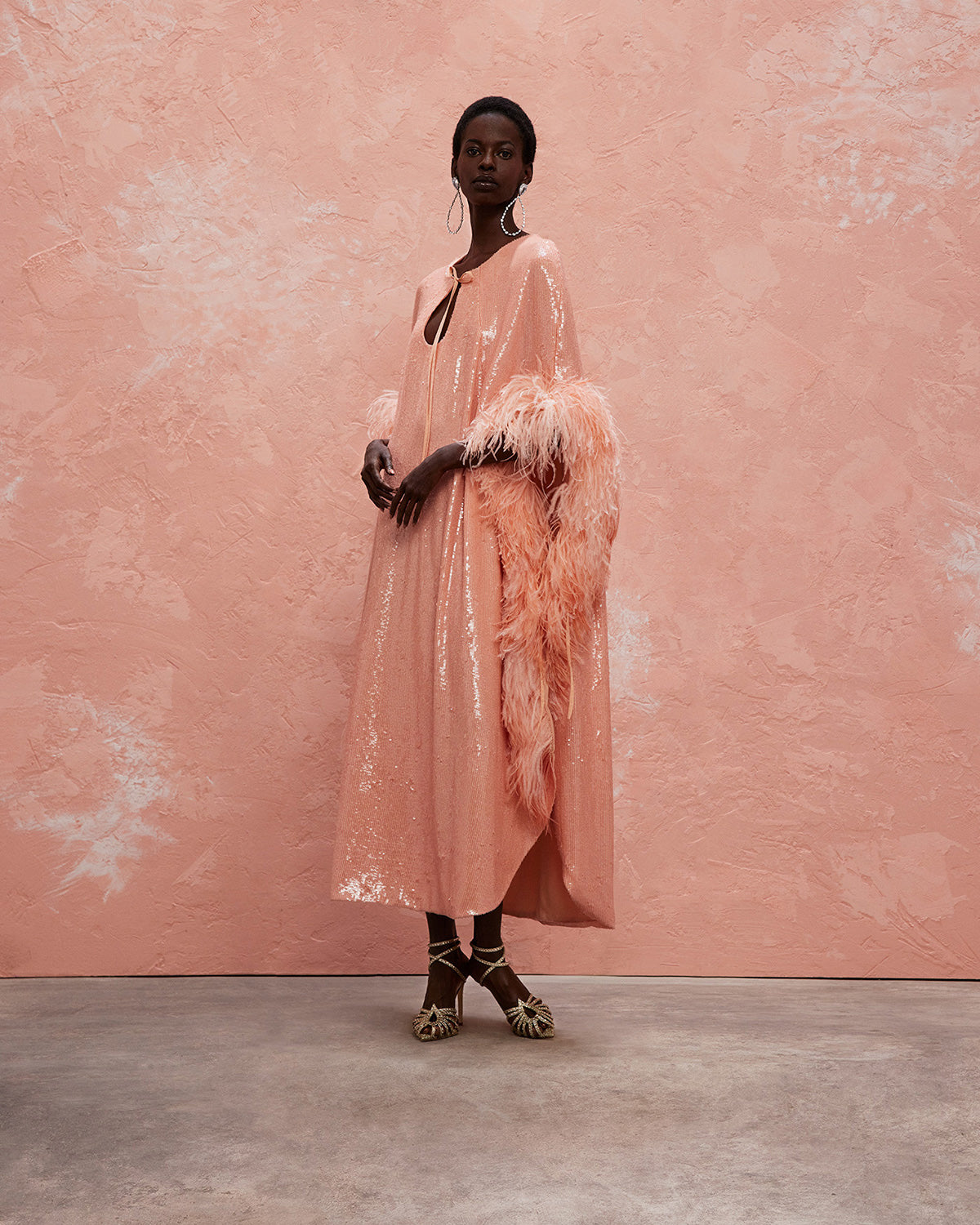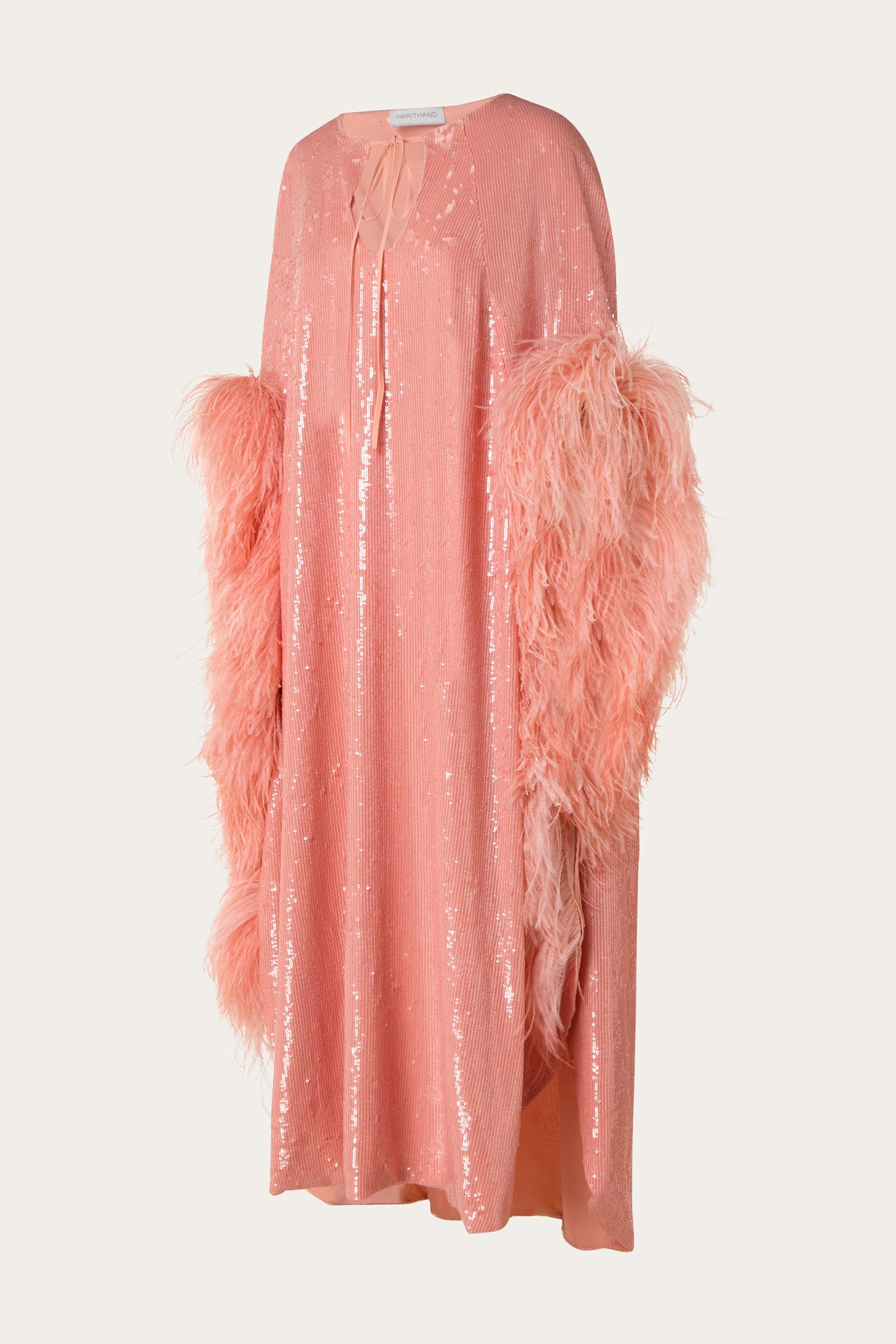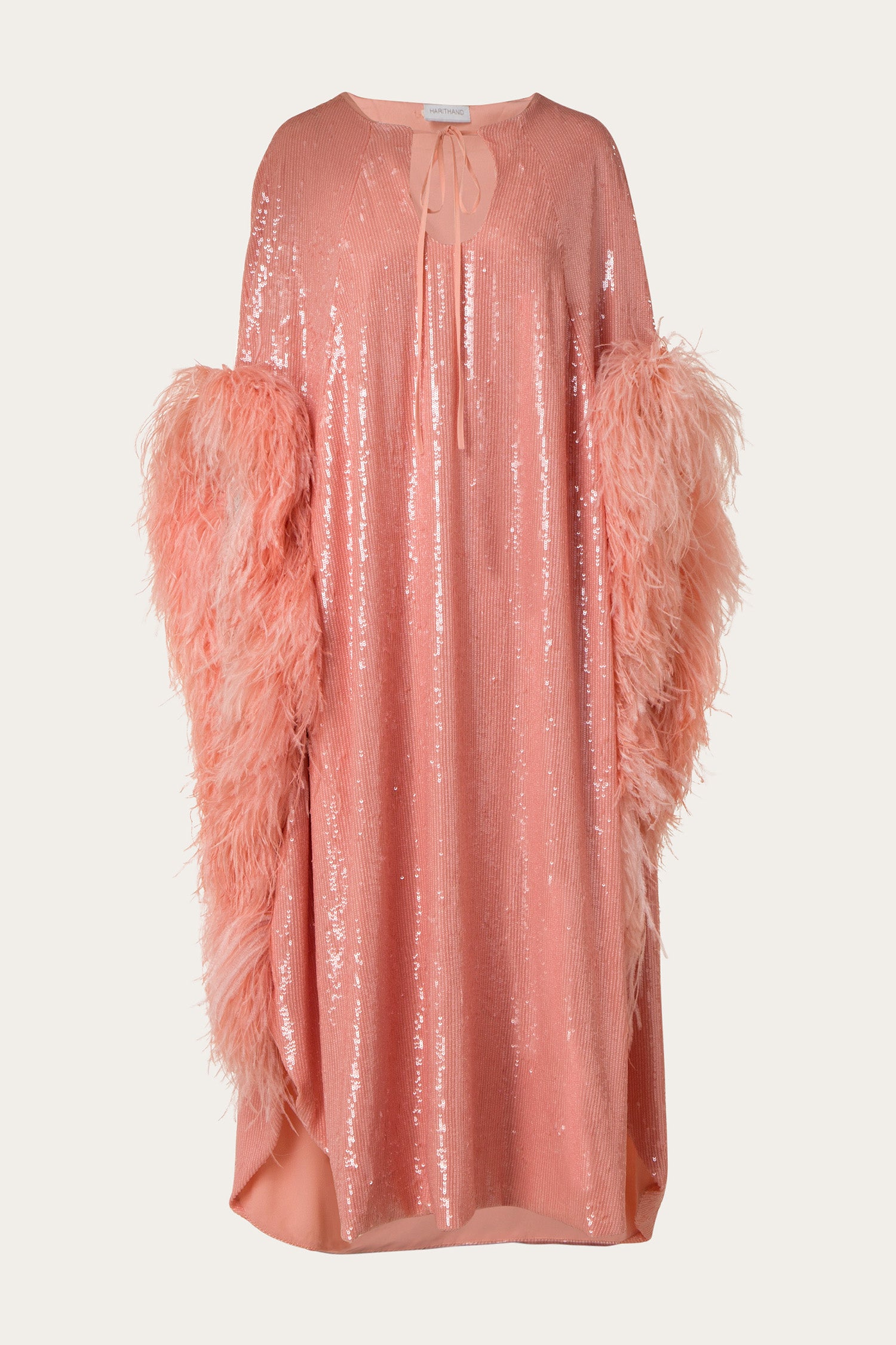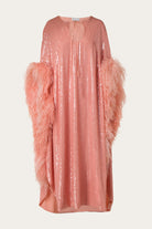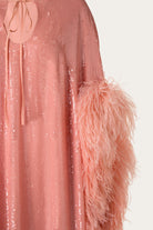 Handcrafted in Beirut, this fluid midi kaftan is embellished with plenty of sequins and feathers, resulting in a dramatic silhouette. A cutout neckline framed by an adjustable tie and slits on both sides show a glimpse of skin.