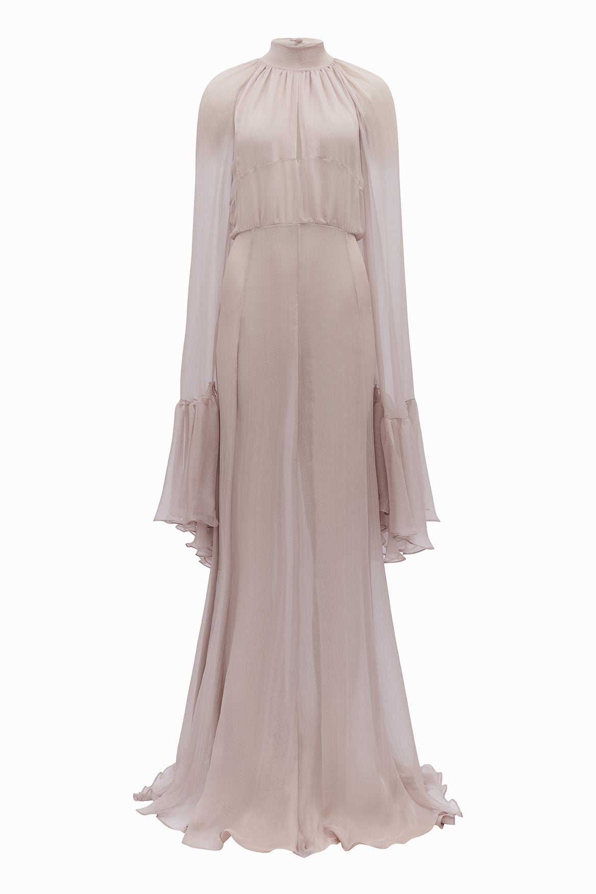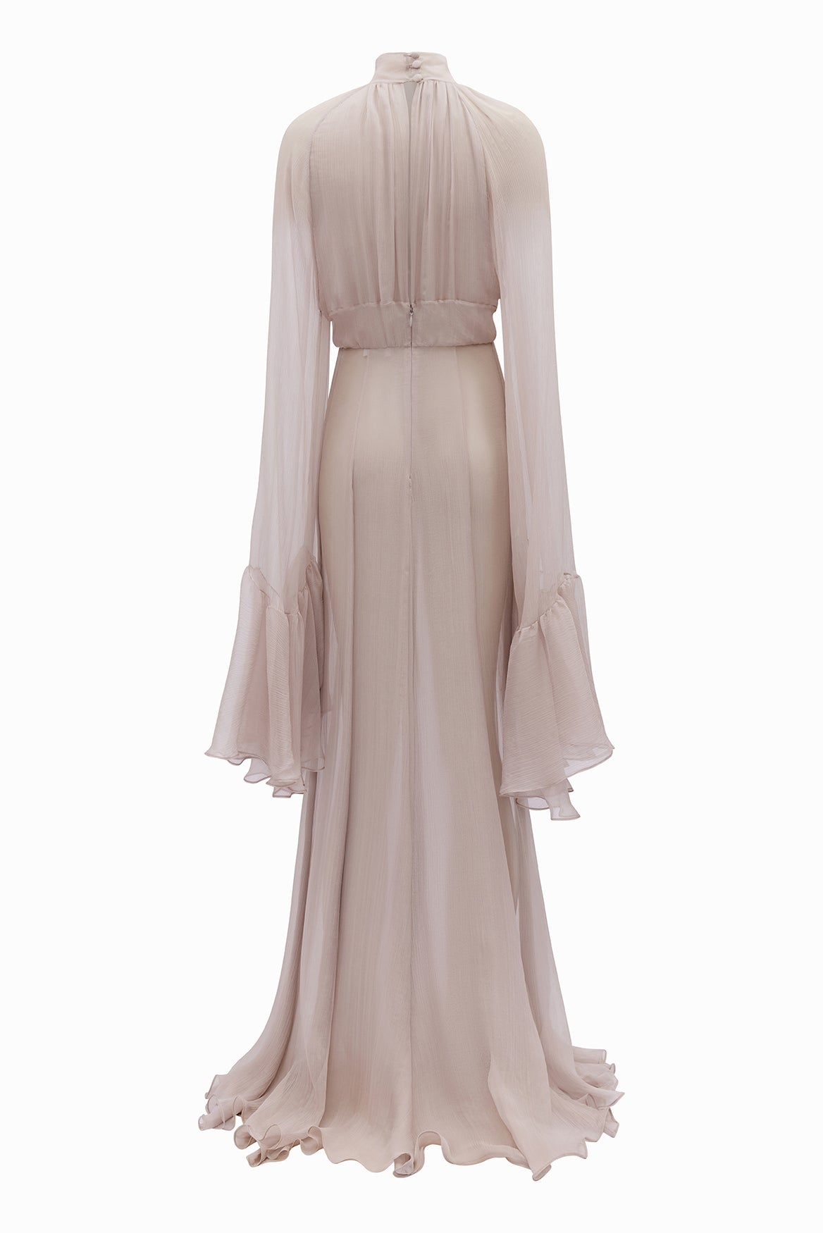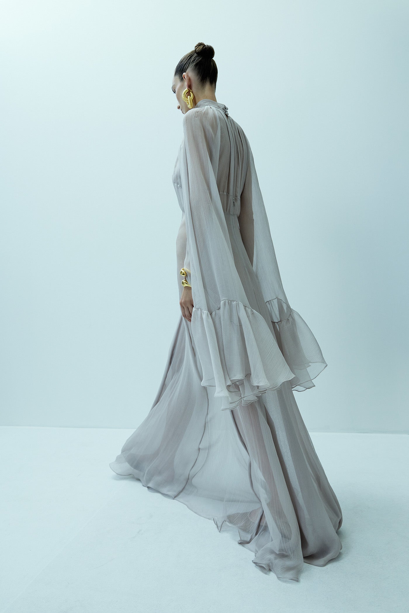 Mastering the flow of a dramatically diaphanous silhouette, the CARNATION gown is cut from lustrous grey silk georgette. Extensive sleeves drape over the body, while the loose fitting, high-neck, gathered bodice is detailed with a subtle keyhole opening.