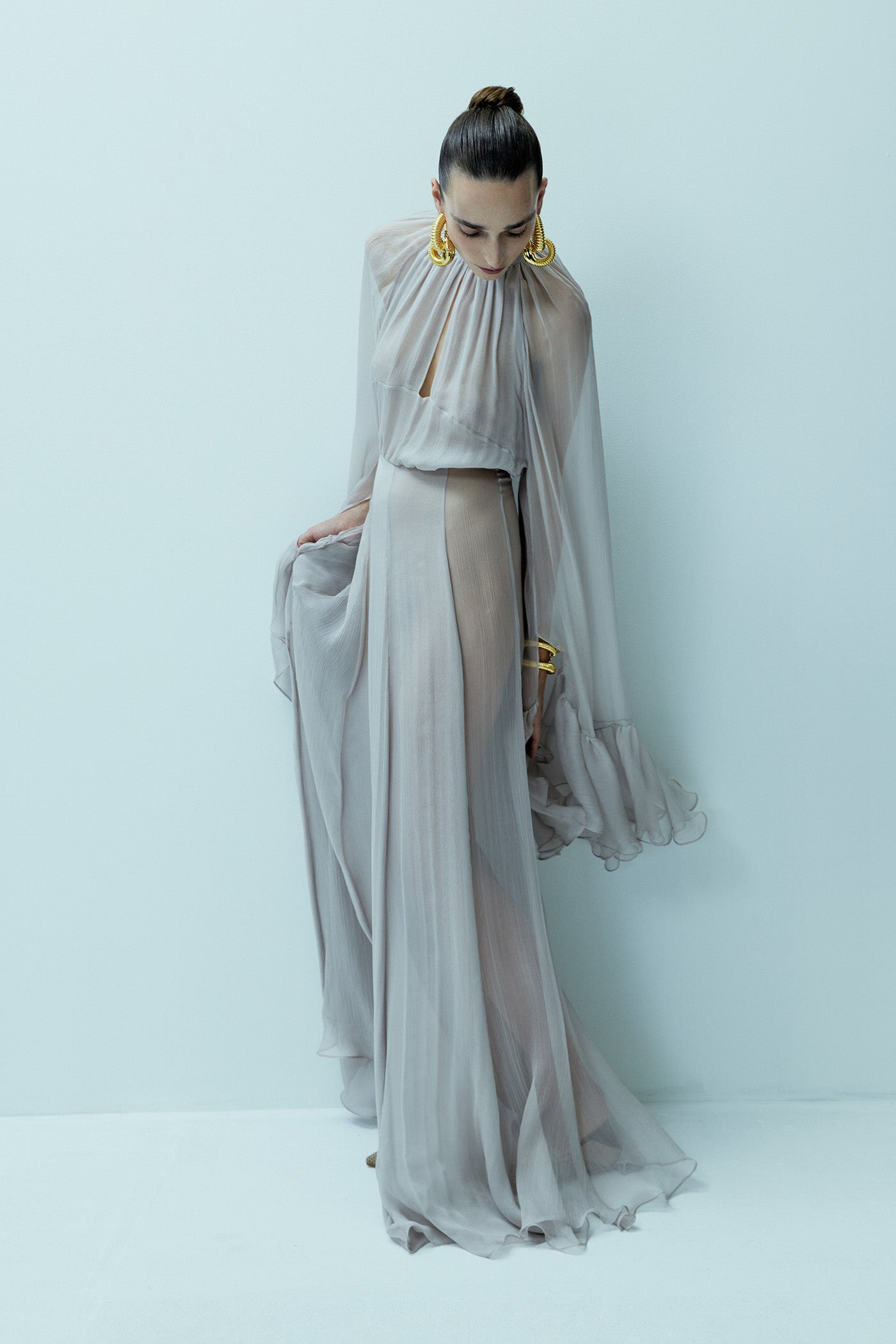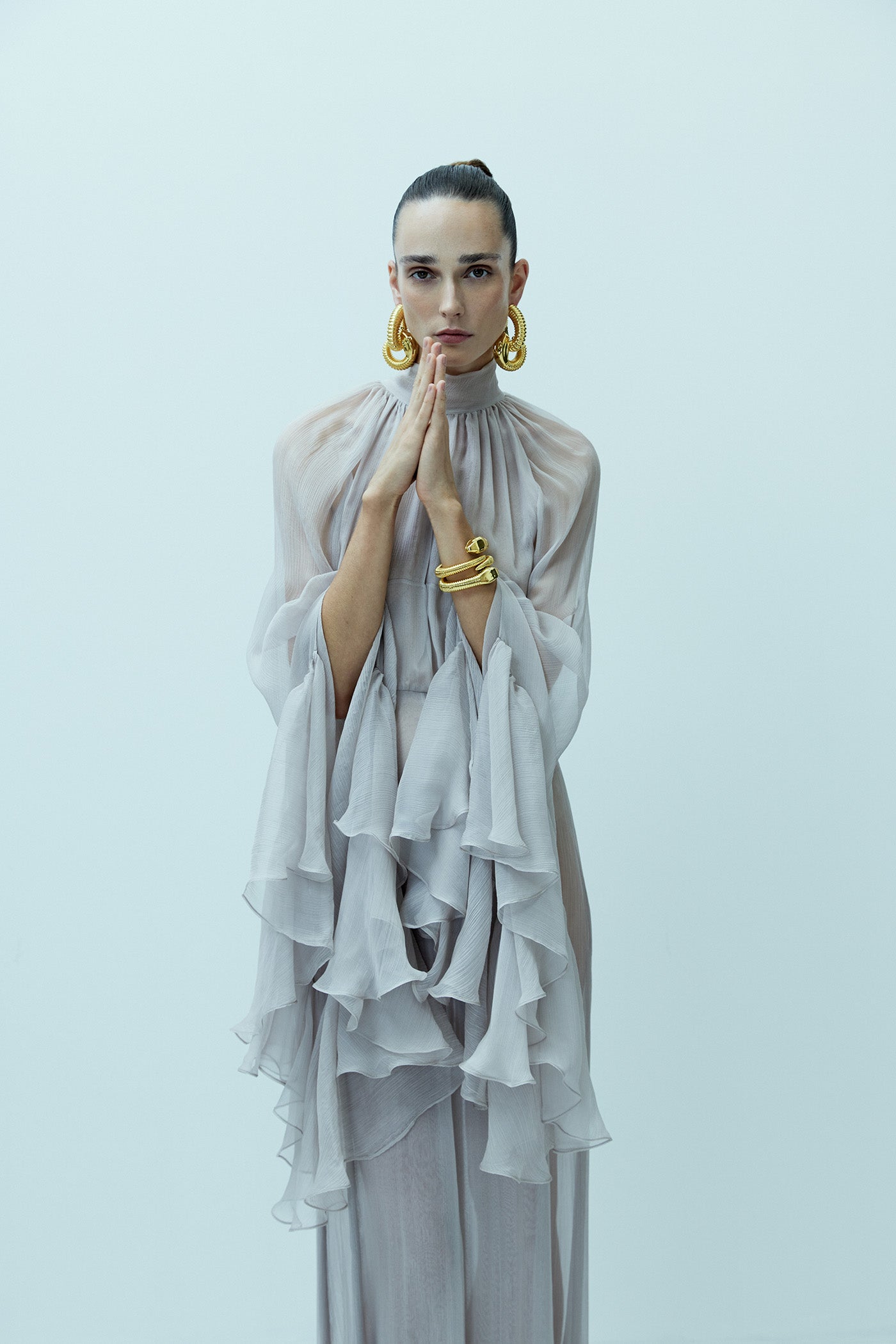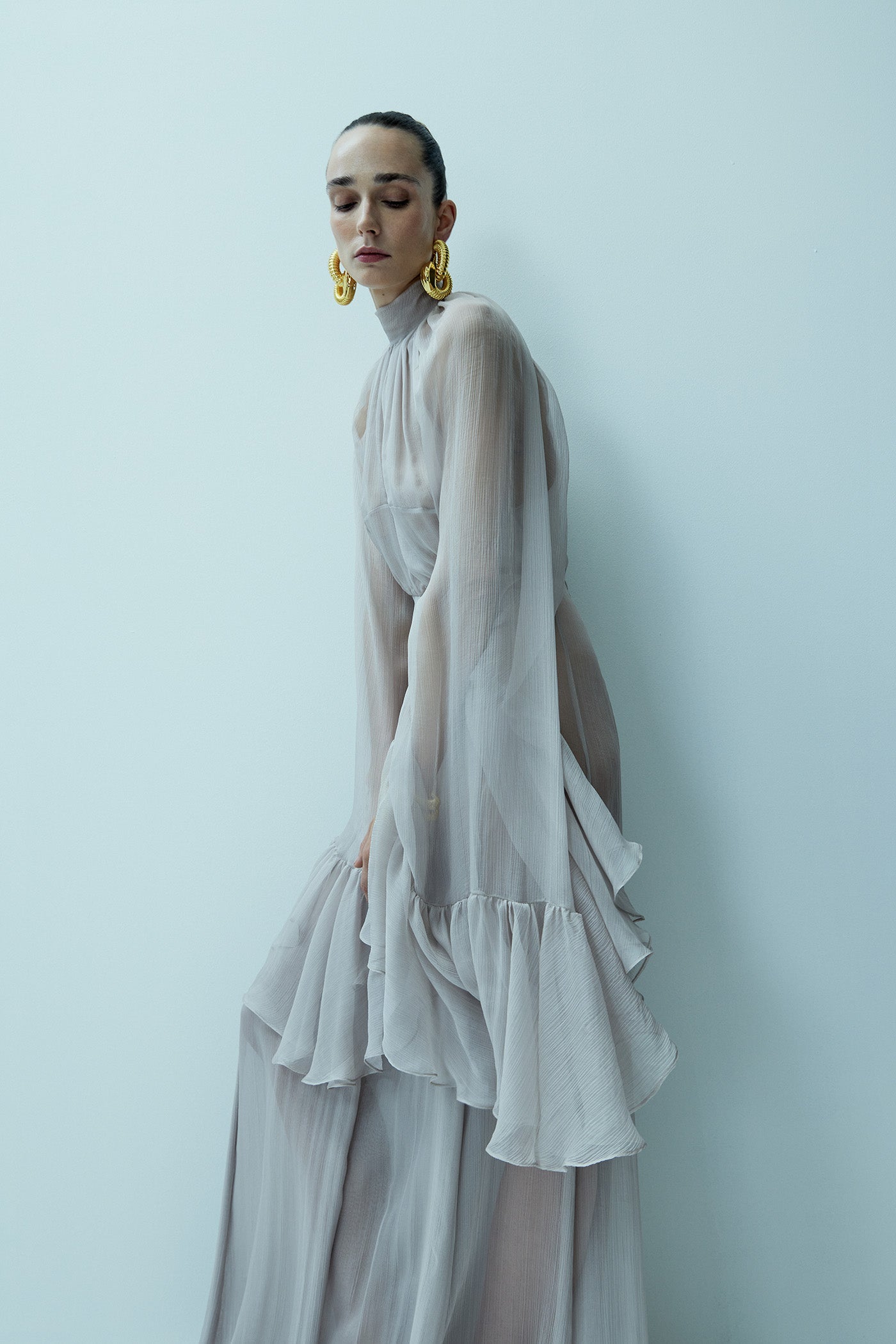 Mastering the flow of a dramatically diaphanous silhouette, the CARNATION gown is cut from lustrous grey silk georgette. Extensive sleeves drape over the body, while the loose fitting, high-neck, gathered bodice is detailed with a subtle keyhole opening.