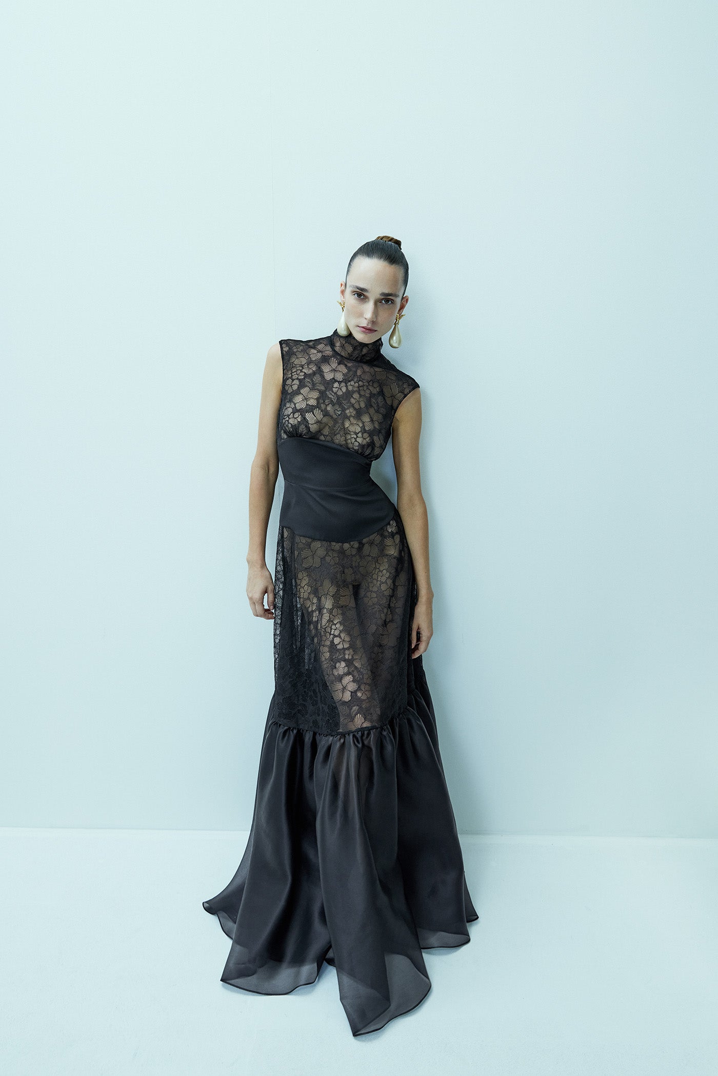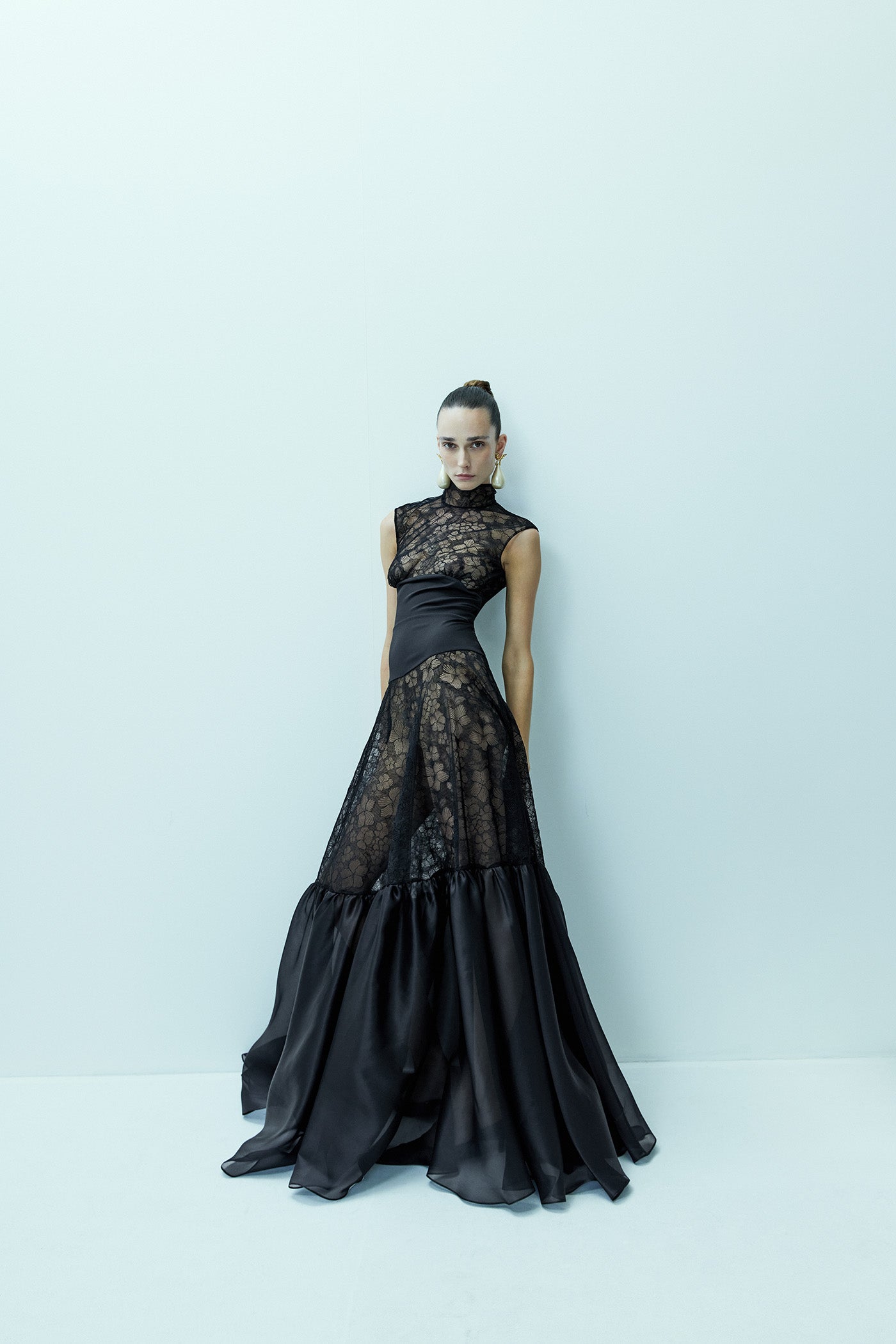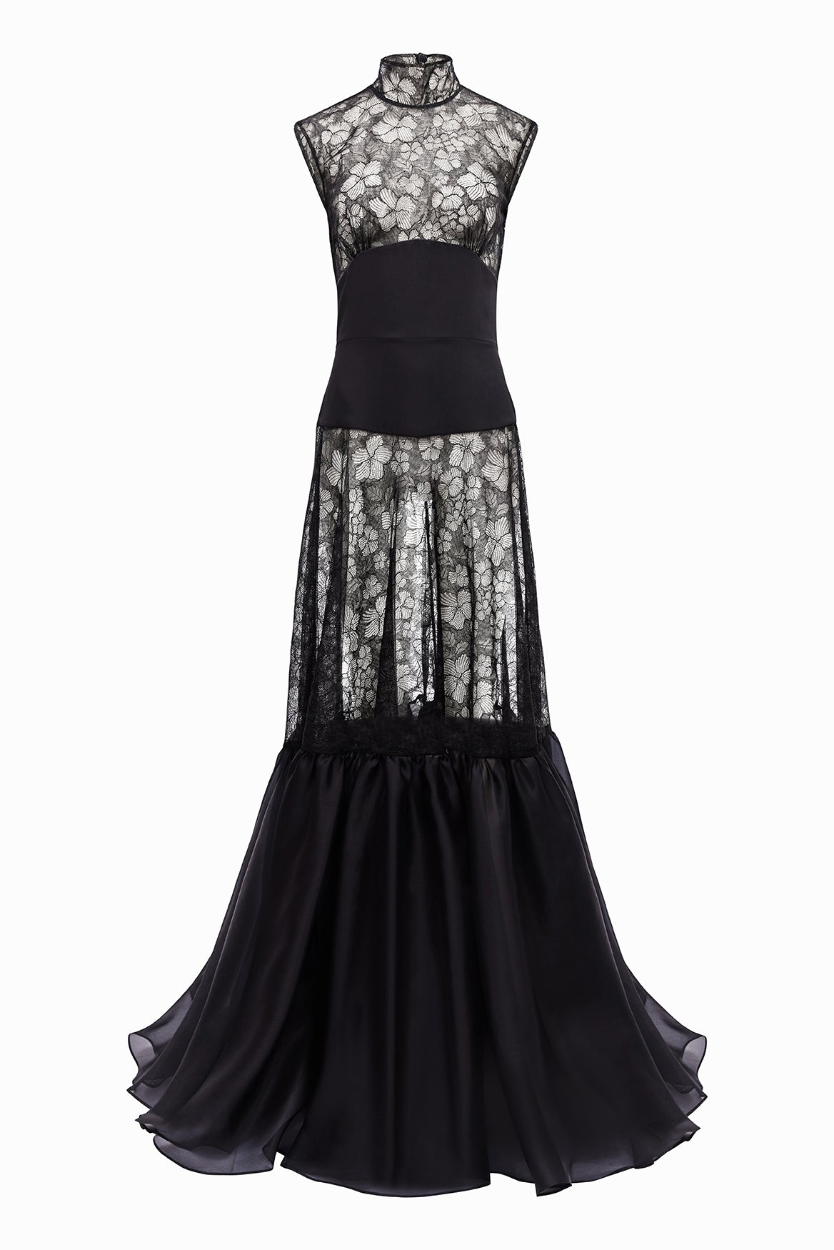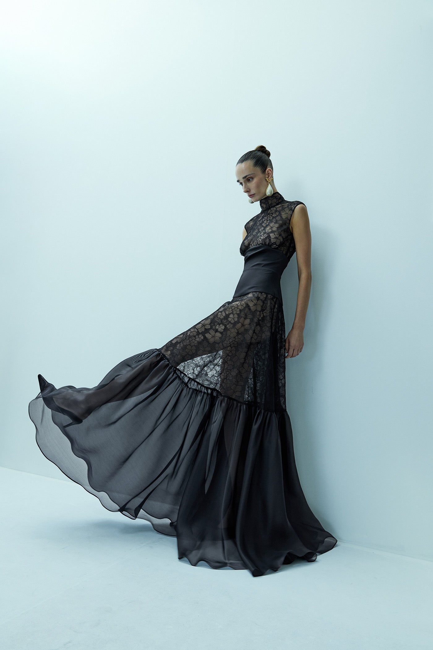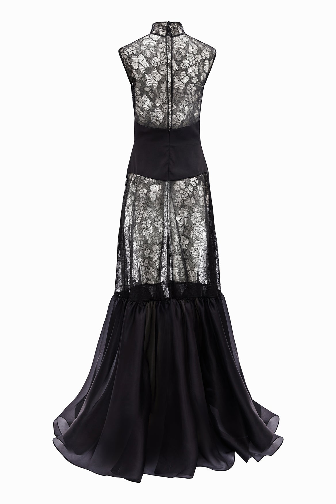 HIBISCUS is cut from a combination of select black fabrics, namely floral lace. The high neck lace bodice features a silk crêpe de chine panel, cut like a corset, and a back zip button loop closure. The flared skirt is encircled with an outstanding frill of silk organza.