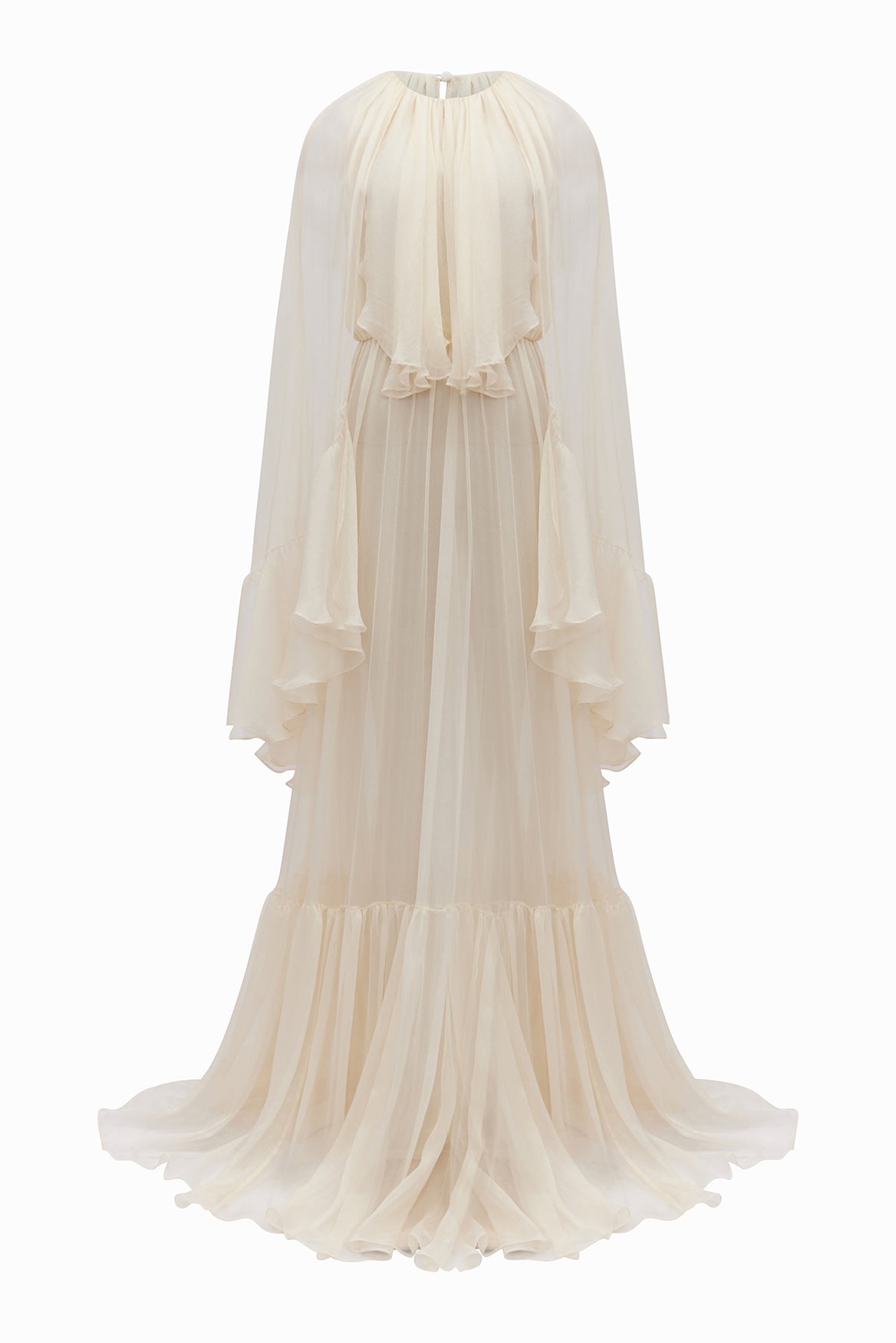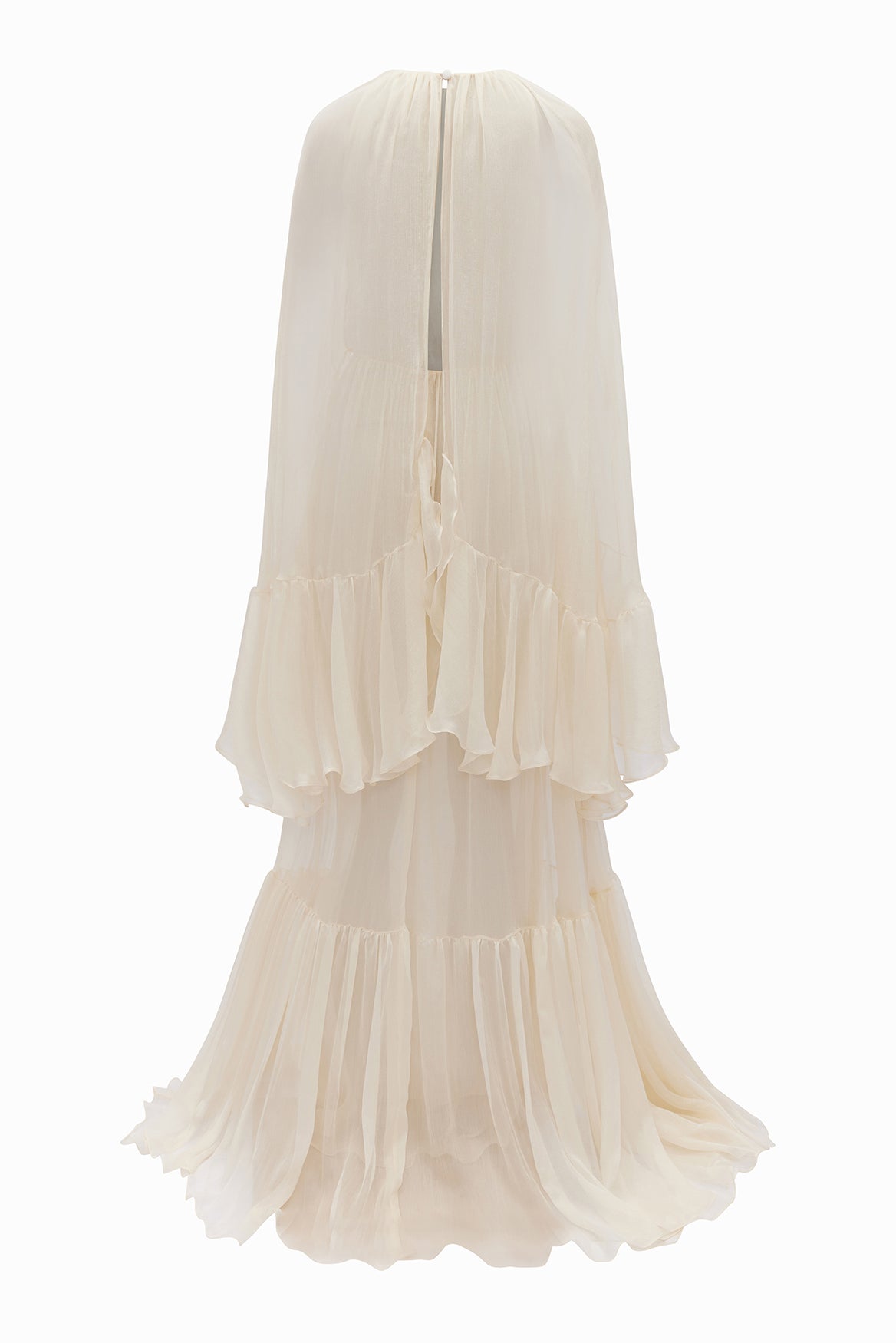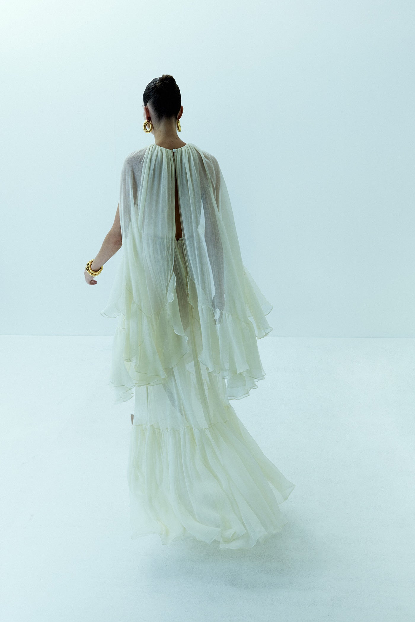 Elegant in its ability to caress and bare the body at once, the airy, butter yellow silk georgette PIERIS maxi dress features shoulder flounces and a cascading cloak that lightly cover the open décolletage and back.