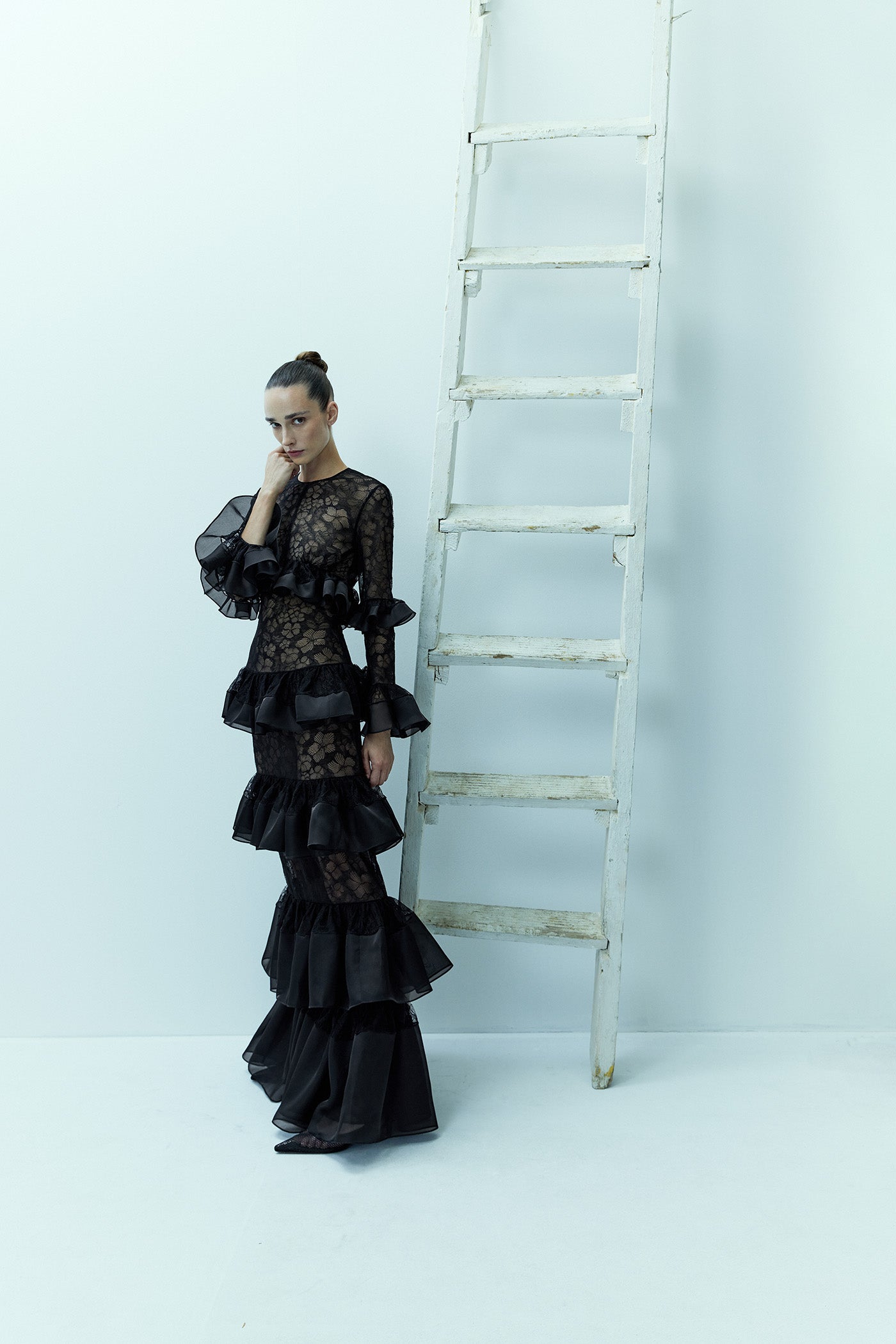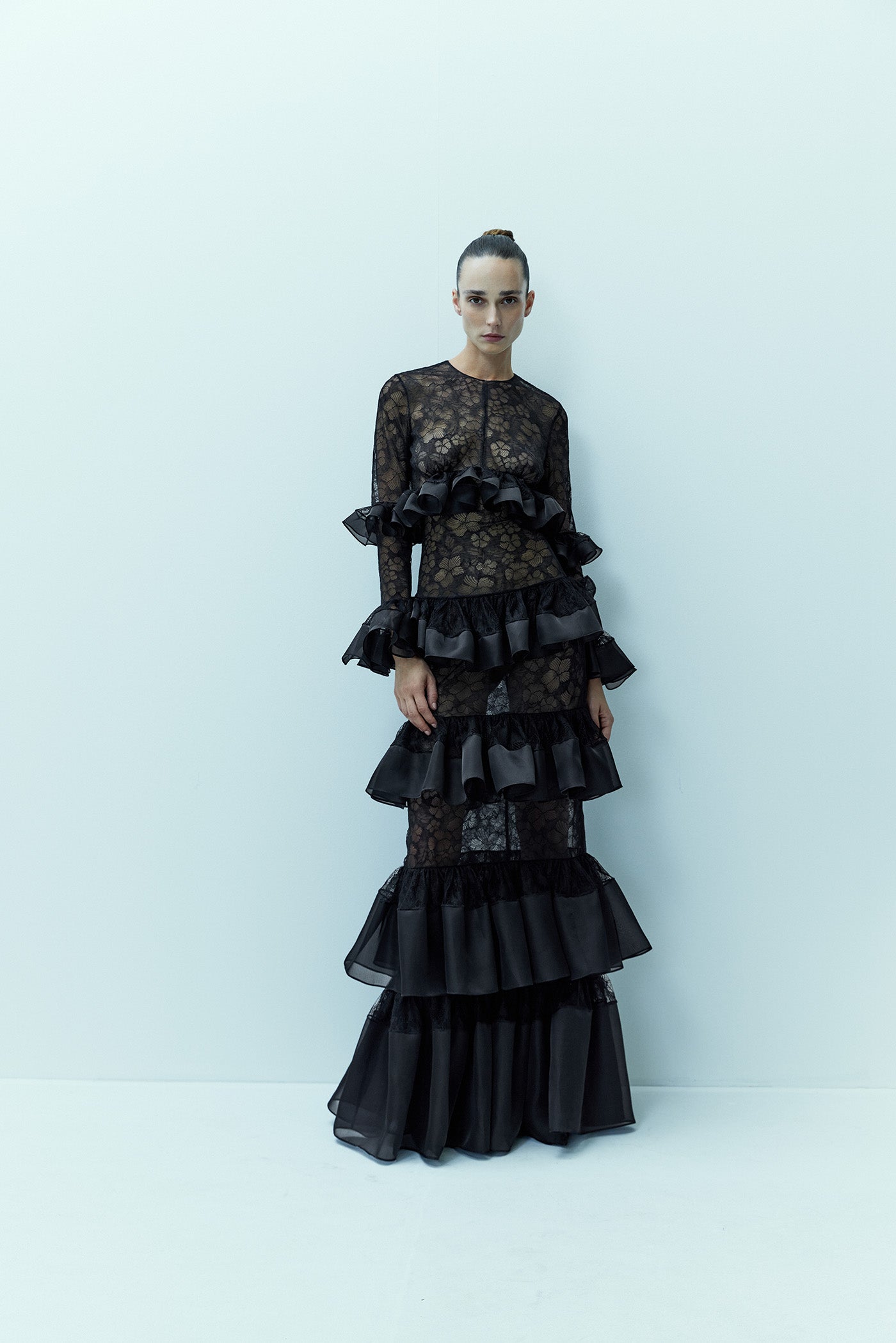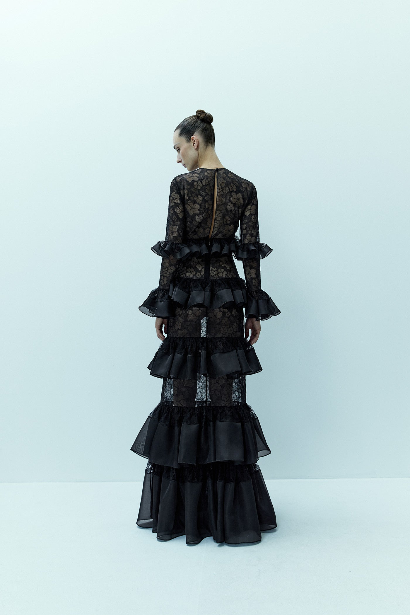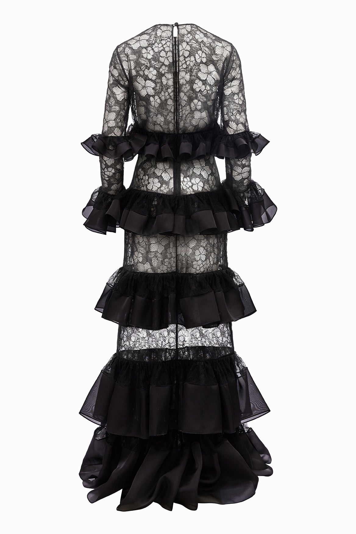 Indulgent in beauty, the figure-hugging, black floral lace gown THE SWAN is decked in a layering of sumptuous, individual, silk organza ruffles that decorate its long sleeves, down to the floor-skimming hem. Finished with a simple and chic round neck.