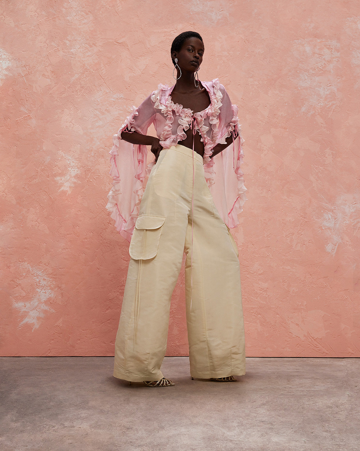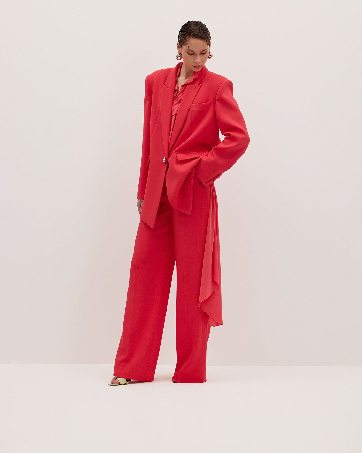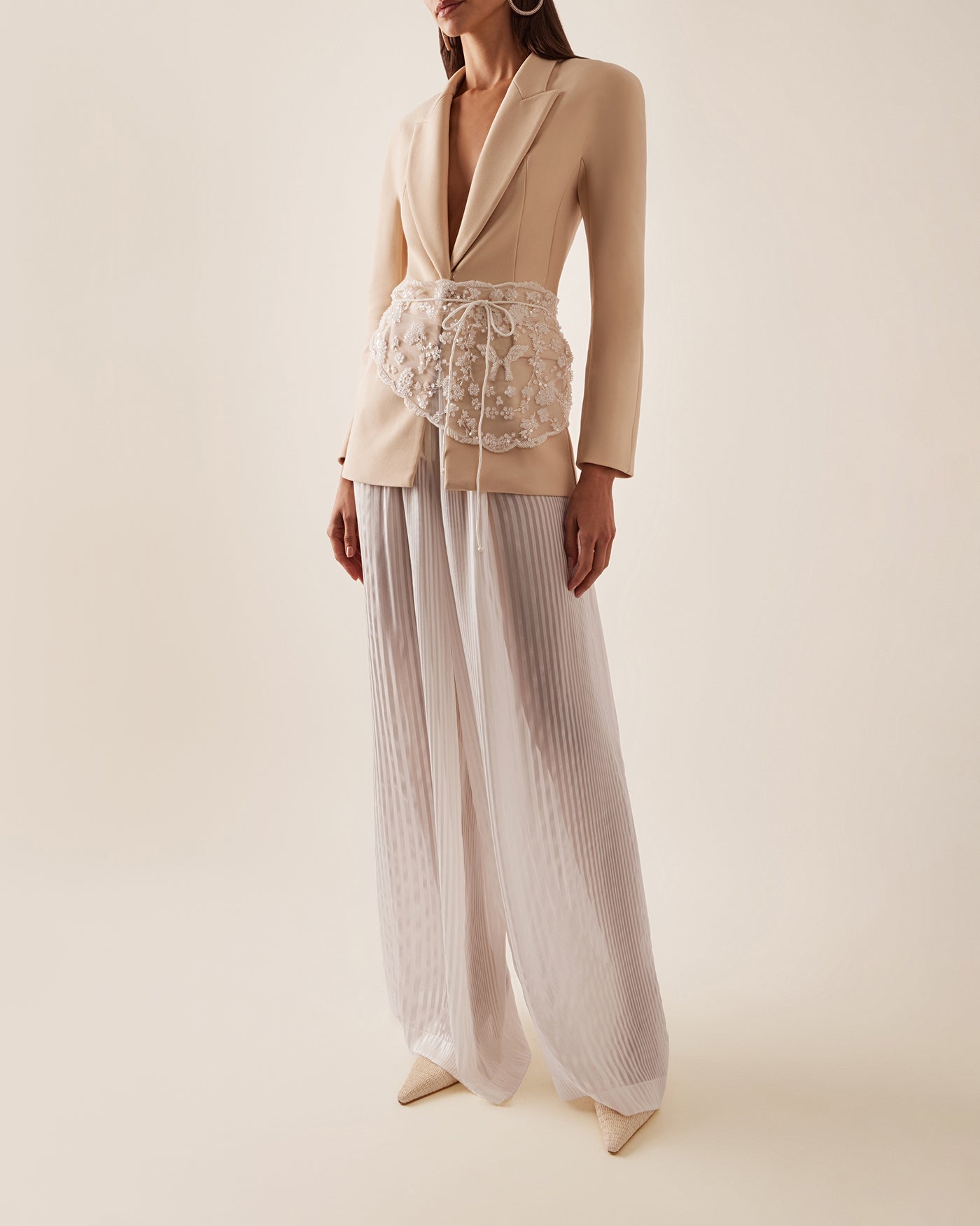 Jennifer Lopez arrives to a Q+A tied to her new musical drama, Kiss of the Spider Woman, wearing Maria suit and shirt from the Harithand La Métamorphose collection
