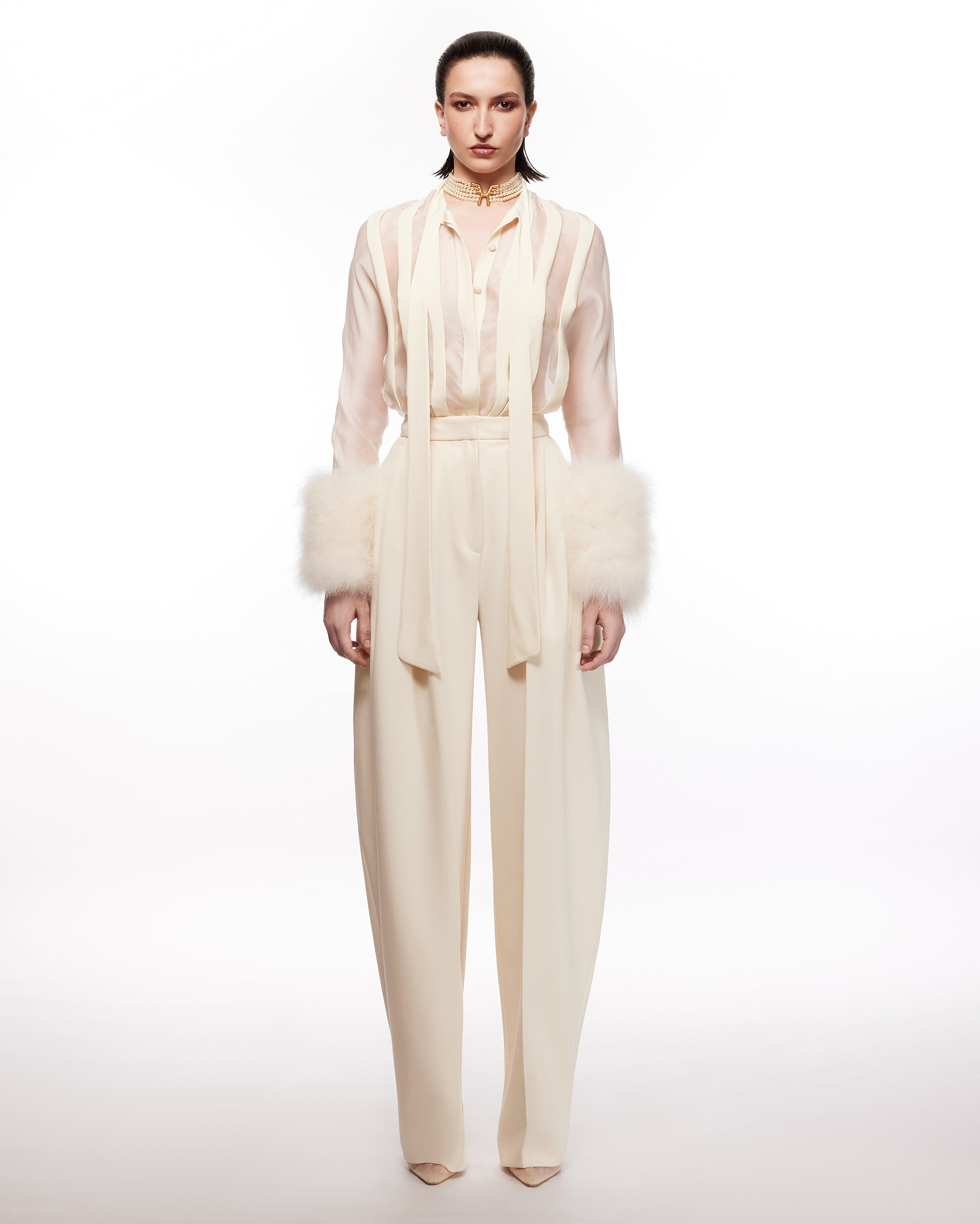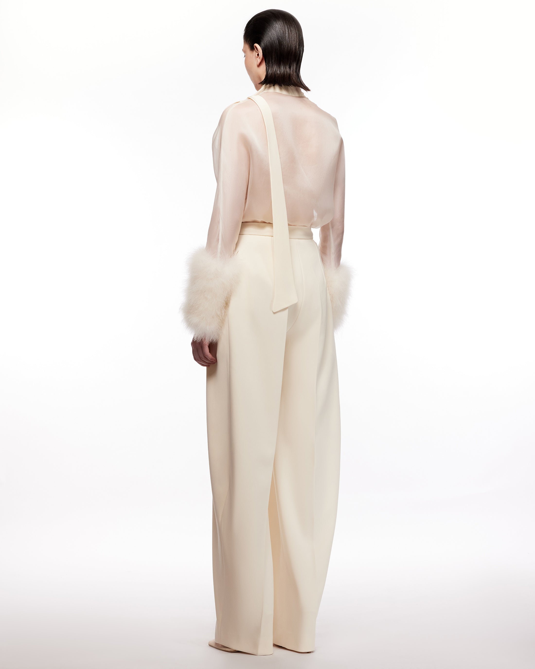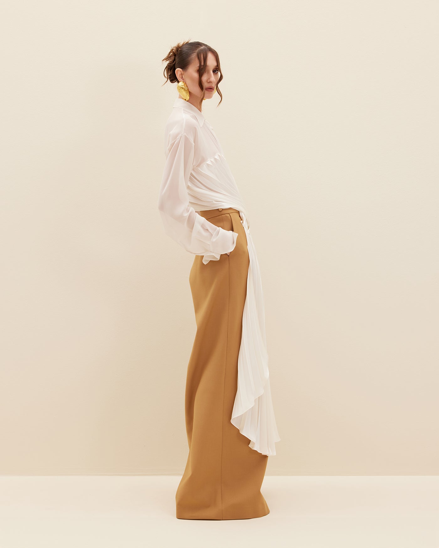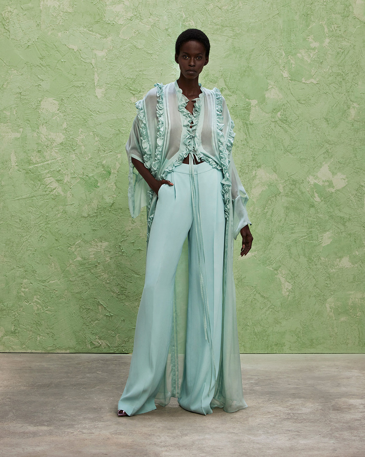 Jennifer Lopez arrives to a Q+A tied to her new musical drama, Kiss of the Spider Woman, wearing Maria suit and shirt from the Harithand La Métamorphose collection