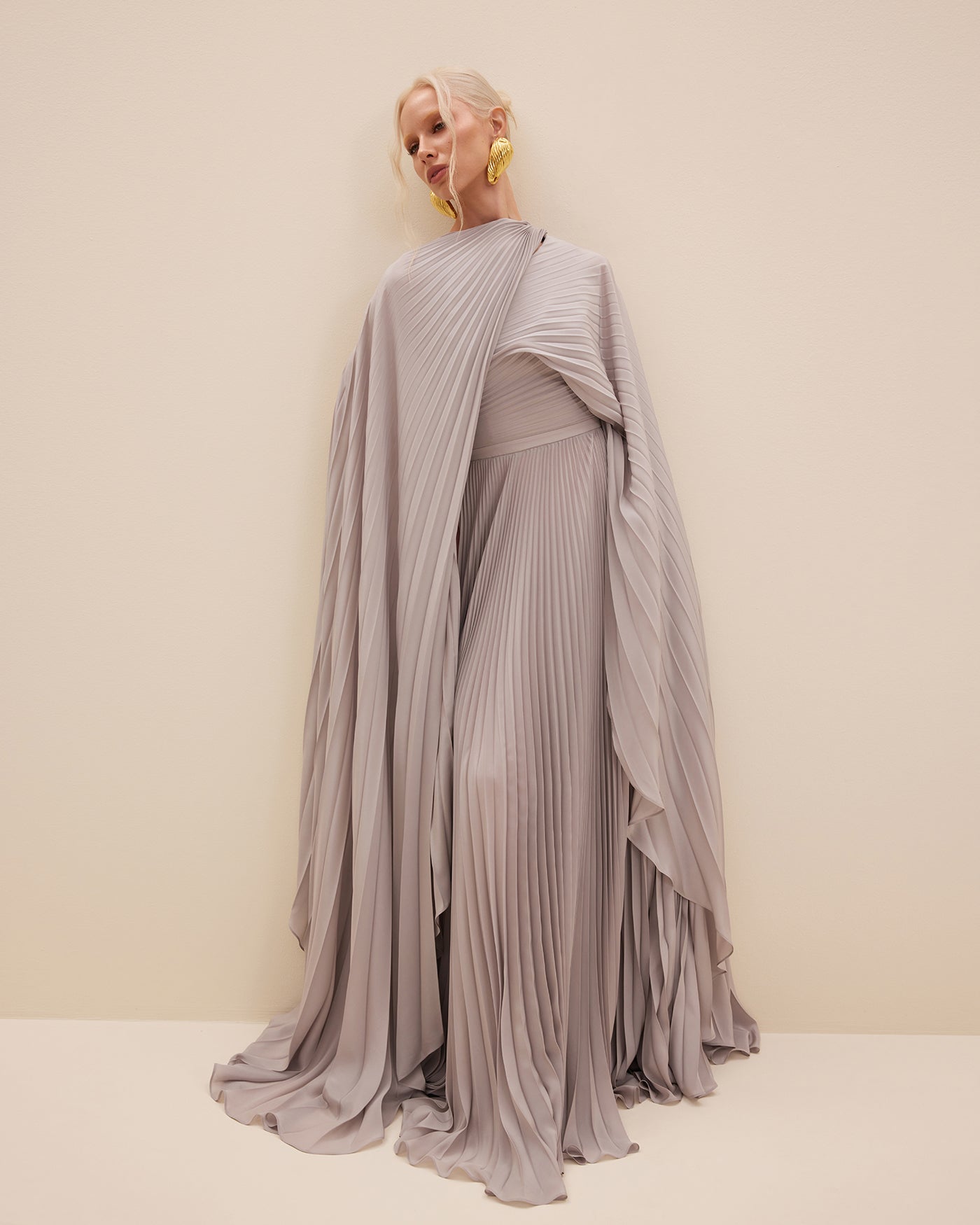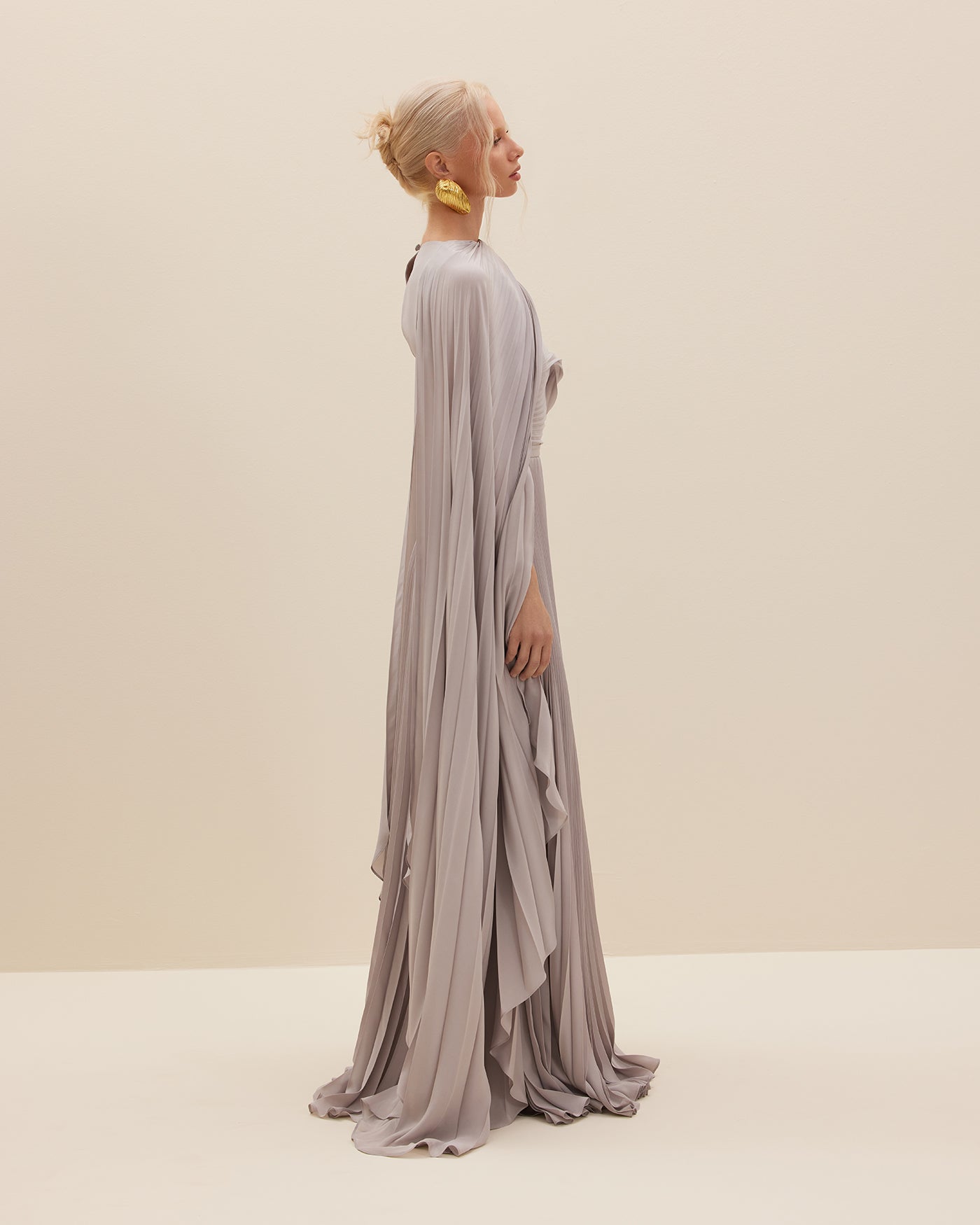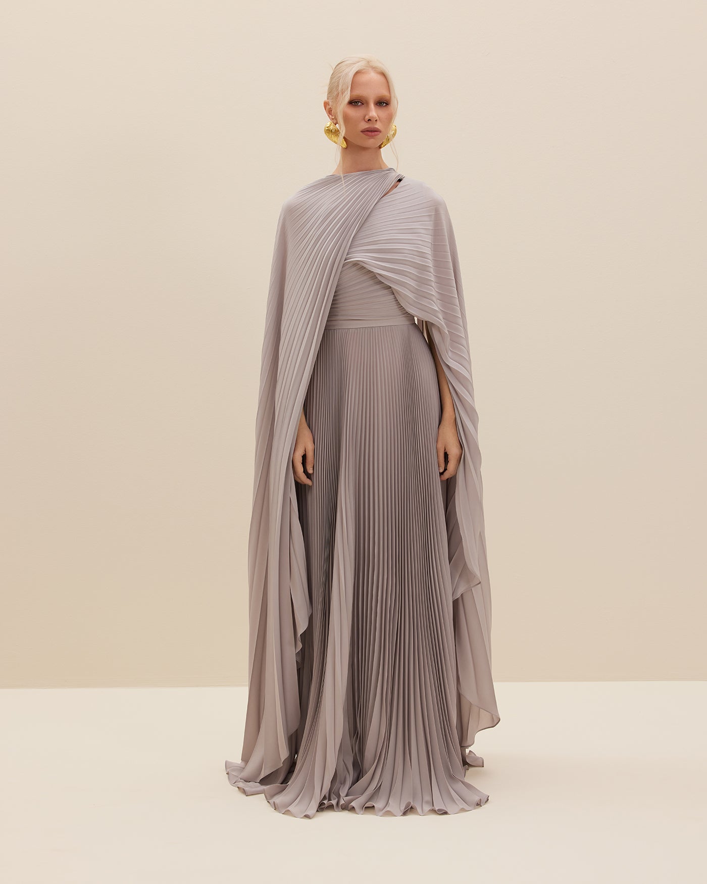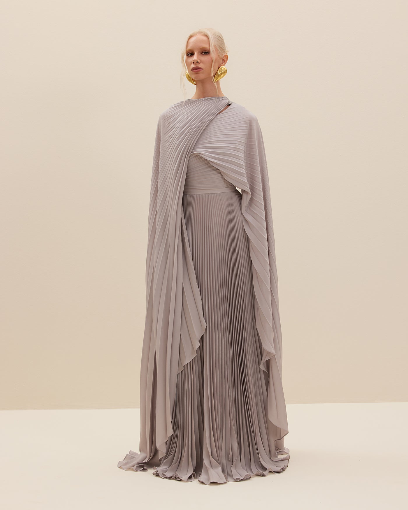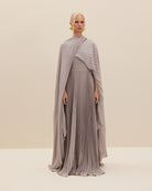 JUPITER is a celebration of feminine and fluid silhouettes. Cut from silk crepe de chine plissé, this pleated grey maxi dress boasts a flowing silhouette styled with a built-in lengthy cape.