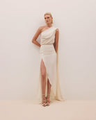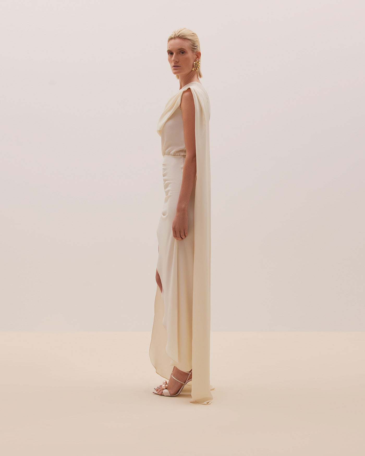 NEW DELHI is a maxi dress constructed from crepe de chine silk in an off-white hue. This asymmetrical silhouette is adorned by a long sari scarf that drapes at the back and is finished with a pleated, split hem.