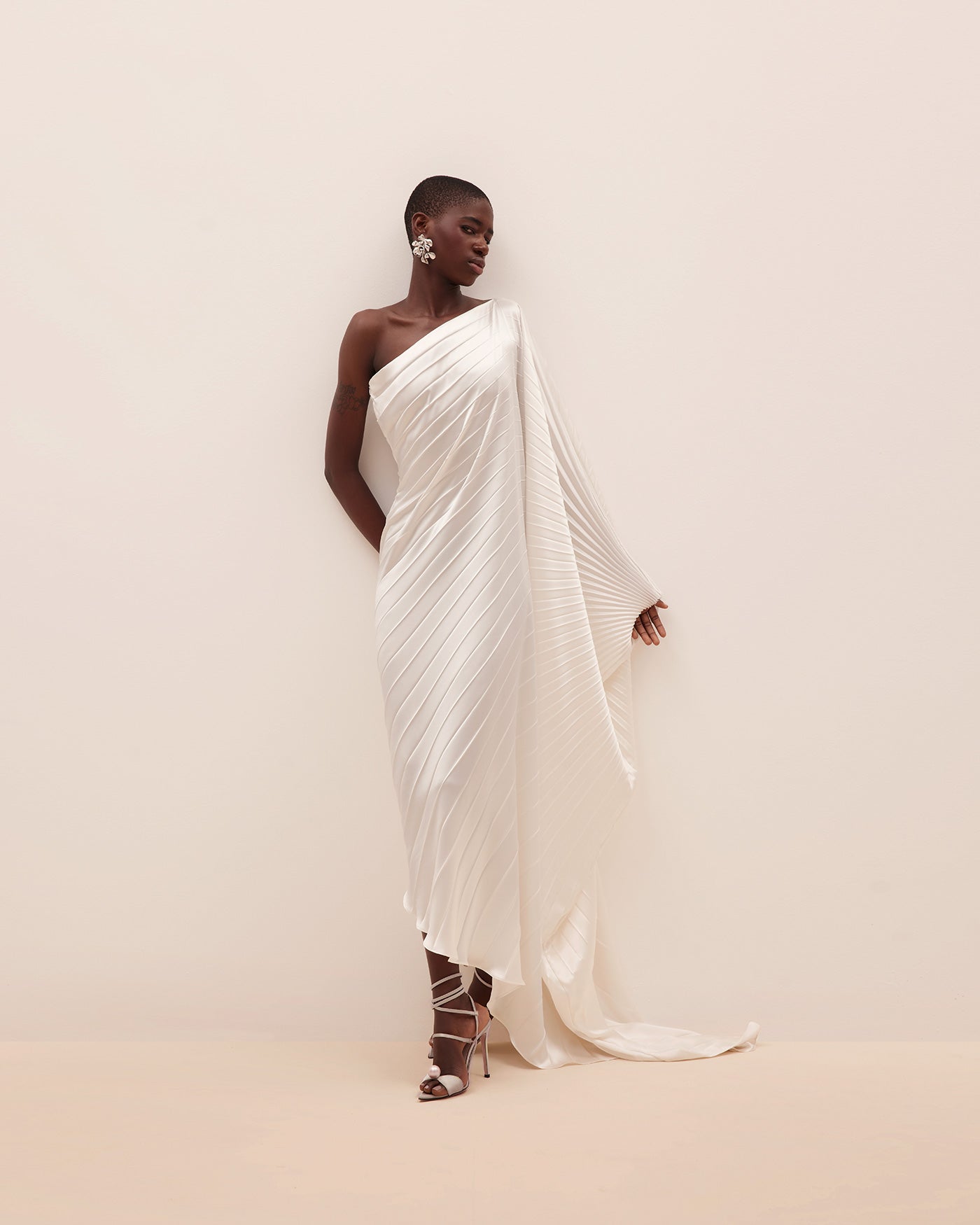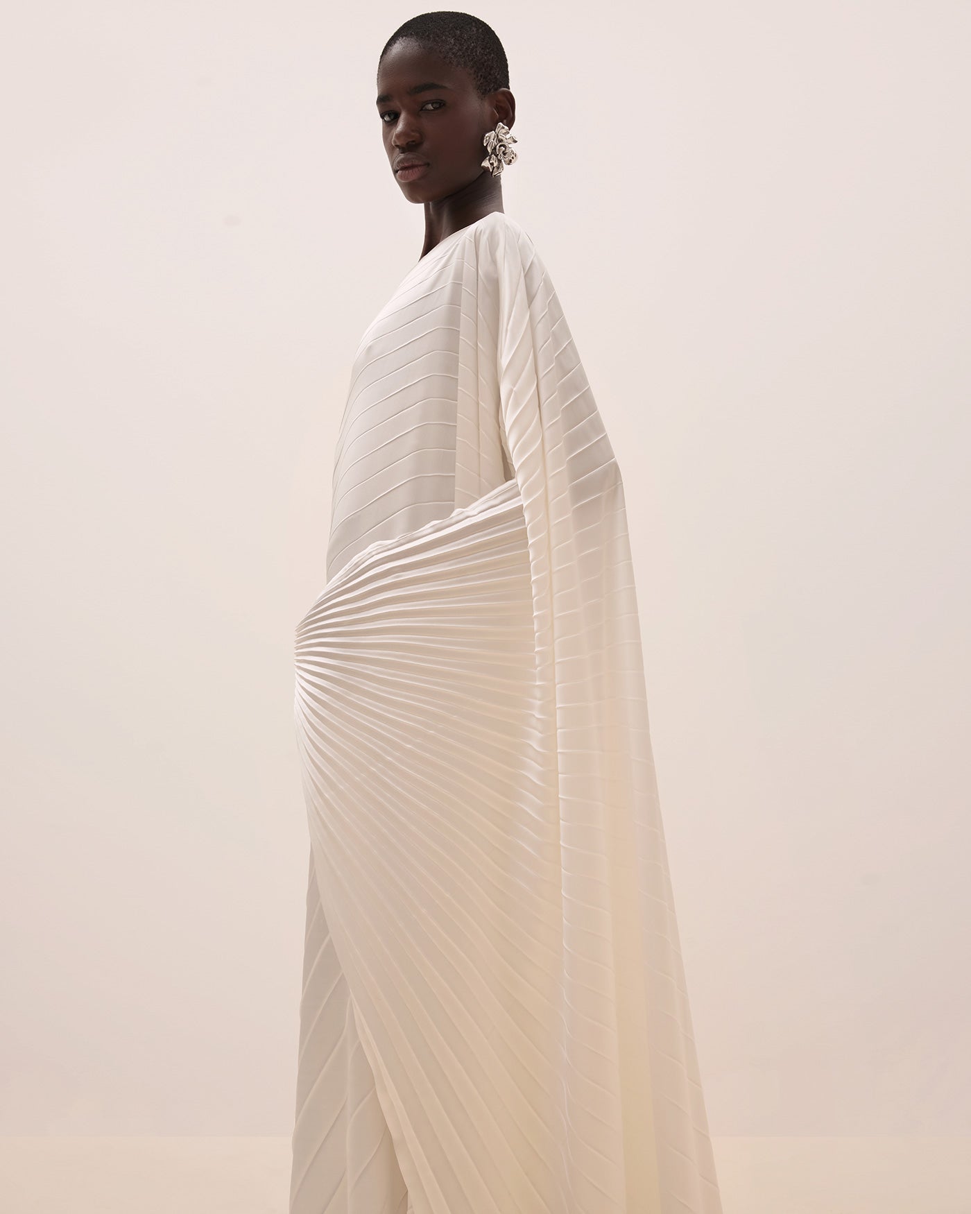 The RHEA kaftan is crafted from off-white silk satin plissé, generously pleated by hand. Cut for a relaxed fit, the dress is suspended from a one-shoulder neckline with a full sleeve and falls to an undulating high-low hem.