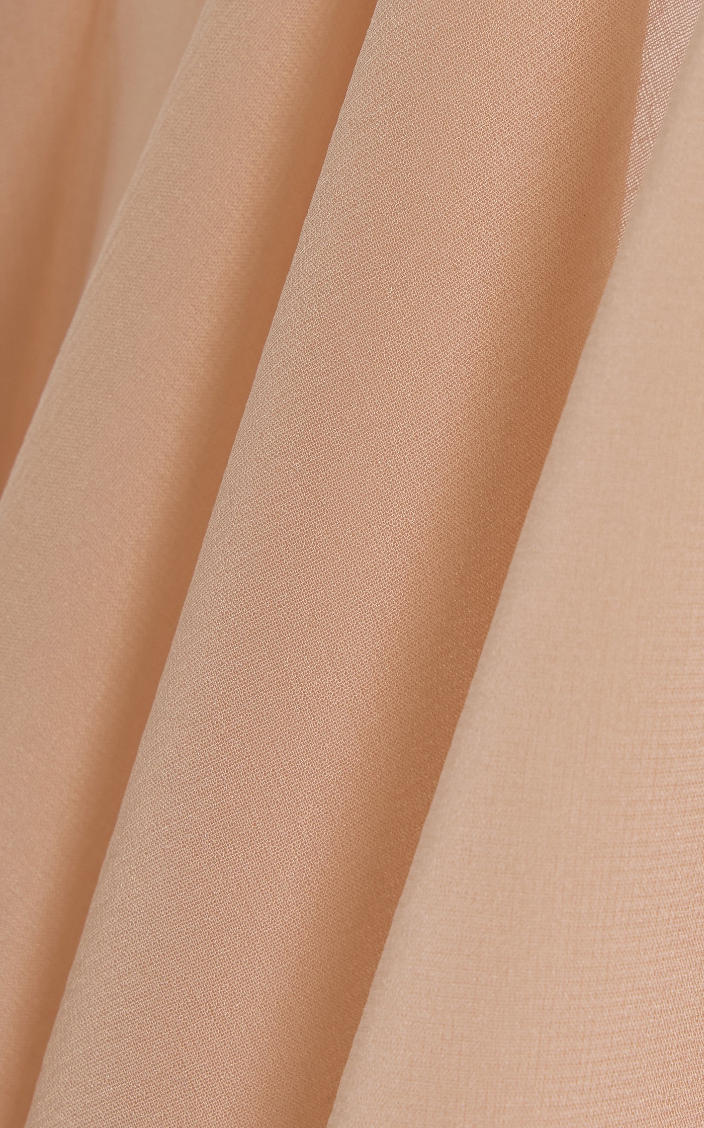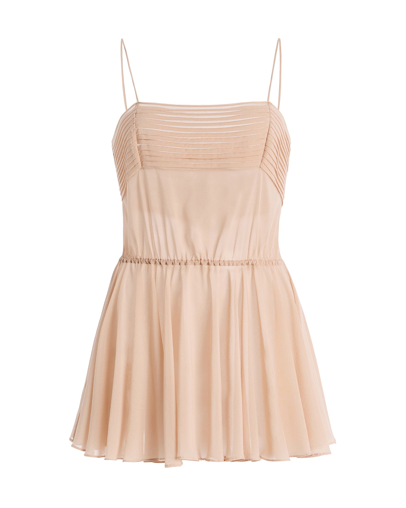 Nude silk crepe georgette falls in sculpted softness. The top traces the body with a horizontally pintucked bodice and fine straps, fastening with covered buttons before loosening into a flared hem. Paired with balloon pants cut wide and fluid, the silhouette holds discipline above, release below.