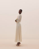 CHARLOTTE features everyday staples eased with a flowy fit. Made from off-white mousseline with green undertones, the shirt offers full coverage with a classic button tab and gently puffed sleeves. Completing the look is a skirt that grazes the ankles in soft, undulating pleats.