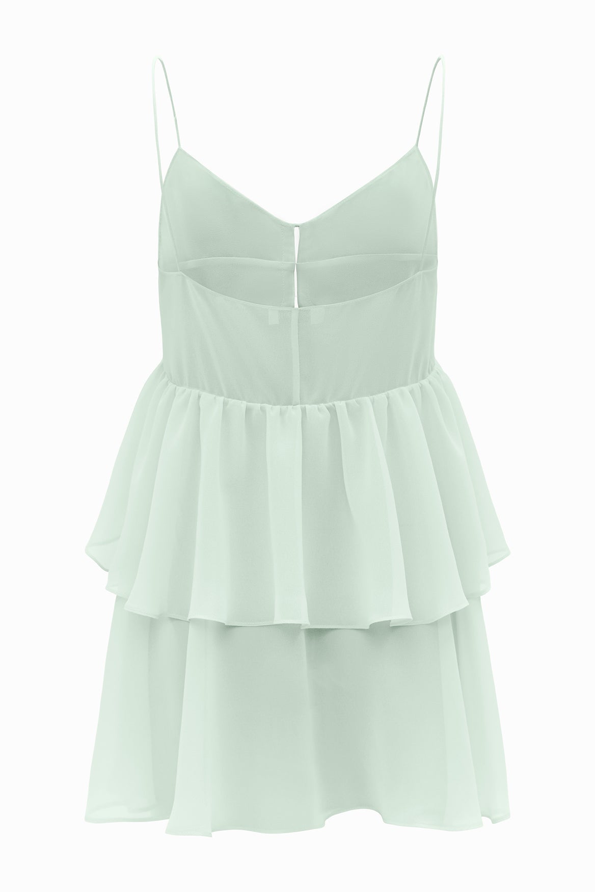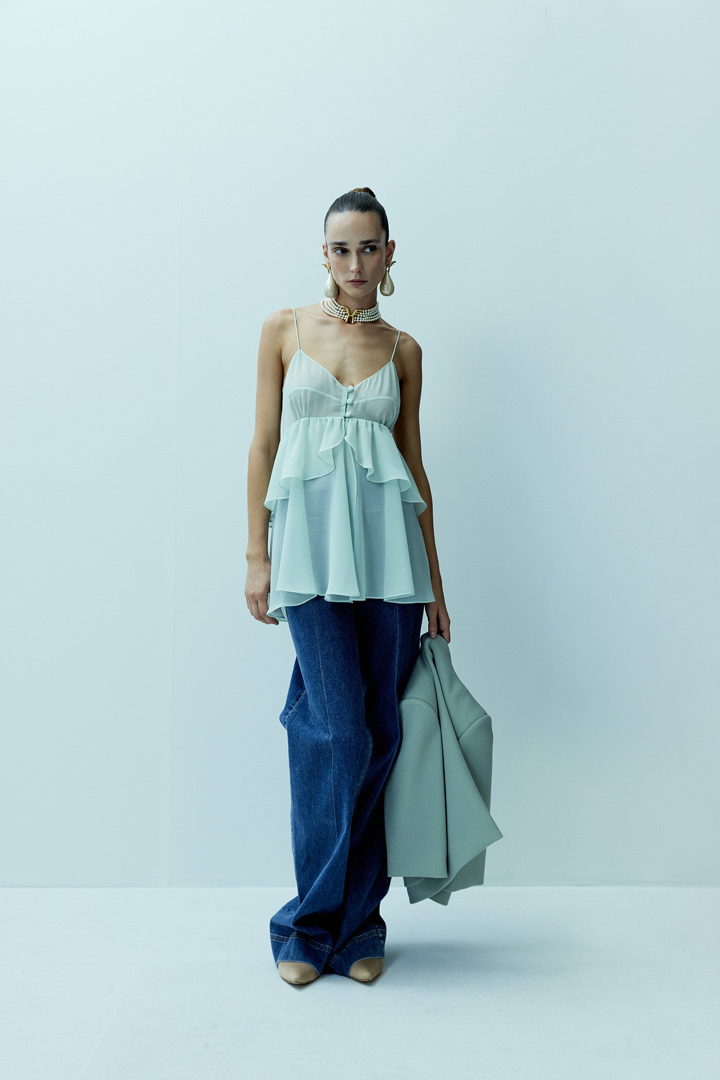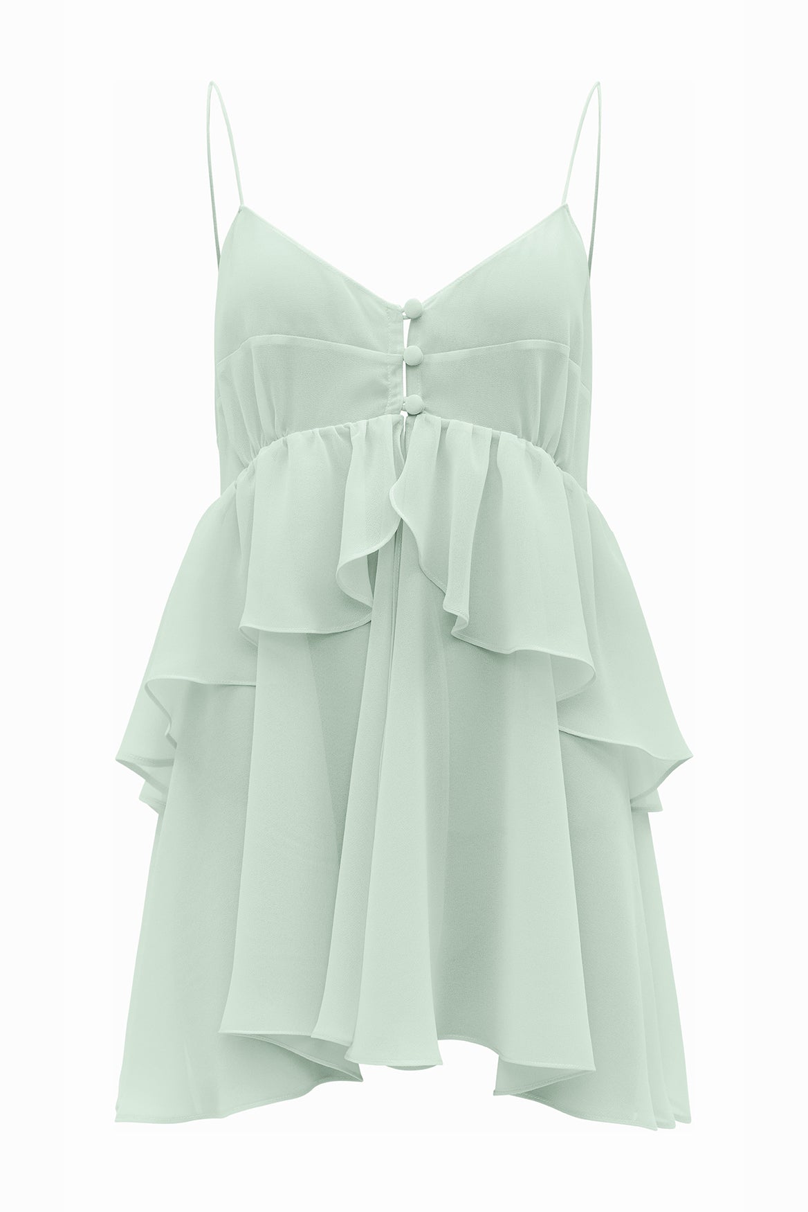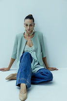 The coordinating set LUCIA exemplifies daywear with enduring allure. The 1/2 sleeve, double crêpe, day jacket features two front pockets and is matched with an ultra feminine, button front, flounce slip top in tonal sage green.